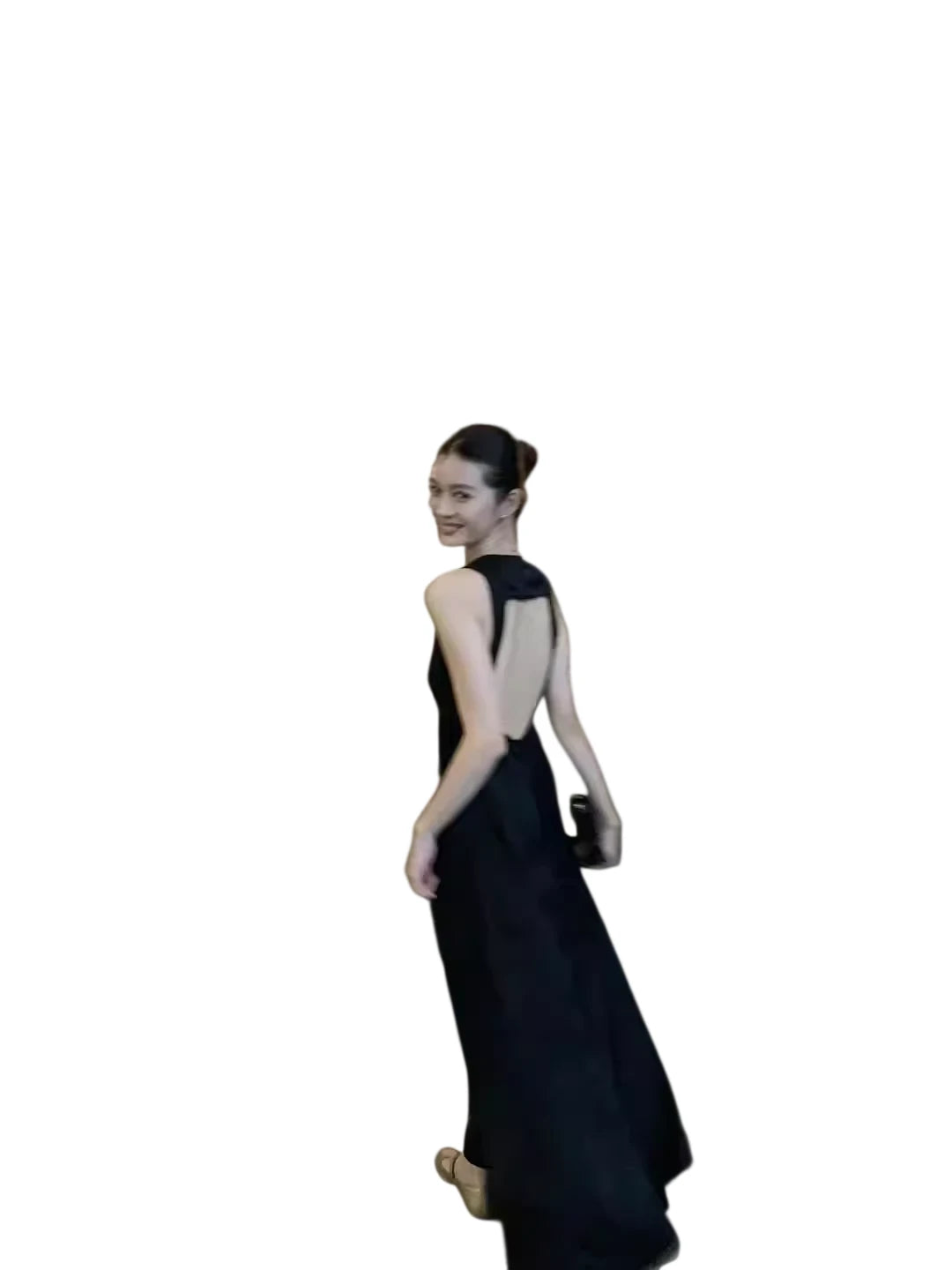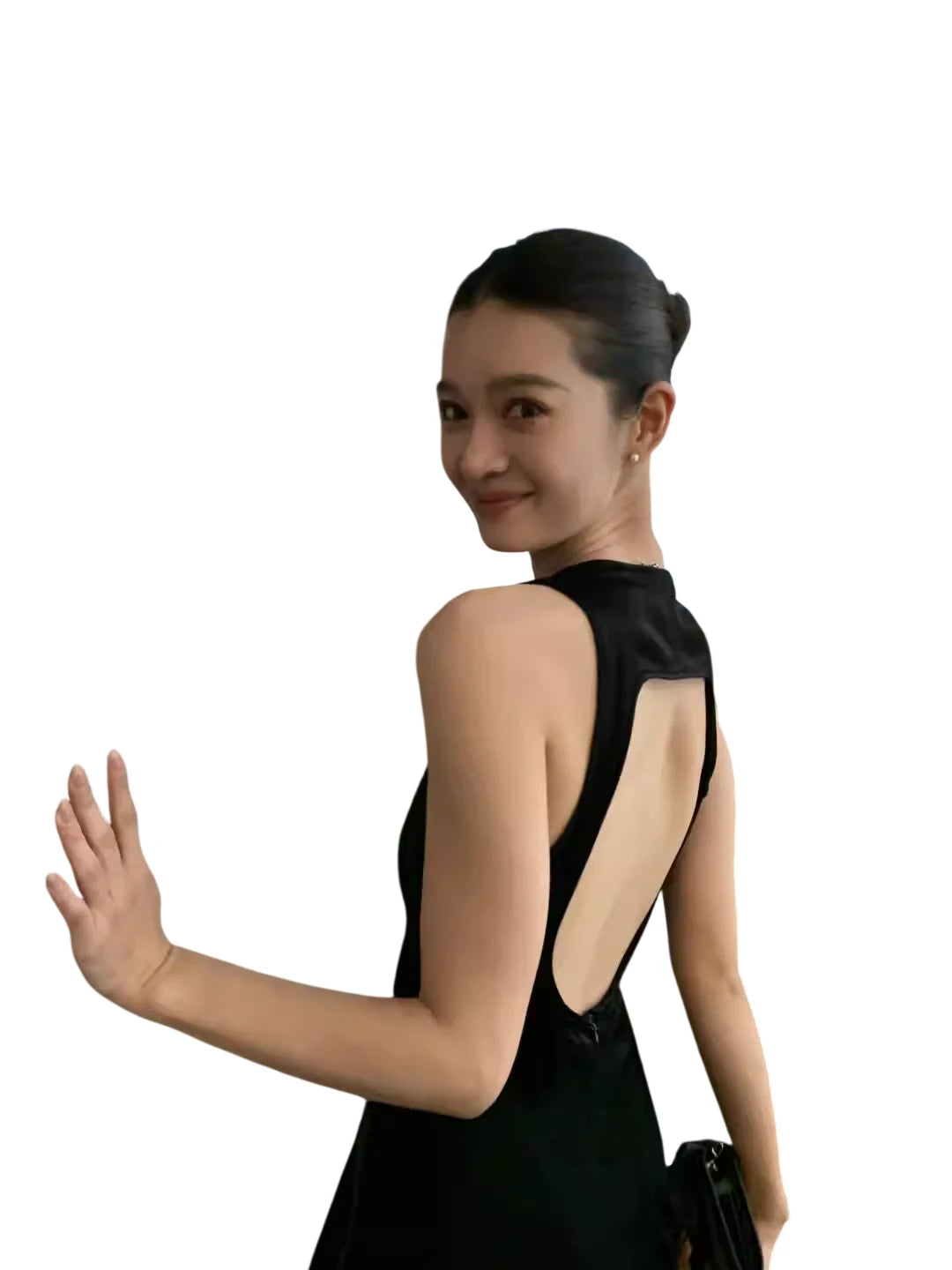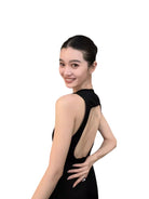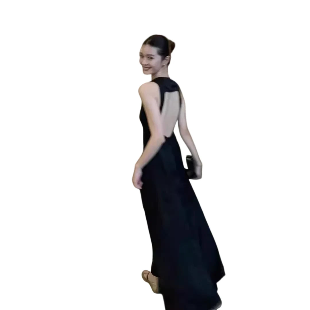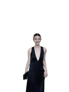 Make a striking entrance in this elegant black evening gown, designed with a deep V neckline and wide shoulder straps. Featuring a dramatic cutout backless design, this floor-length dress flows gracefully with every step, perfect for parties, birthdays, or formal toasts. Its sleek silhouette and minimalist styling make it a sophisticated choice for women seeking timeless glamour.