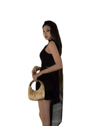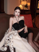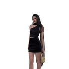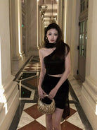 This elegant black mini dress is designed for women and features a contemporary one-shoulder silhouette. It showcases an asymmetrical neckline complemented by a long flowing ribbon draped from the neck, adding a graceful and stylish element. A sheer panel at the waist creates a subtle cut-out effect, enhancing the dress’s modern allure. Crafted in a rich satin or velvet-like fabric, the dress offers a luxurious sheen and texture. Perfect for sophisticated evening occasions, this look is completed with a contrast gold handbag for an added touch of glamour.
