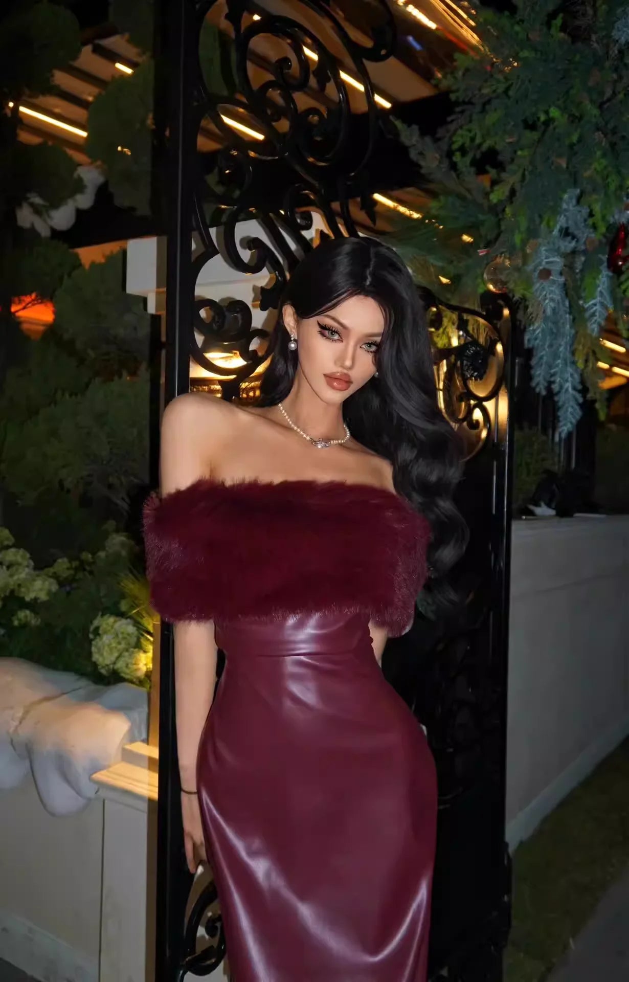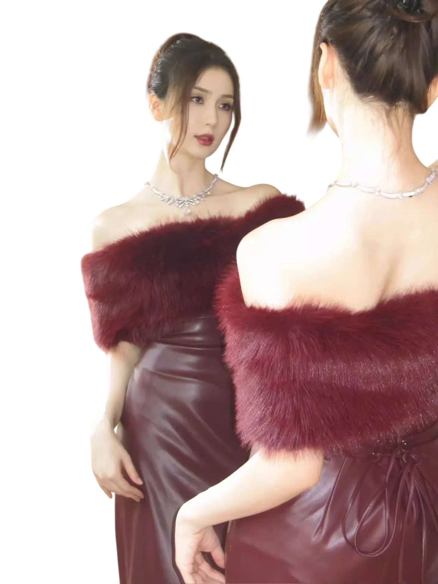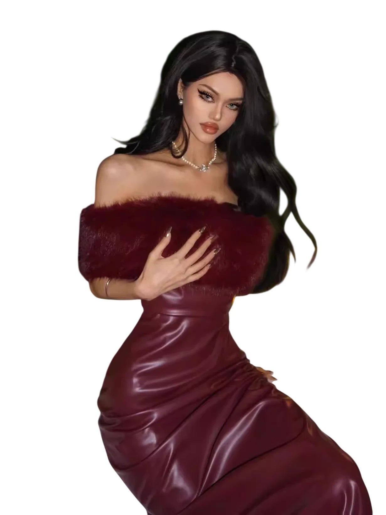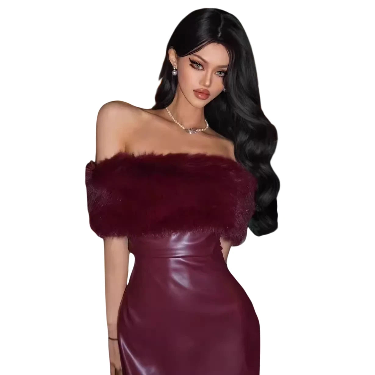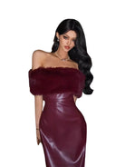 Make a bold statement with this sophisticated burgundy mini dress, designed with a strapless silhouette and crafted from a glossy leather-like fabric. The detachable faux fur collar adds a touch of glamour and warmth, making it a versatile choice for festive occasions like New Year, birthdays, and spring celebrations.