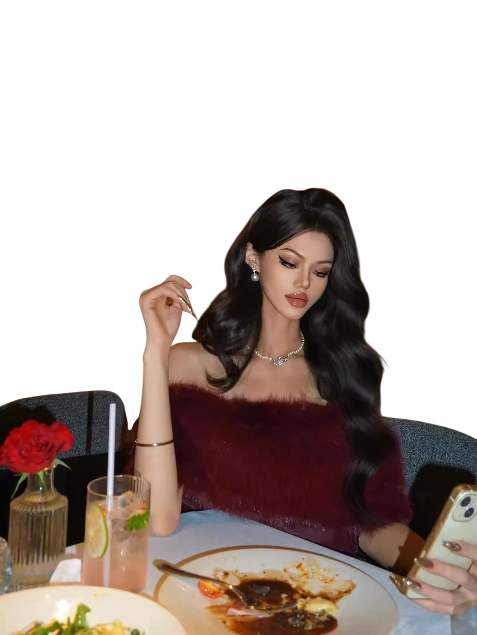 Inspired by the same style worn by Janice Man, this dress features a form-fitting design that enhances the feminine figure. The upper fur-like bodice wraps elegantly around the shoulders, offering a luxurious accent to the sleek structure below.