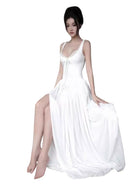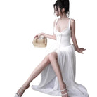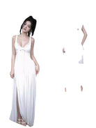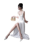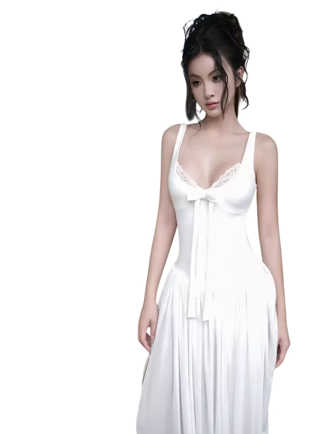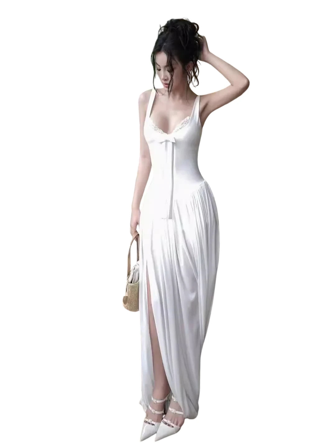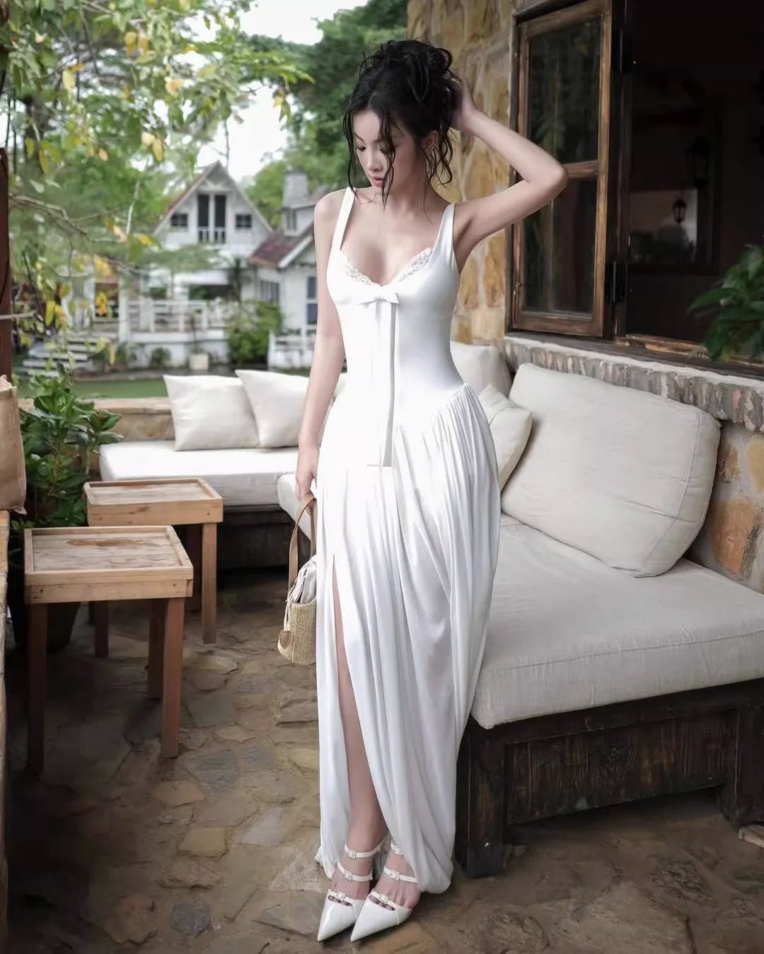 Embrace effortless elegance with this sleeveless camisole dress designed for women. Featuring a delicate lace collar and a charming bow at the bust, this dress combines feminine details with modern style. The fitted bodice flows into a soft, ruffled skirt that opens into a high slit tulip hem, offering both comfort and allure. Perfect for warm-weather outings, it's a versatile piece that radiates sophistication and grace.