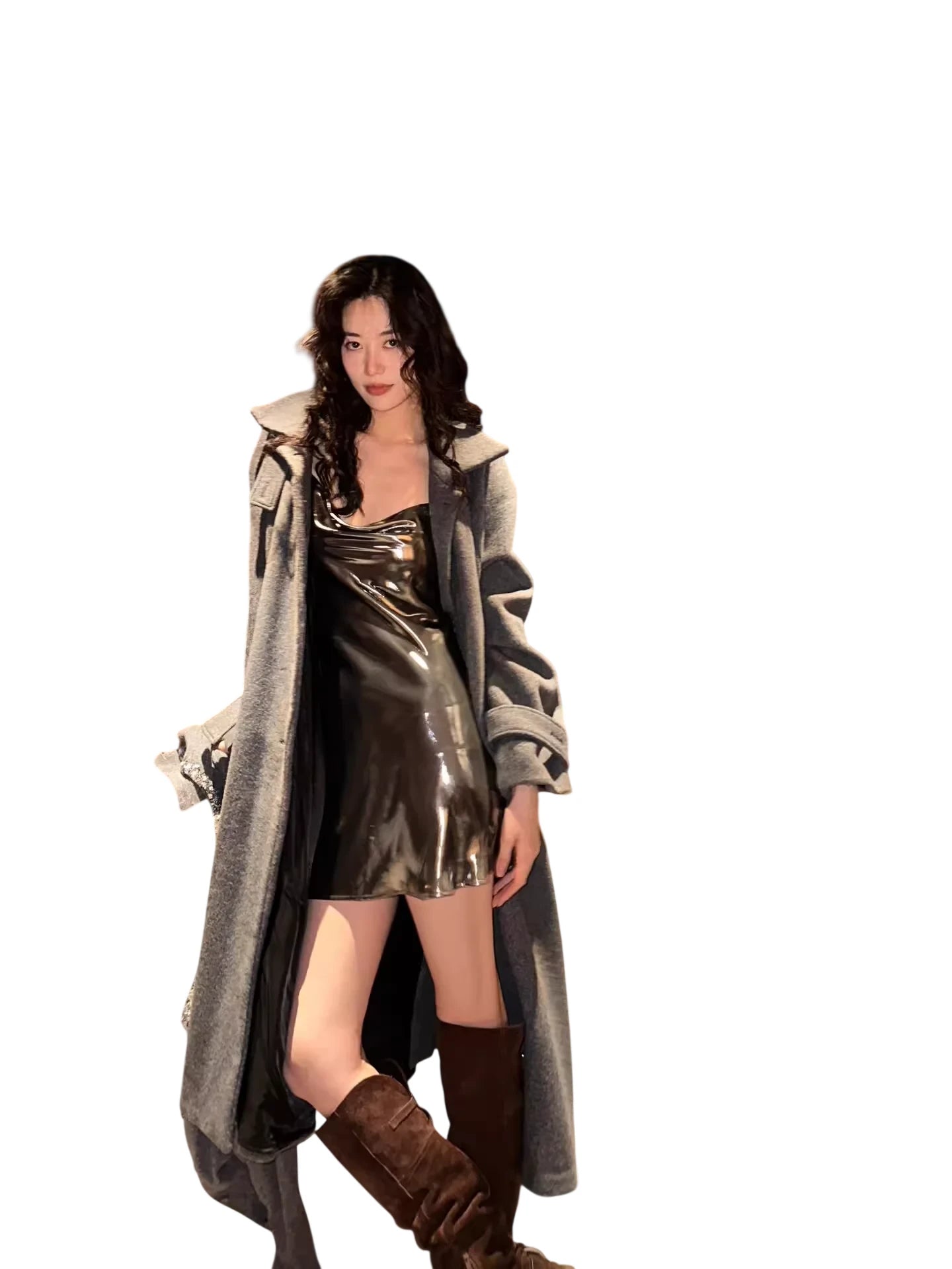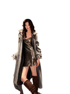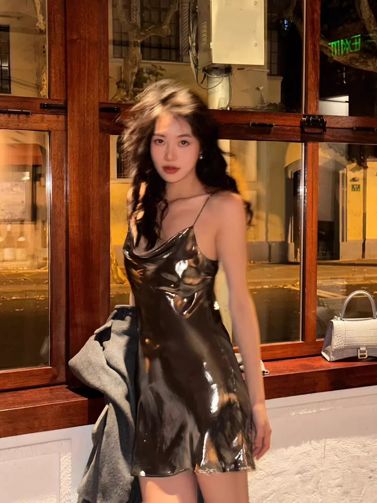 Turn heads with this sleek and sexy women's mini dress featuring a glossy black metallic finish. Designed with a flattering cowl neckline and thin spaghetti straps, this body-hugging dress reflects light beautifully, making it the perfect choice for parties or nights out. Its short, figure-accentuating silhouette embodies bold street style and modern elegance.