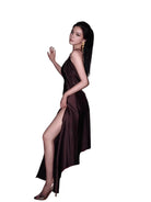 Elevate your evening look with this luxurious one-shoulder satin gown, designed for a bold and sophisticated statement. Crafted in a rich dark brown hue, the dress features a striking ruched ring detail at the strap connection and an alluring open back. A dramatic high slit on the right side adds glamour and movement, while the silky finish of the fabric enhances its elegant drape. Styled with statement gold earrings and metallic heels, this gown is the perfect choice for upscale occasions and formal events. Designed for women seeking polished and captivating style.