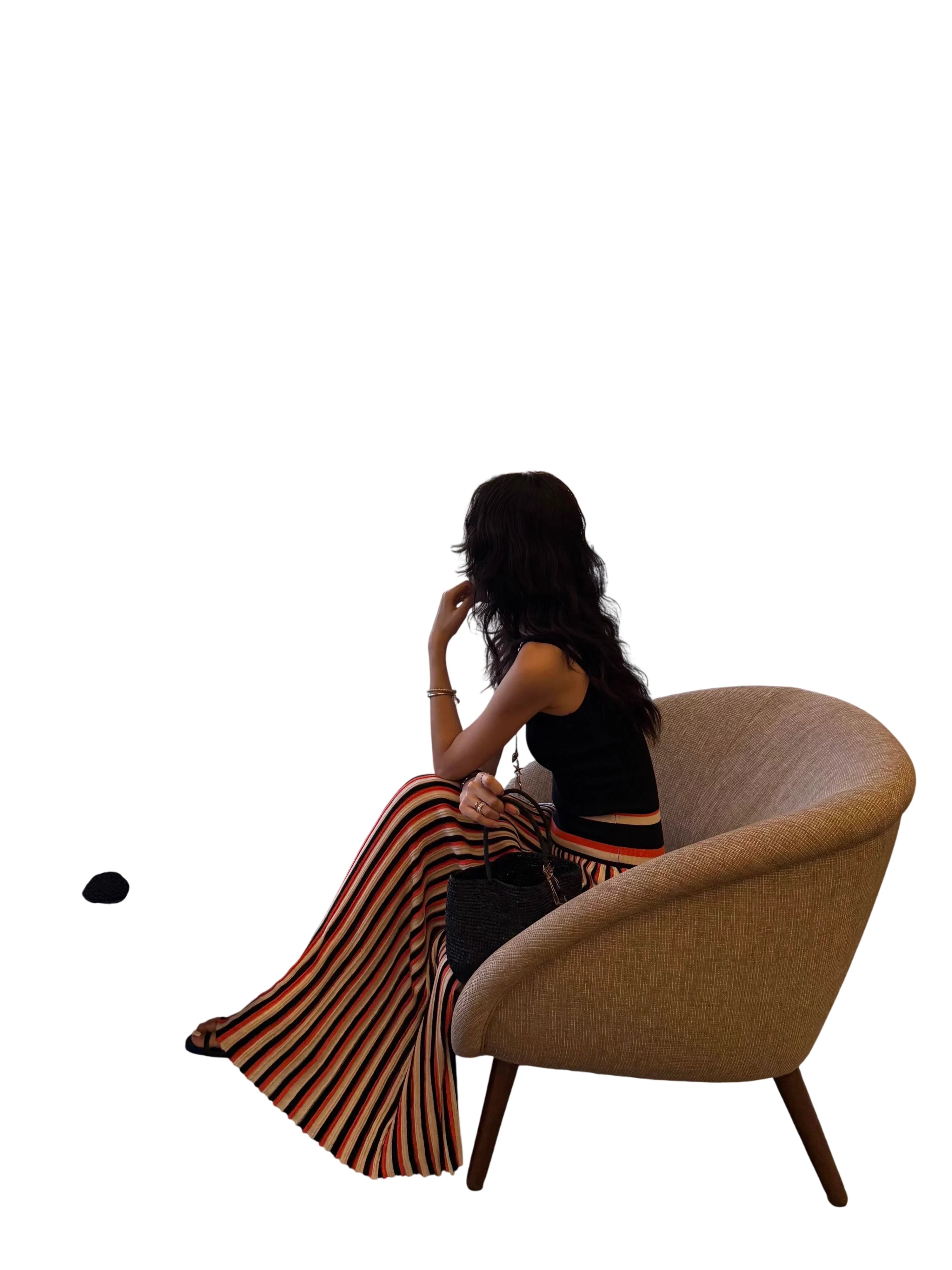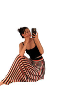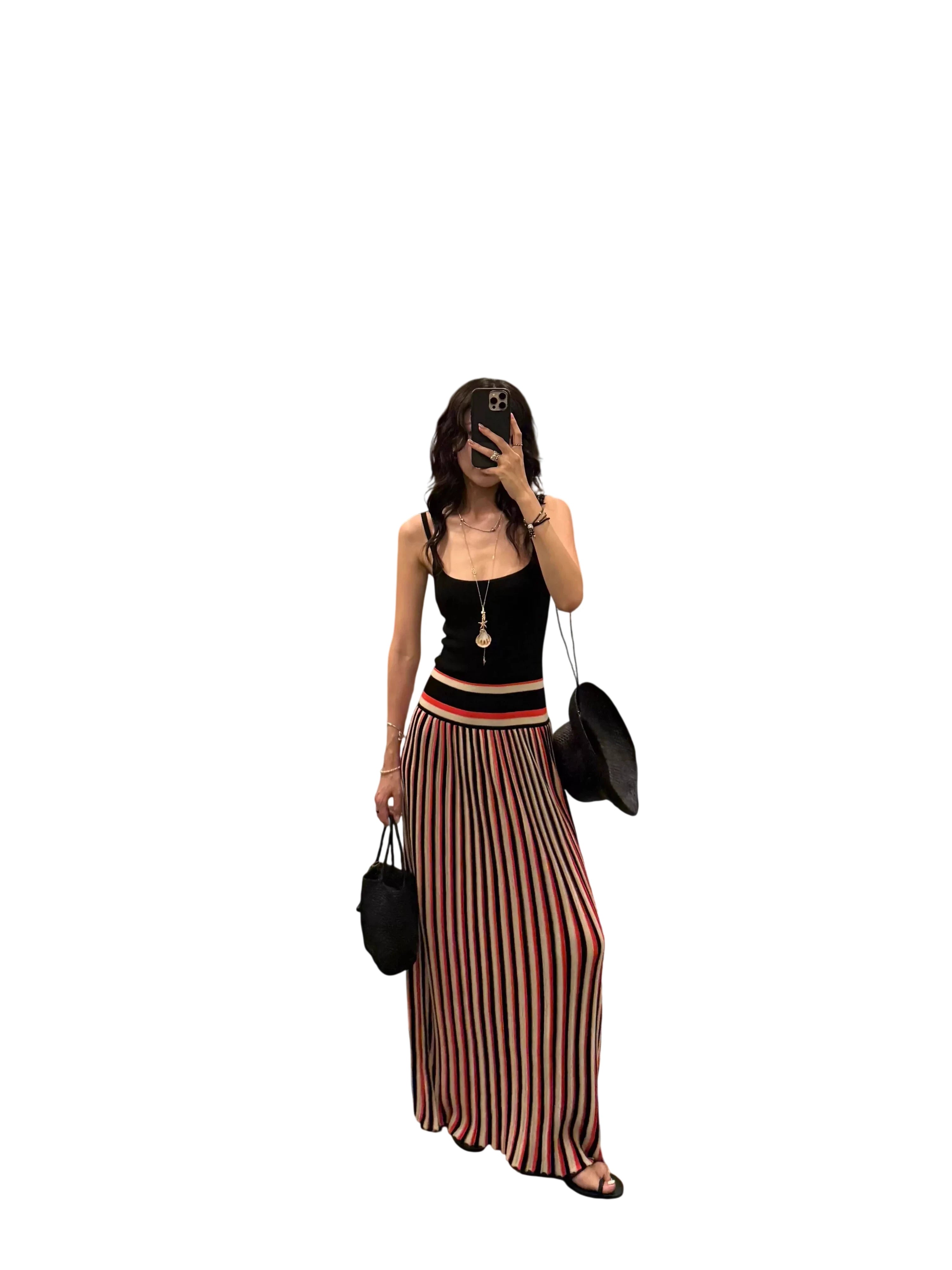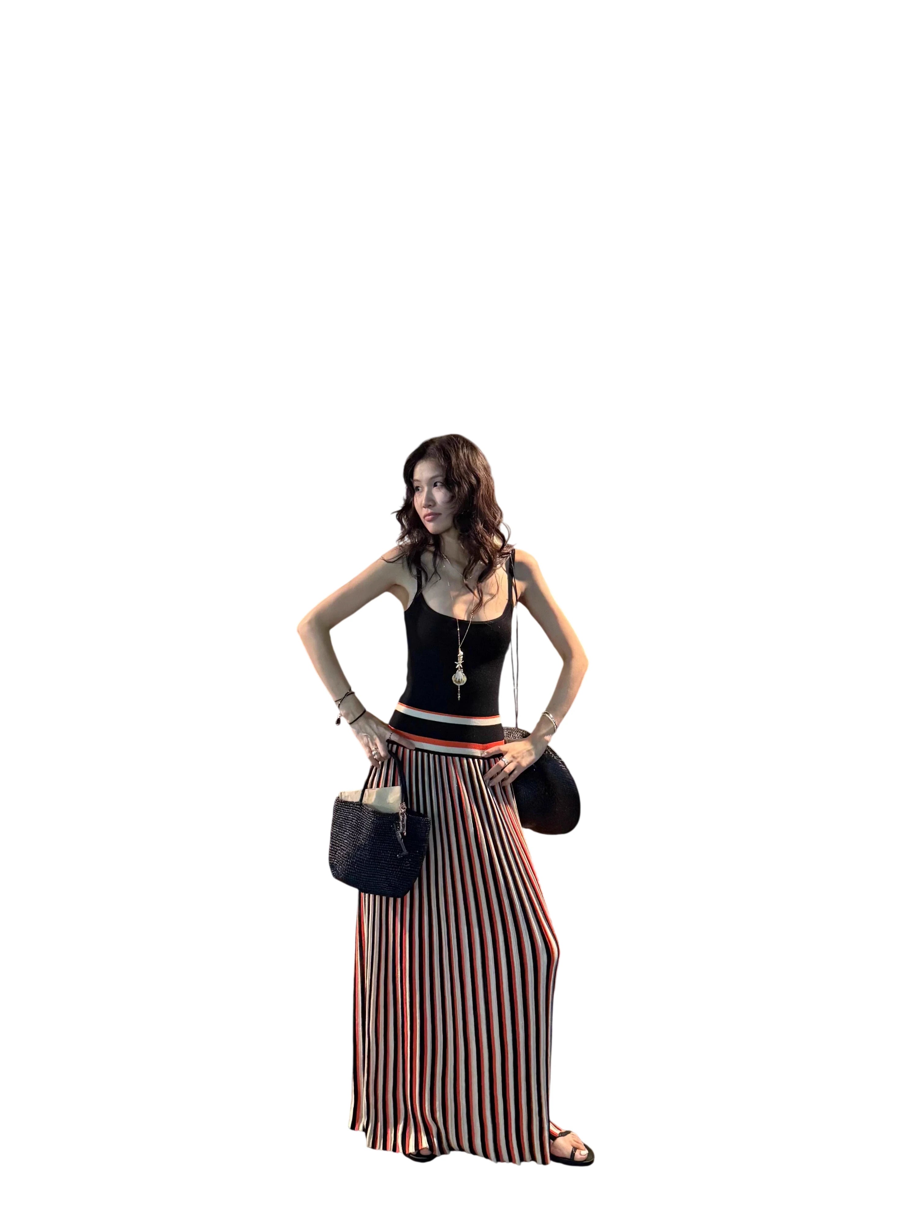 Elevate your summer wardrobe with this retro-inspired spaghetti strap maxi dress. Featuring a flattering colorblock design with vertical stripes in red, black, and beige, this dress drapes beautifully with a high-waisted pleated skirt. The fitted black top offers a sleek contrast, enhanced by sporty waistband detailing. Ideal for vacations, beach photo shoots, and stylish outings, this women's dress combines comfort with timeless fashion.