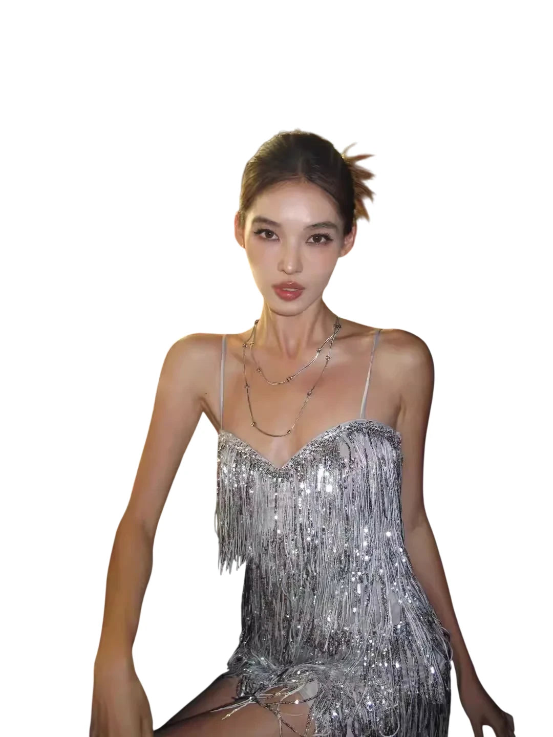 1S STUDIO Sequin Fringe Spaghetti Strap Mini Party Dress