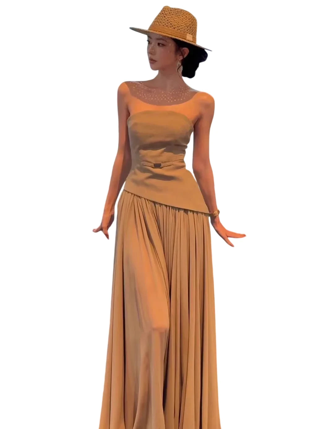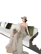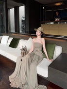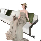 Elevate your evening style with this elegant strapless asymmetrical maxi dress in a timeless vintage green tone. Designed with a fitted bodice that cinches gracefully at the waist and flows into a voluminous floor-length skirt, this gown is perfect for formal occasions including parties, exhibitions, birthdays, and holidays. The soft, draping fabric adds movement and sophistication, while the strapless neckline creates a chic, feminine silhouette. Ideal for women seeking a refined and fashionable ensemble.
