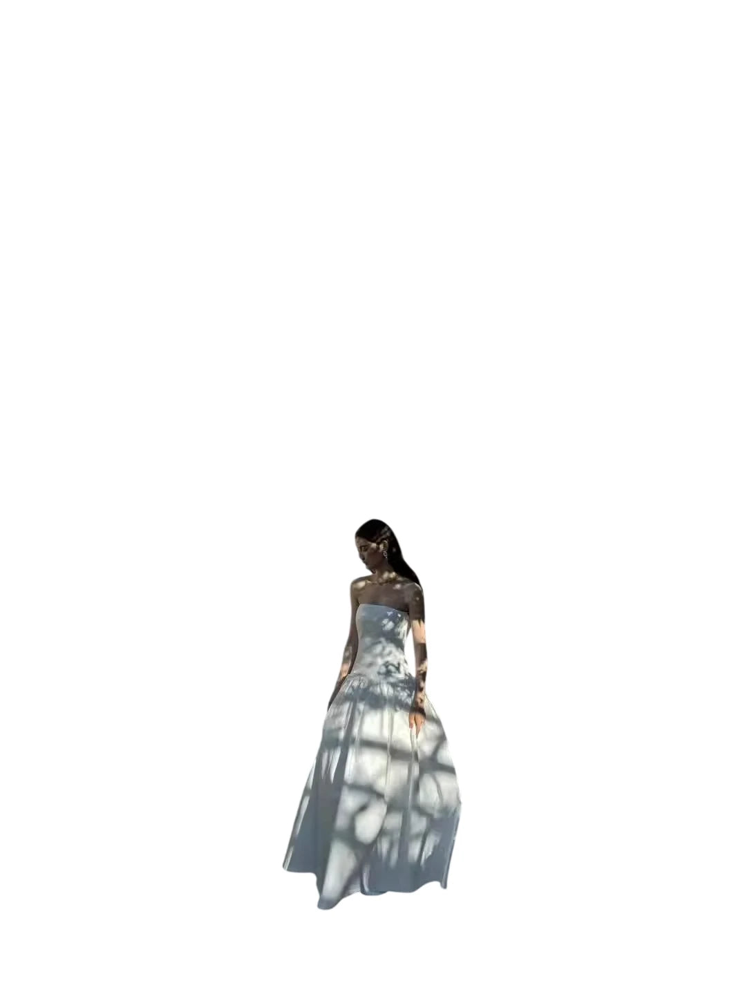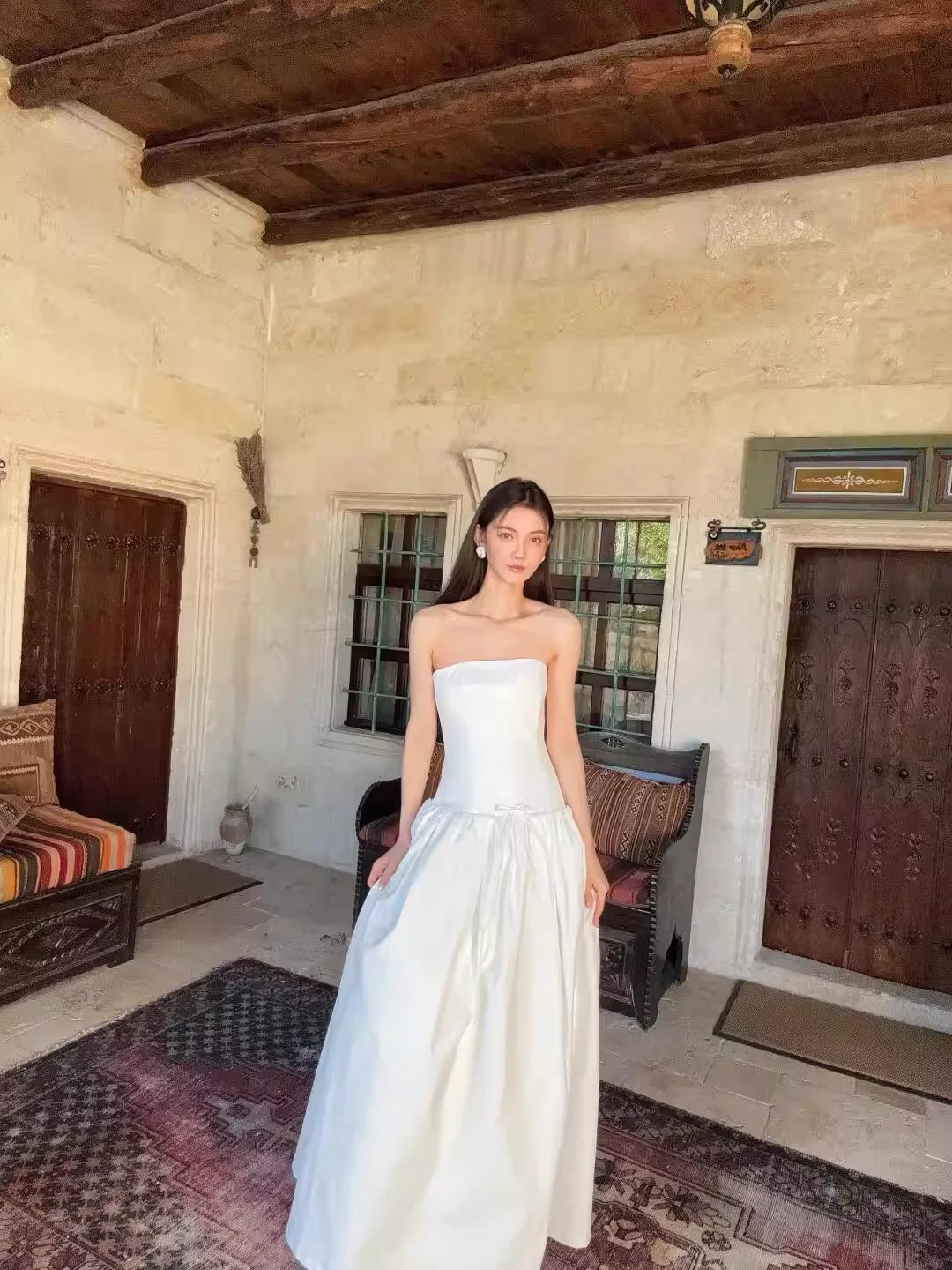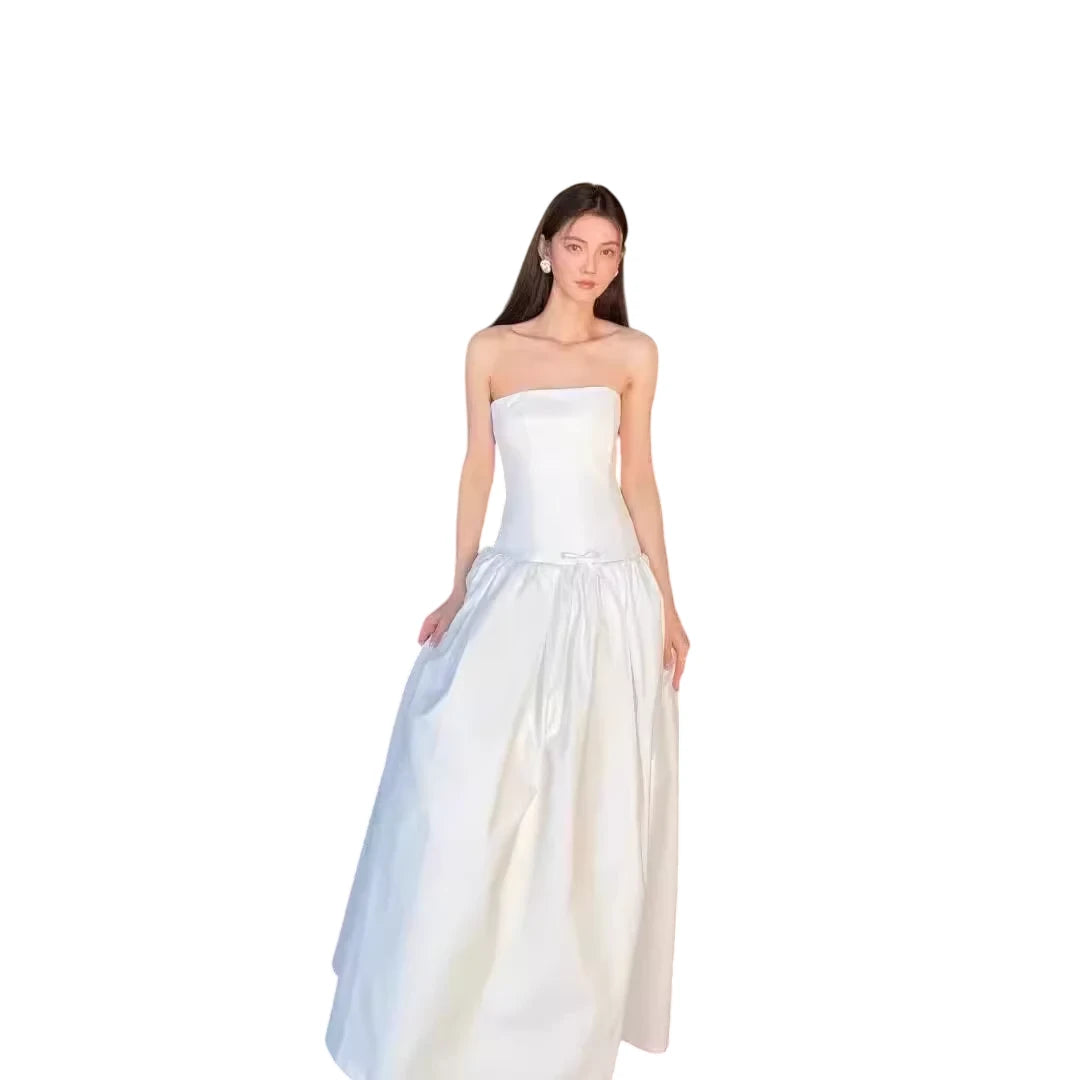 Embrace timeless elegance with this strapless maxi gown, perfect for special occasions and vacations. The dress features a fitted bodice complemented by a delicate bow at the waist, creating a flattering silhouette. A voluminous puff hem flows gracefully to the floor, adding a romantic and refined touch. Designed for women, this graceful gown merges classic style with modern simplicity for a standout look.