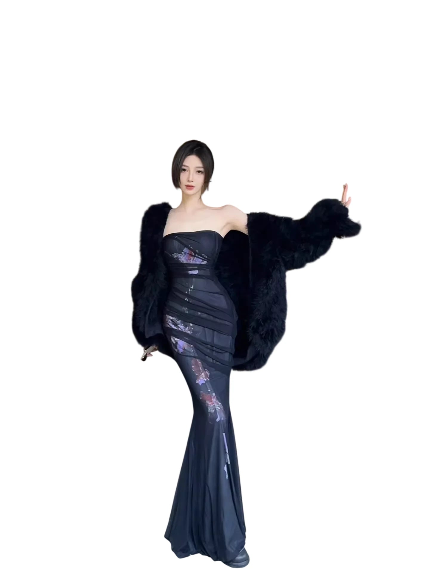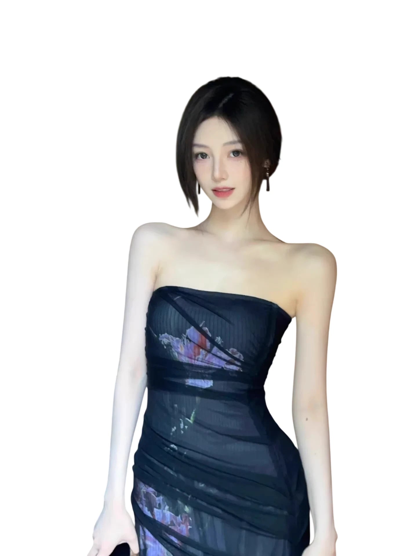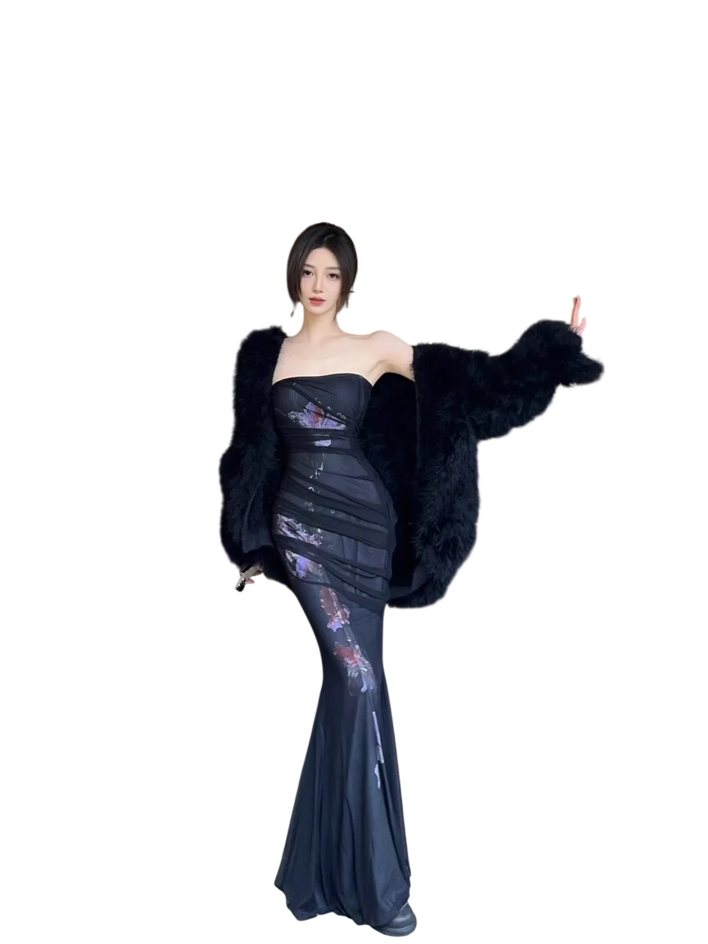 Make a statement at your next special occasion with this elegant strapless mermaid dress. Designed to accentuate the figure, it features layered stretch mesh fabric and subtle sheer paneling that adds visual intrigue. A vertical floral print enhances the feminine silhouette, while the slightly flared hem creates a graceful finish. Perfect for formal events, parties, or a stylish evening out, this dress is a chic addition to any wardrobe.