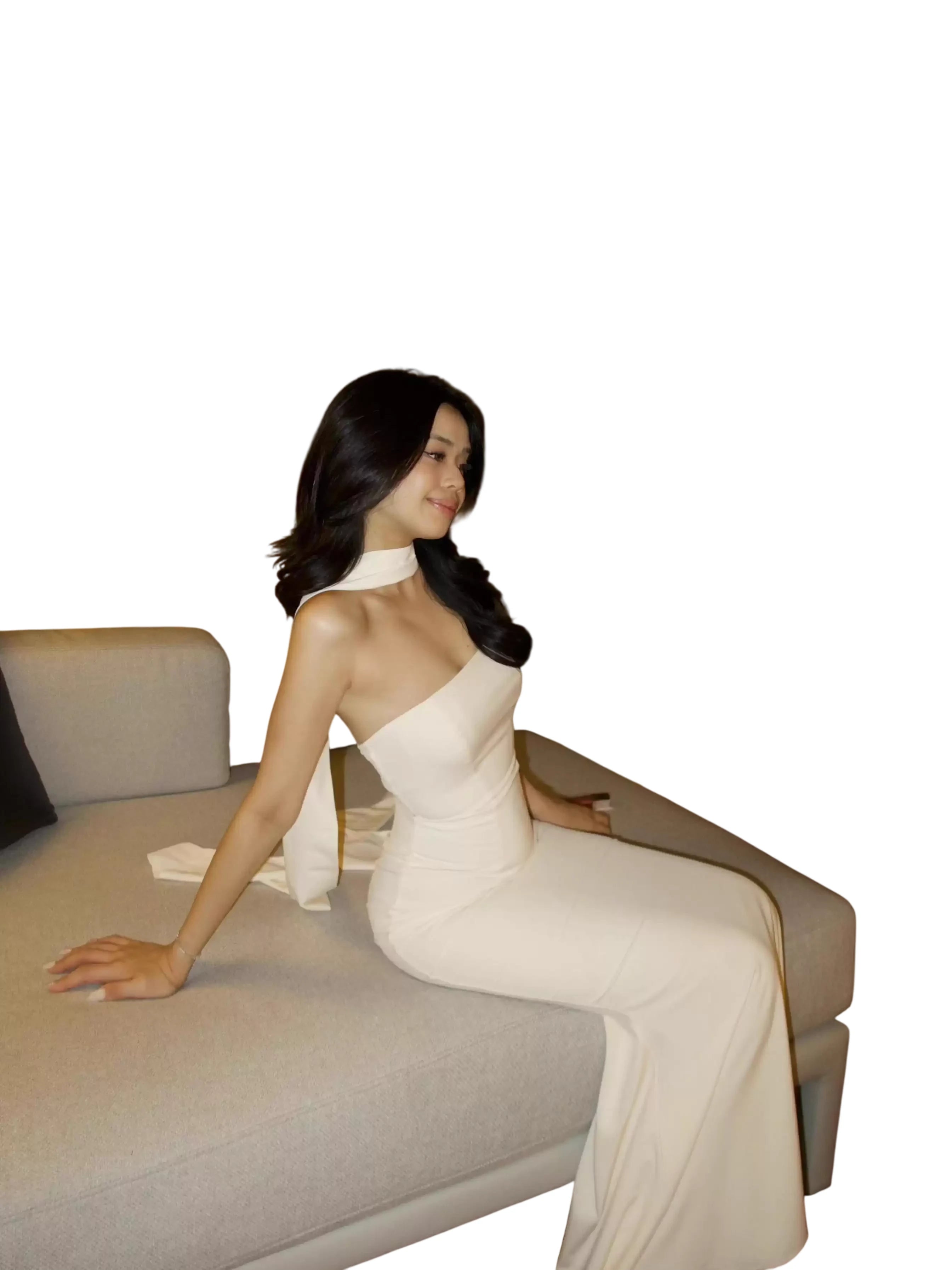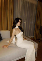 This elegant women's evening gown features a strapless, form-fitting mermaid silhouette that gracefully extends to the floor. Designed in the French minimalist style, the dress comes in a soft off-white shade and includes a matching neck scarf for a touch of refined sophistication. Crafted from smooth, slightly stretchy fabric, it offers both comfort and a sleek look, perfect for birthdays, banquets, cocktail toasts, and annual parties.