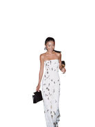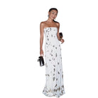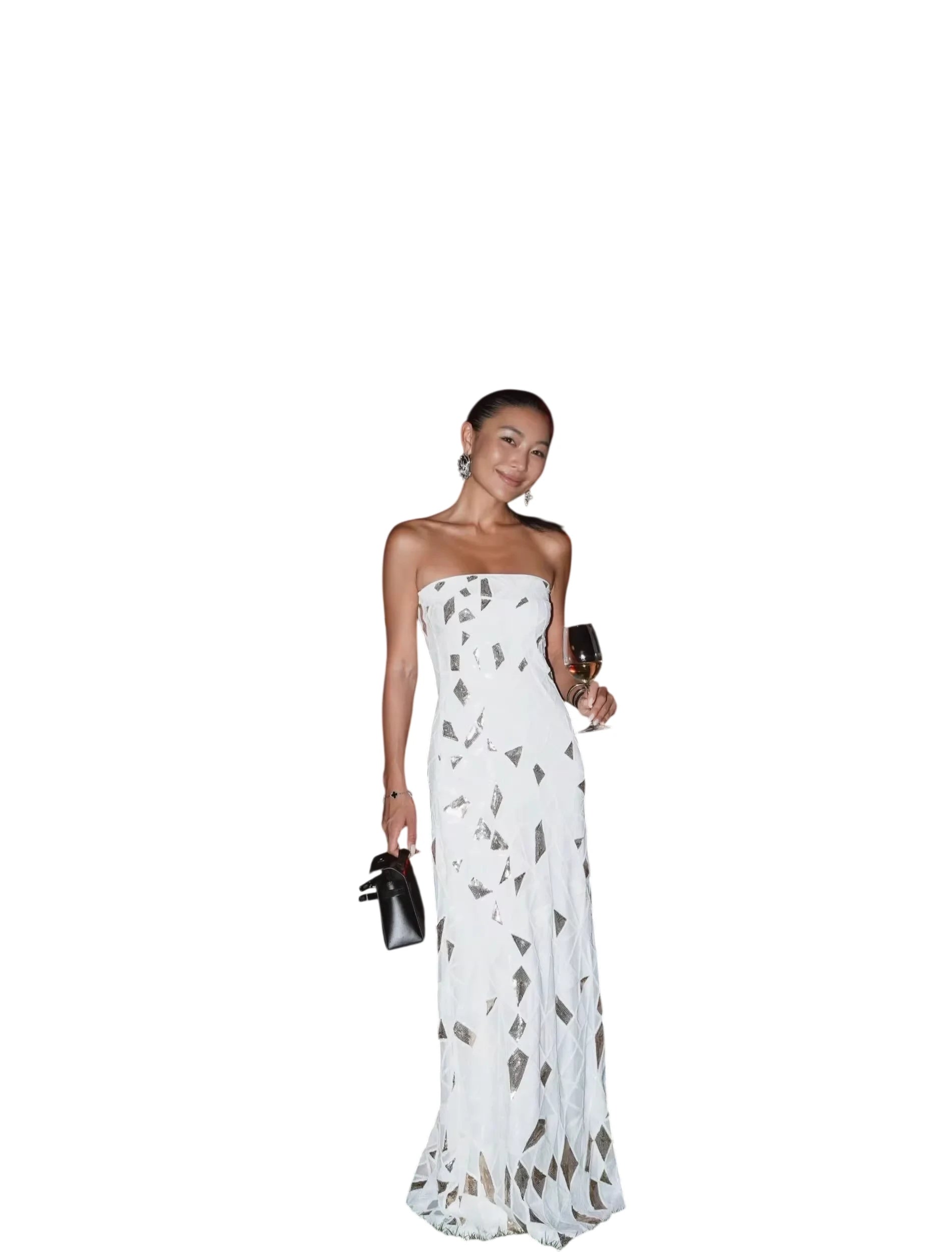 Make a bold entrance in this strapless evening gown designed for women. Featuring a striking colorblock pattern with fragmented sequin embellishments and geometric metallic inserts, this floor-length dress combines elegance with a modern edge. The form-fitting silhouette flows gracefully to the ground, perfect for upscale nighttime events. Complete the look with statement accessories for a show-stopping ensemble.