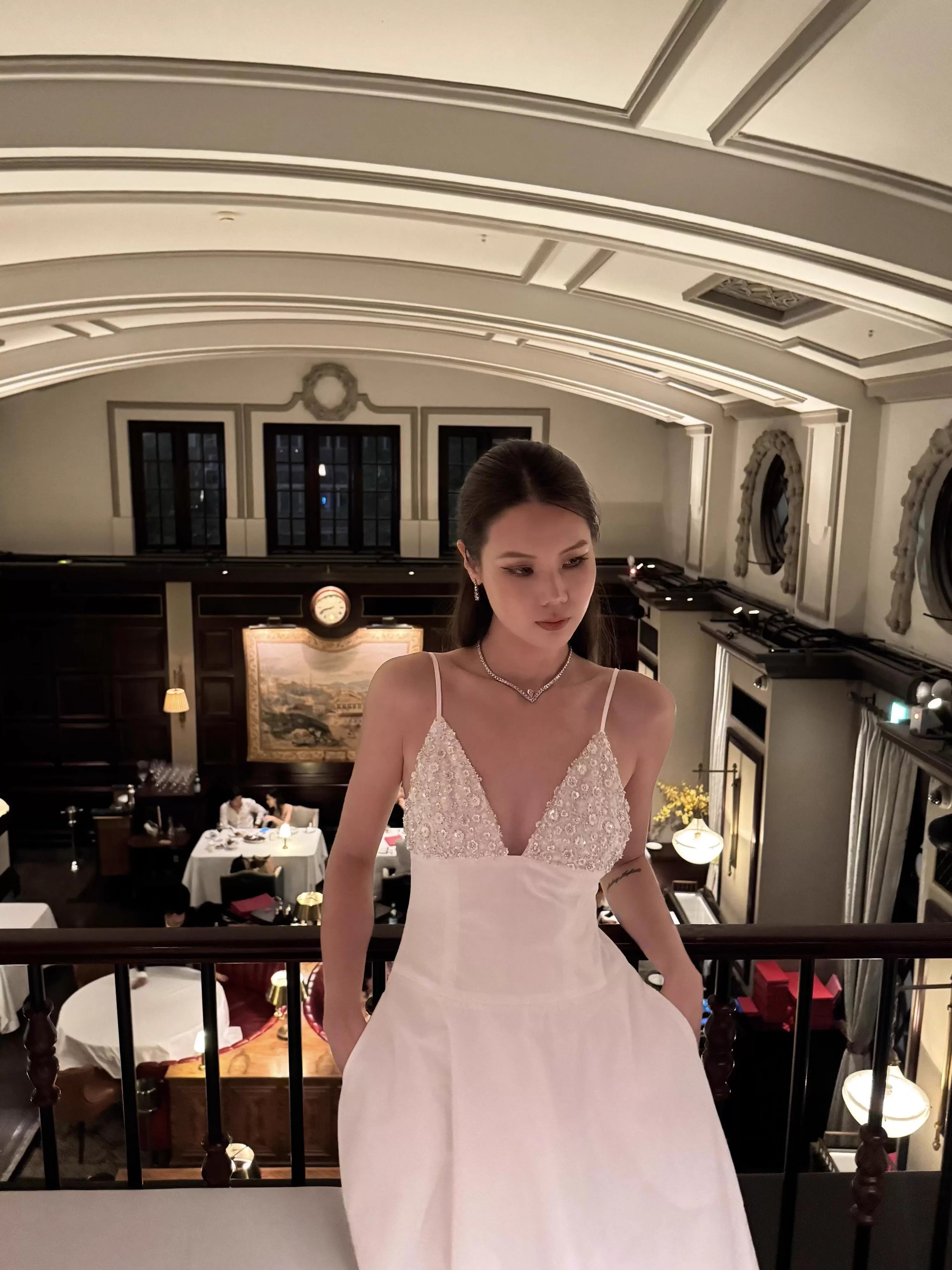 This elegant women's evening gown features intricate beaded embroidery and shimmering sequins on a deep V-neck bodice. Sleeveless with delicate straps, the dress flows into a sleek satin skirt, creating a luxurious and feminine silhouette. Perfect for birthday celebrations, toasts, or upscale evening events, this gown exudes refined sophistication.