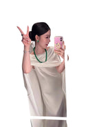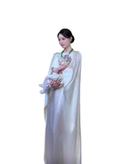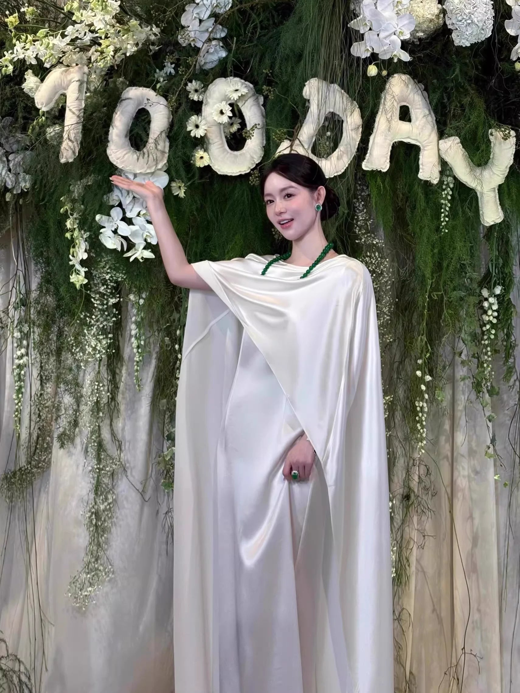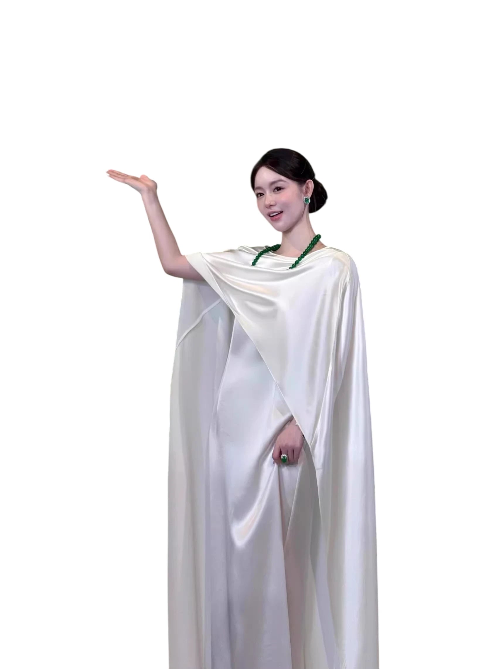 This elegant two-piece evening gown features a floor-length white satin dress paired with a graceful cape overlay, creating a luxurious and refined silhouette. Designed with a high, round neckline and a glossy satin finish, this piece is perfect for formal occasions, evening toasts, or birthday celebrations. The flowing cape drapes elegantly over the arms, adding a contemporary touch to classic evening wear. Ideal for women seeking a sophisticated and stylish outfit for special events.
