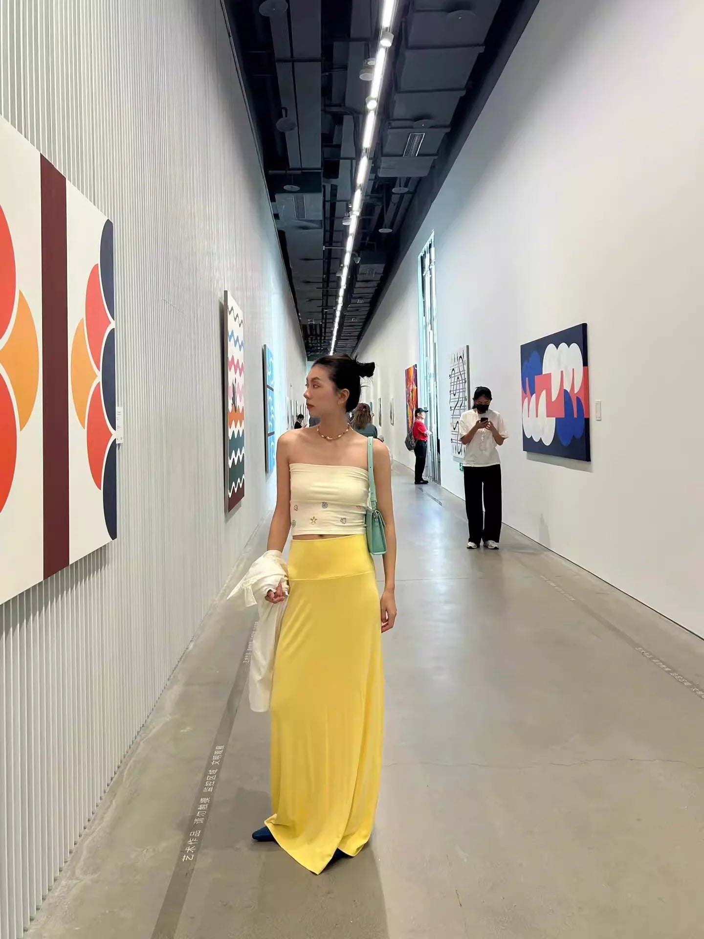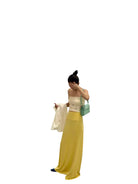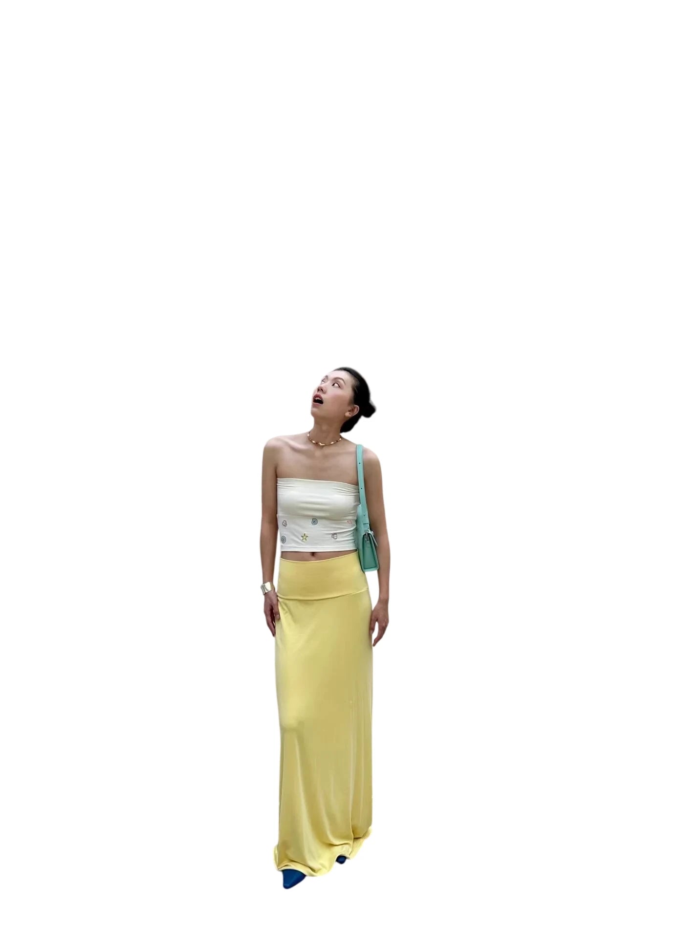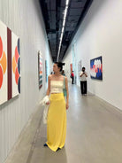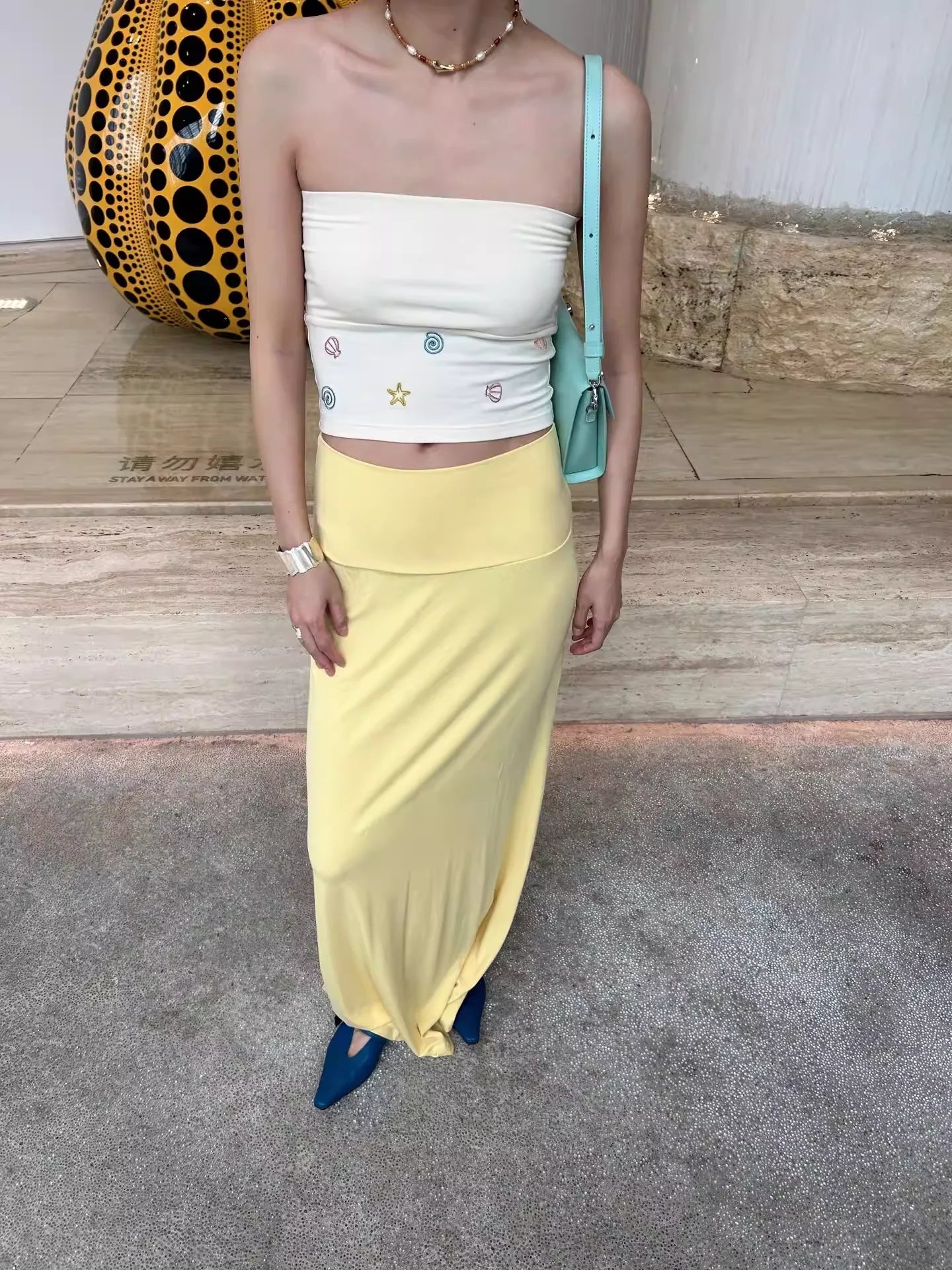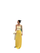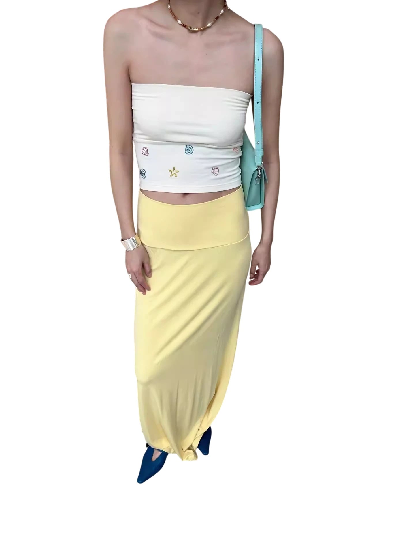 Embrace beach-ready charm with this summery two-piece set for women. The outfit features a strapless white tube top adorned with colorful embroidered motifs including starfish, seashells, and swirling patterns for a playful, coastal vibe. It's paired with a flowing pastel yellow maxi skirt that sits high at the waist and drapes gracefully to the floor. Perfect for vacation strolls or casual summer outings, this set blends comfort with whimsical style.