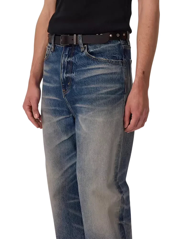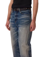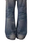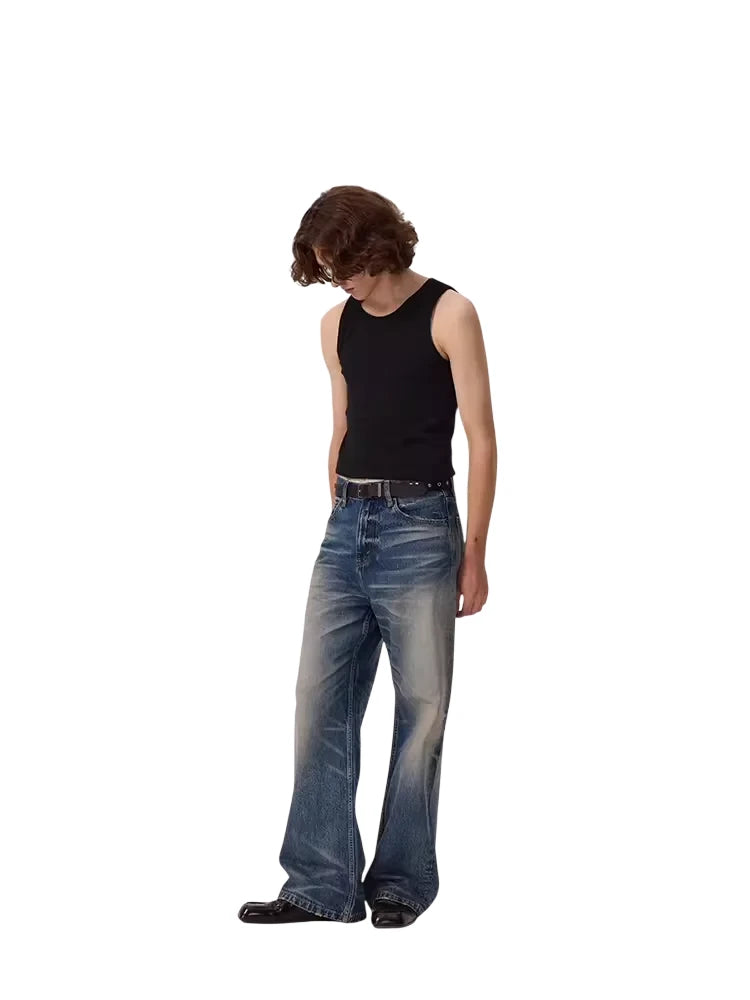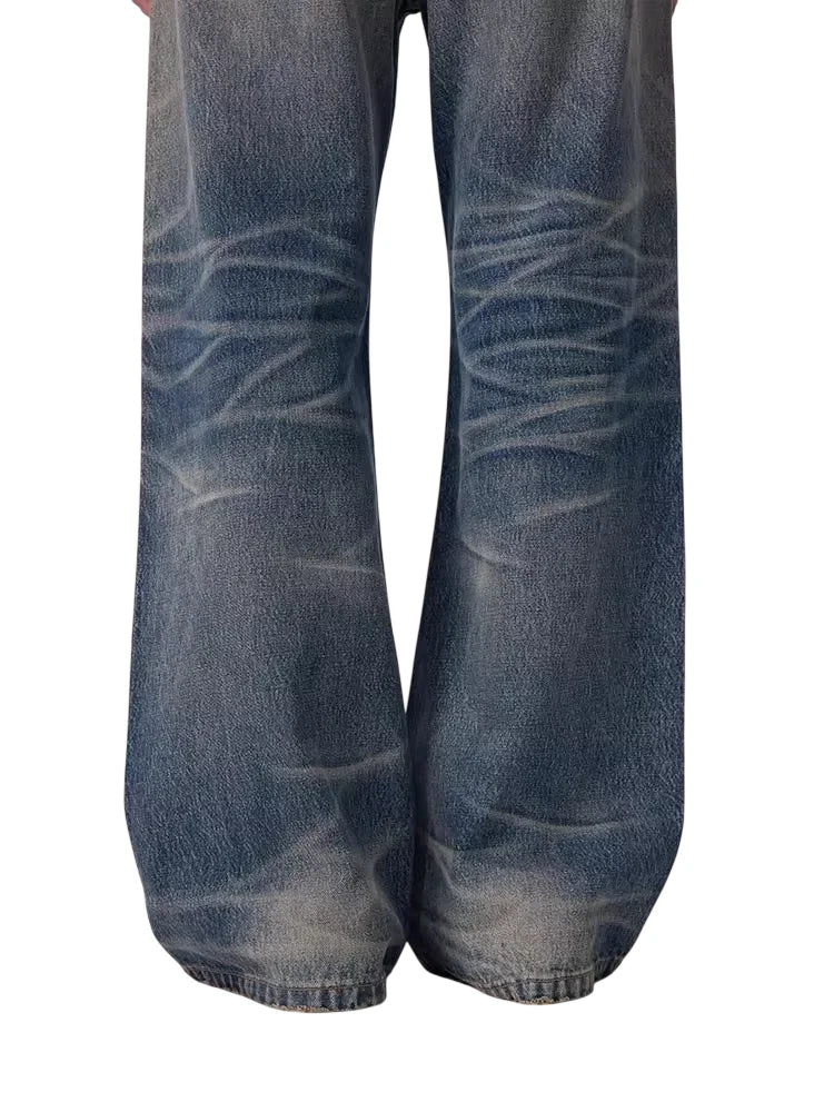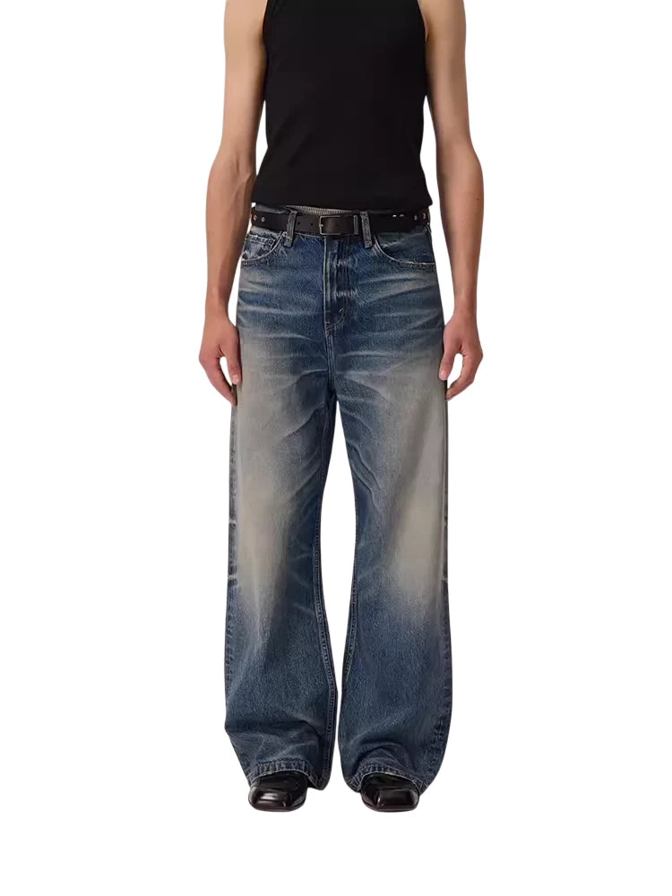 These men's jeans feature a high-waisted, wide-leg design in a vintage washed blue hue, with natural whiskering at the cuffs adding a unique texture. The classic five-pocket construction, combined with distressed details, showcases craftsmanship and street style. Perfect for everyday wear, creating a casual yet confident look.