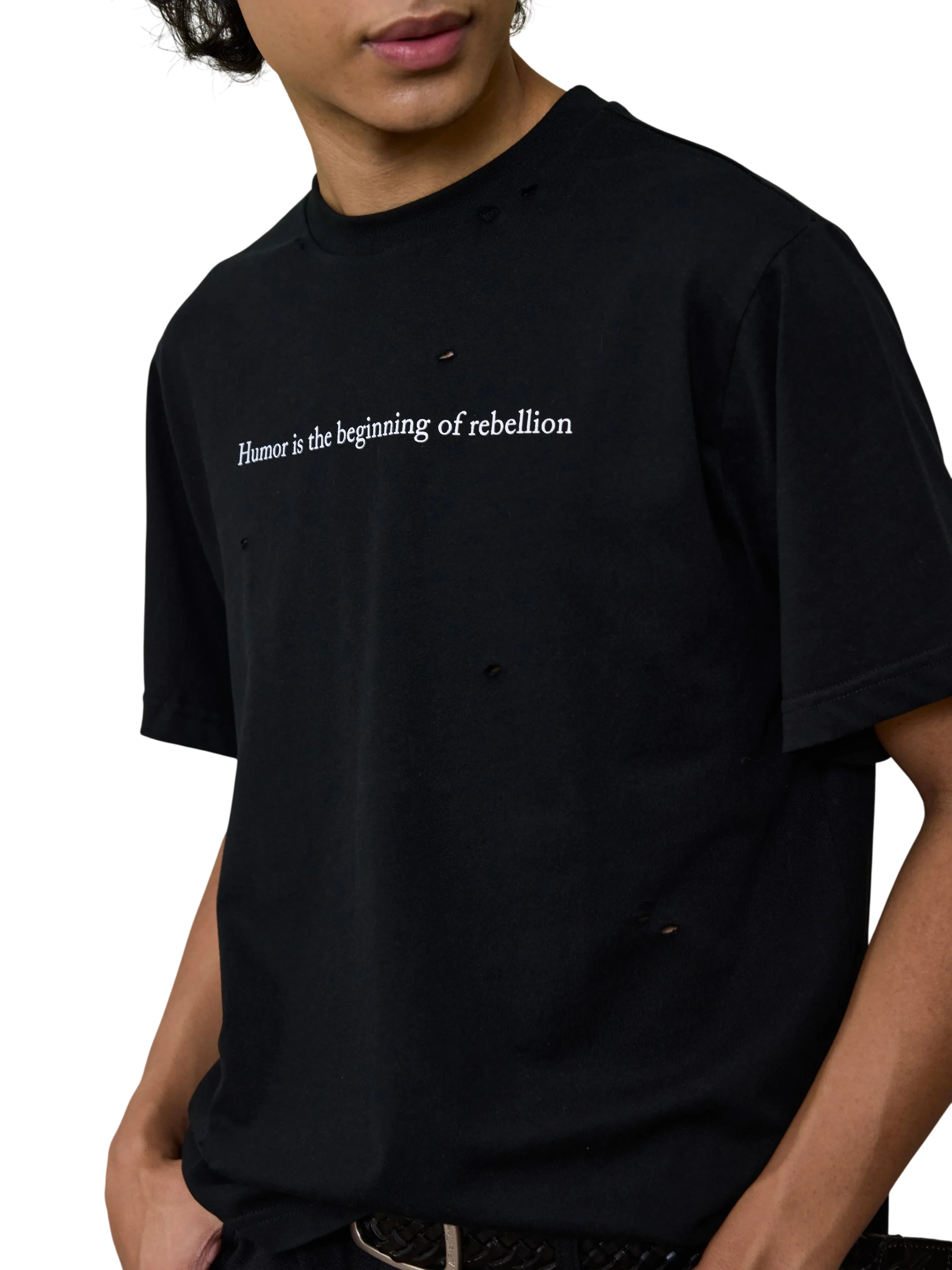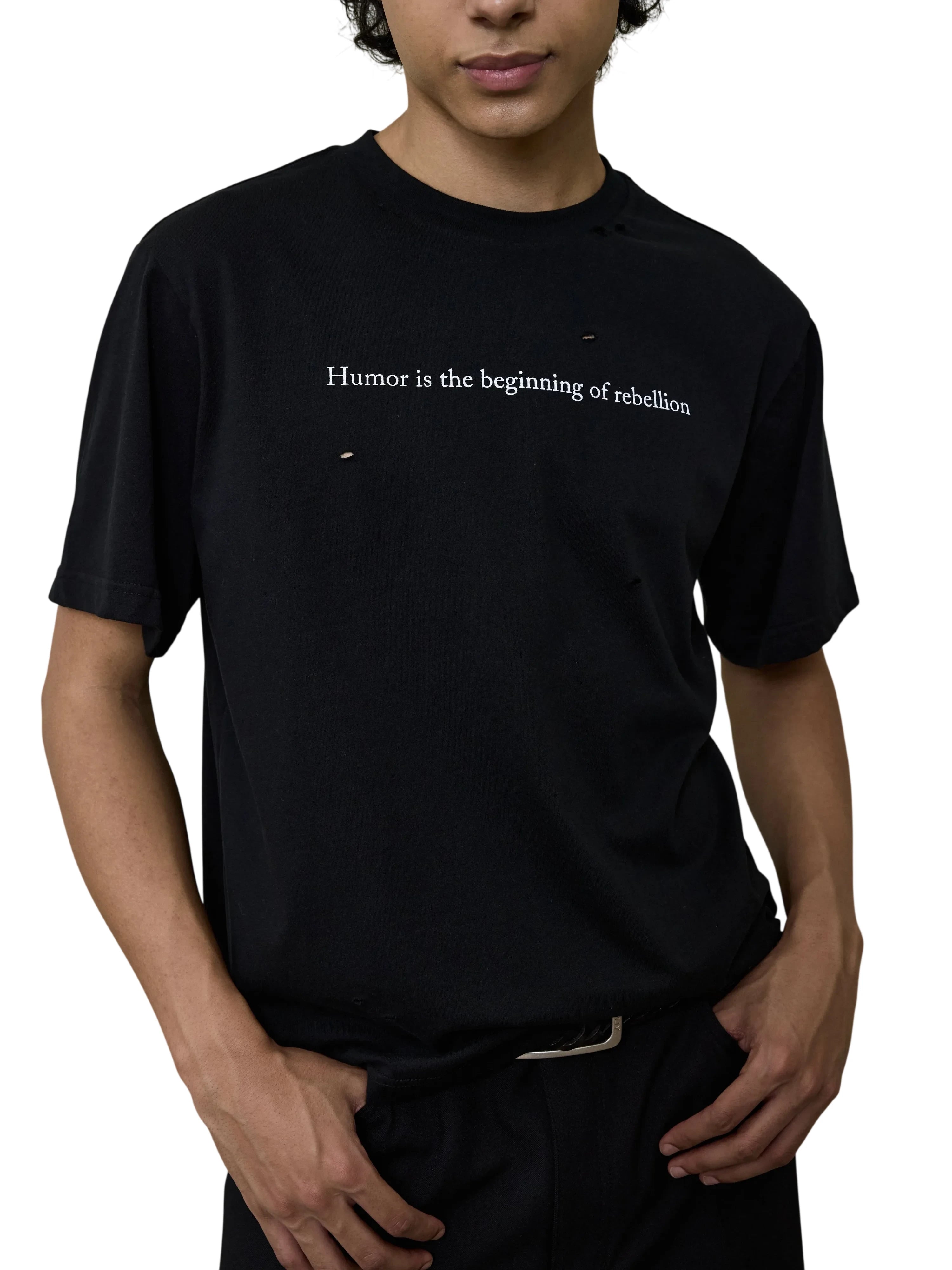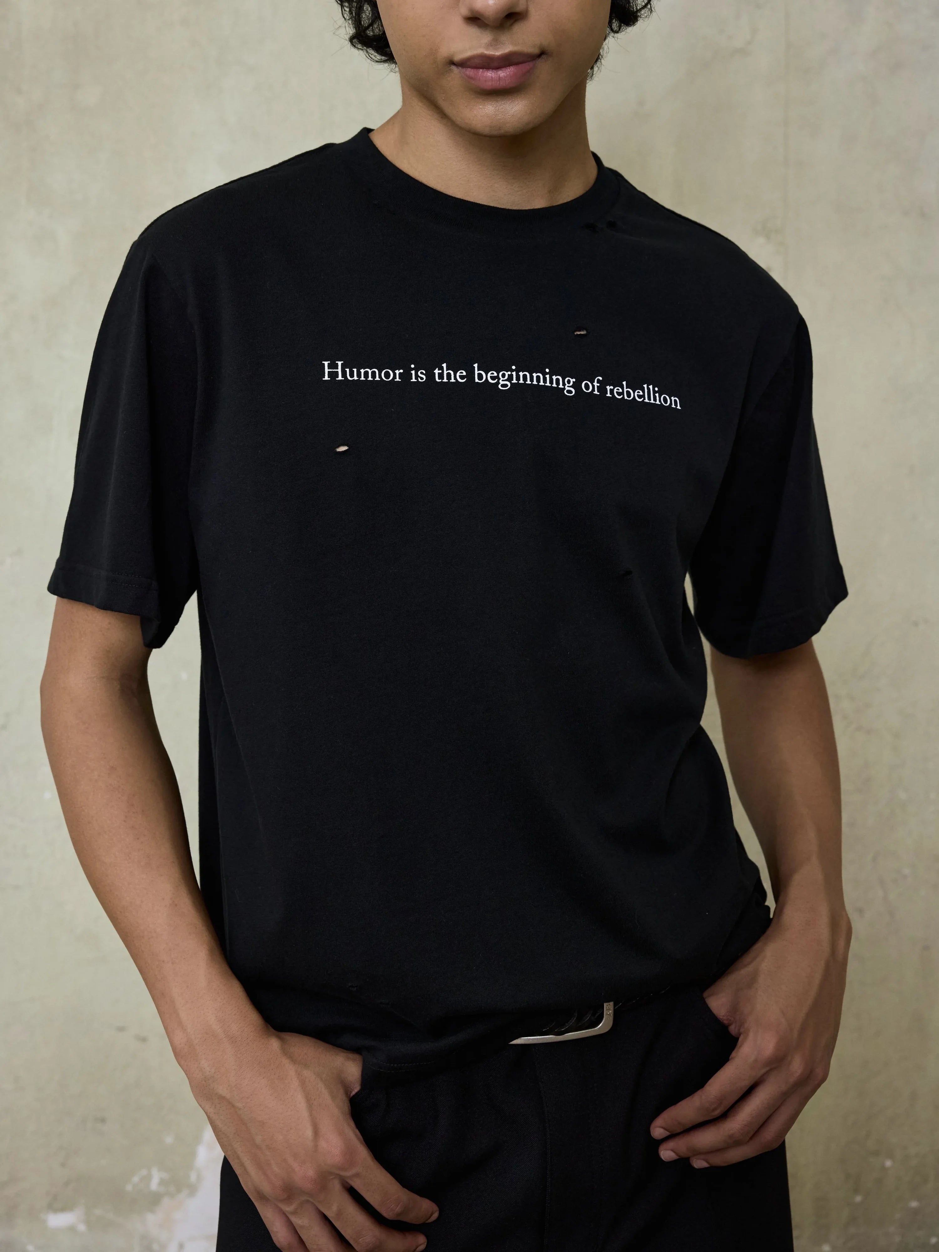 This men's black short-sleeve t-shirt features a bold, centered slogan that reads 'Humor is the beginning of rebellion.' Designed with a relaxed fit and crafted with subtle distressed detailing near the neckline and above the text, it offers a laid-back, edgy style. Pair it with dark pants for a minimalist yet impactful look.