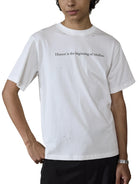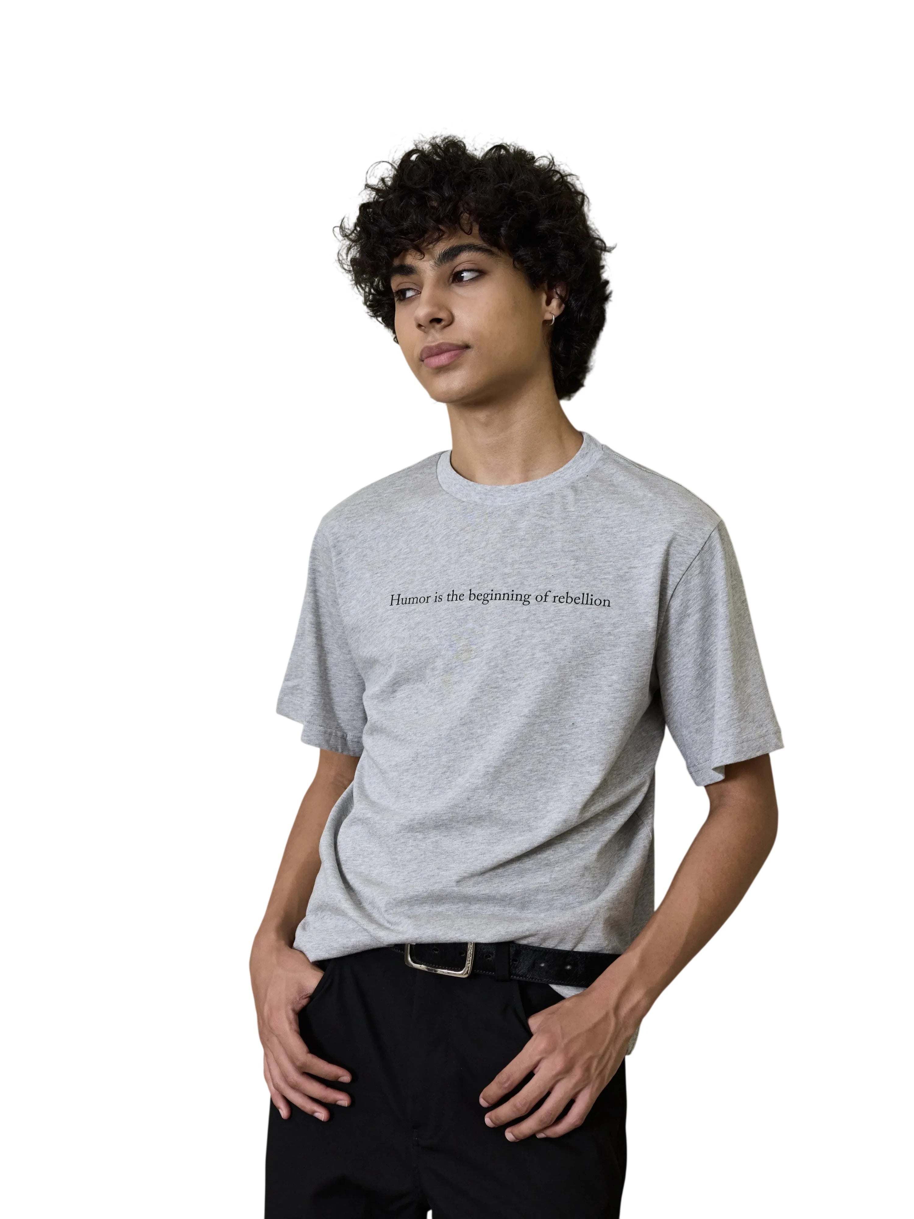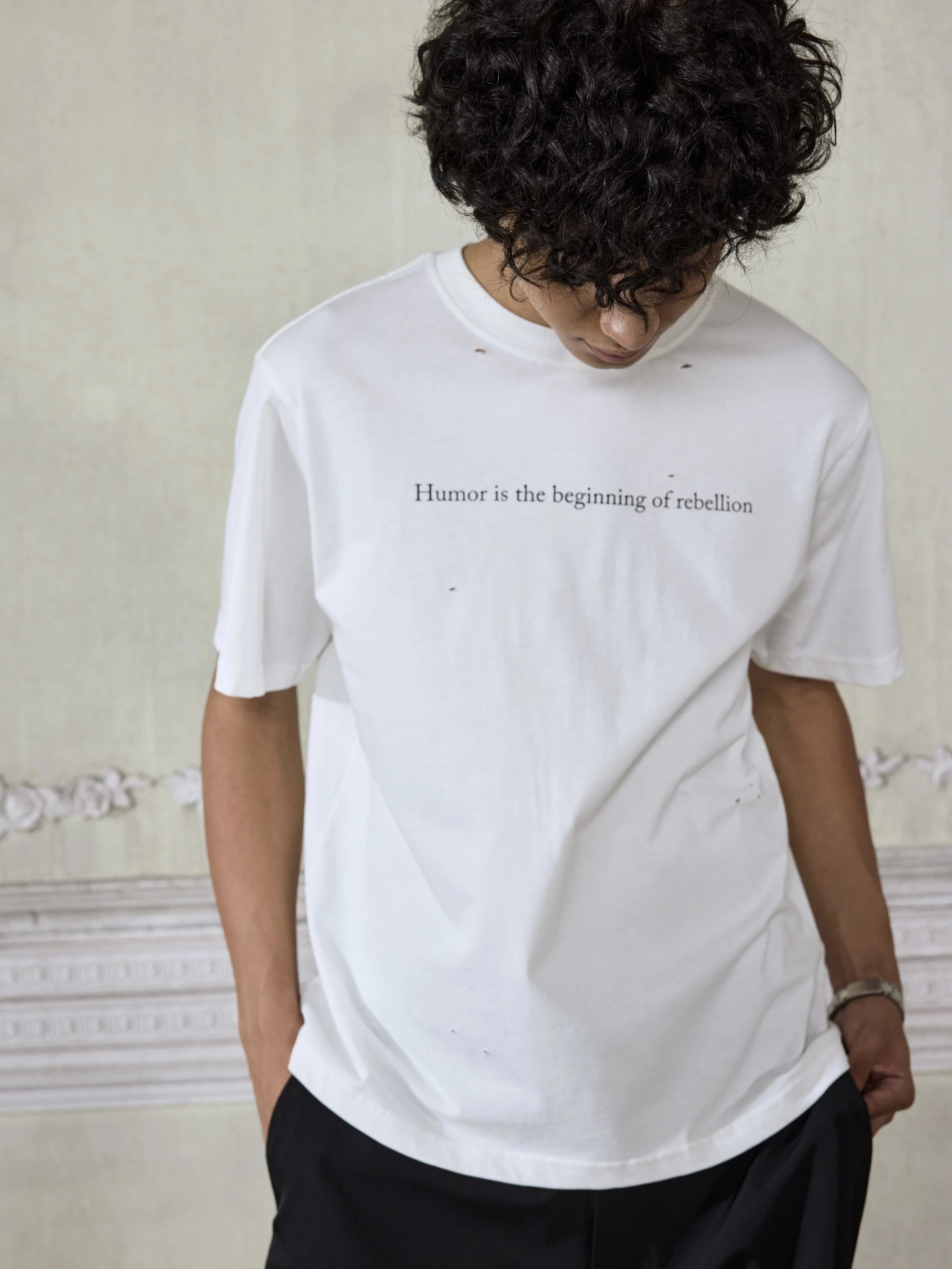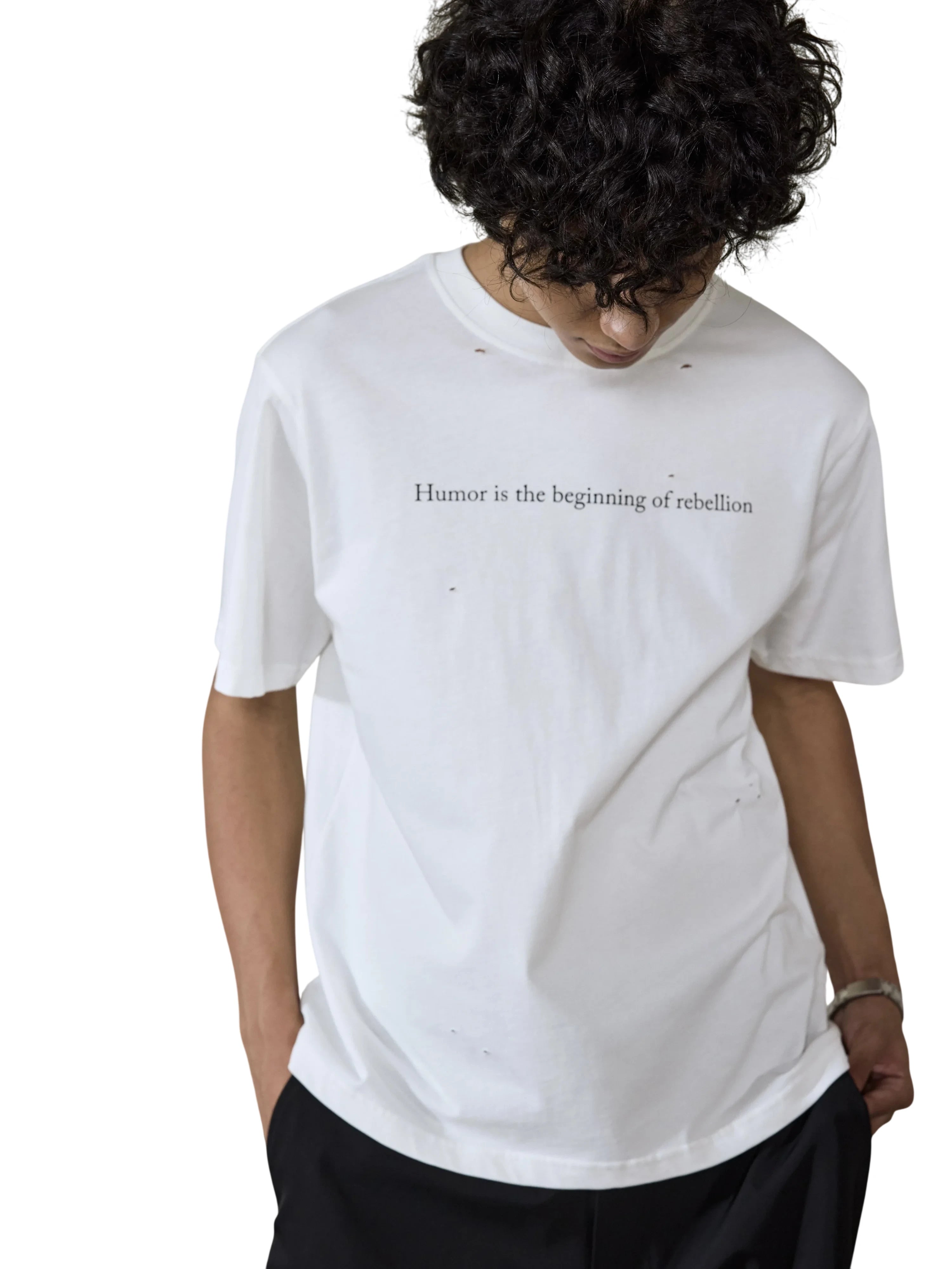 This men's black short-sleeve t-shirt features a bold, centered slogan that reads 'Humor is the beginning of rebellion.' Designed with a relaxed fit and crafted with subtle distressed detailing near the neckline and above the text, it offers a laid-back, edgy style. Pair it with dark pants for a minimalist yet impactful look.