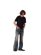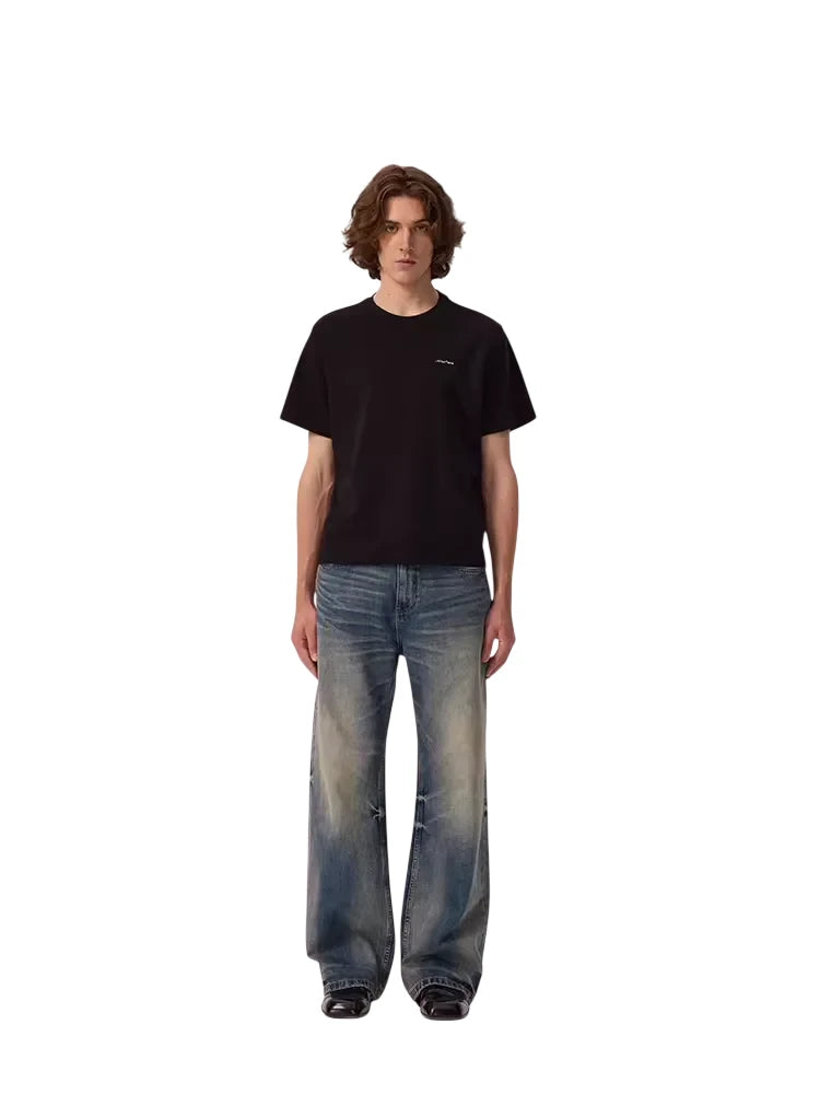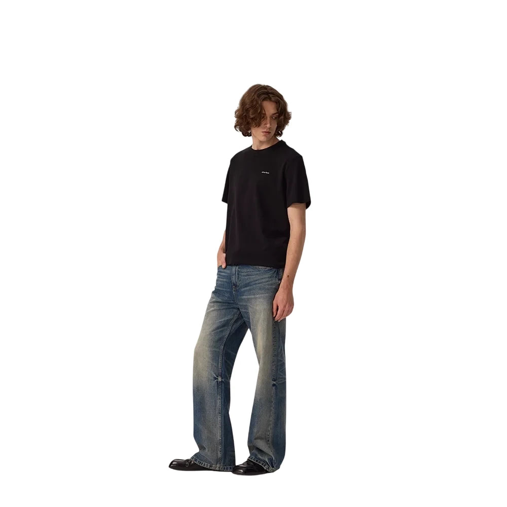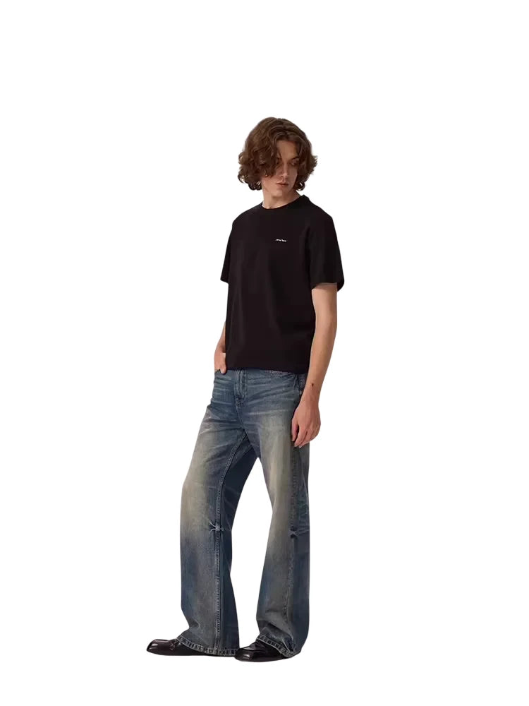 These men's vintage straight-leg jeans feature a washed blue finish and a distressed design around the knees for a worn-in, authentic look. The wide-leg cut offers a relaxed fit for everyday comfort and effortless casual style. Perfectly paired with oversized tops and sneakers, these jeans add a rugged edge to any modern wardrobe.