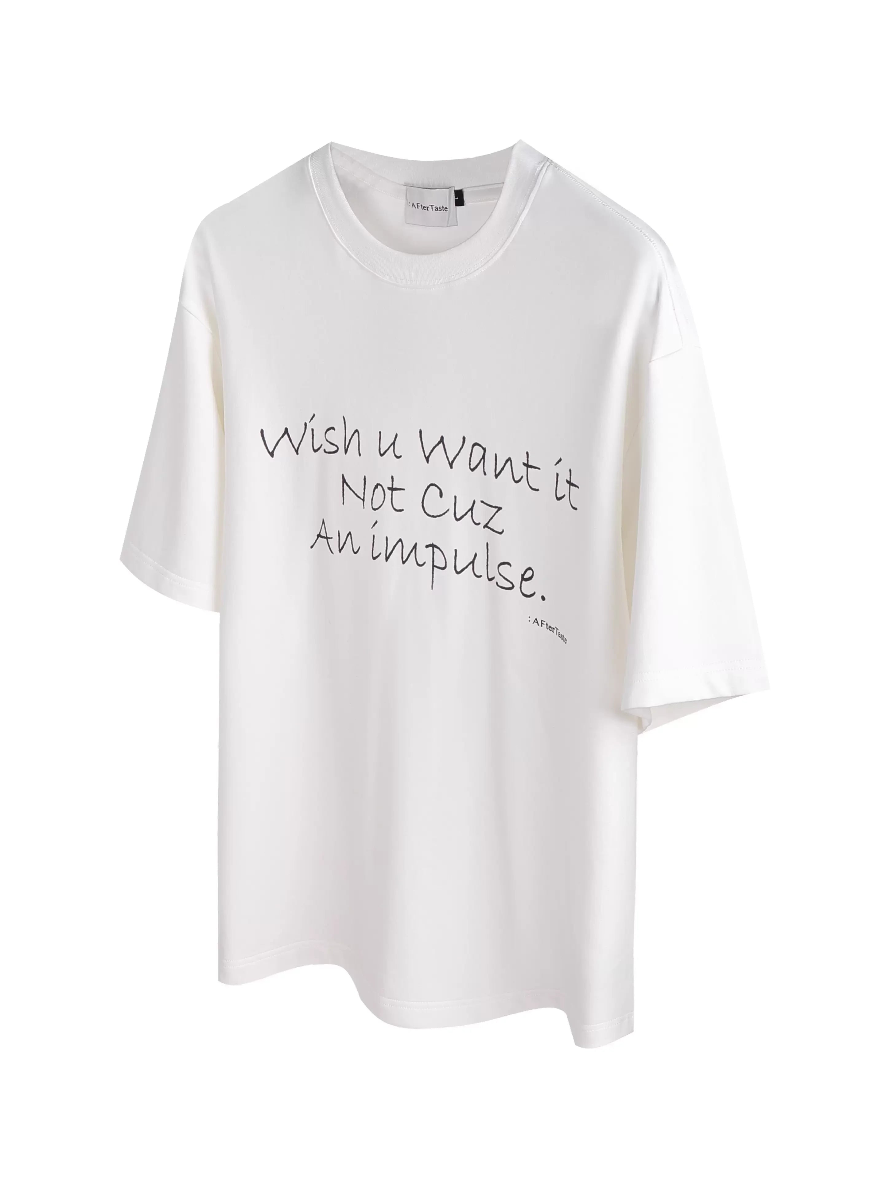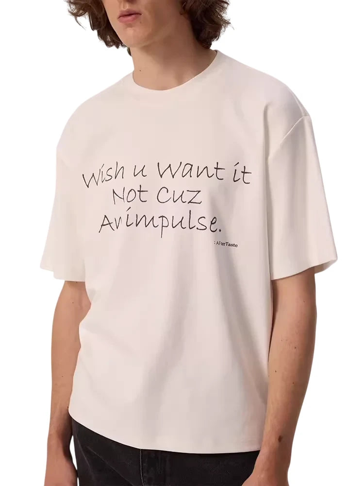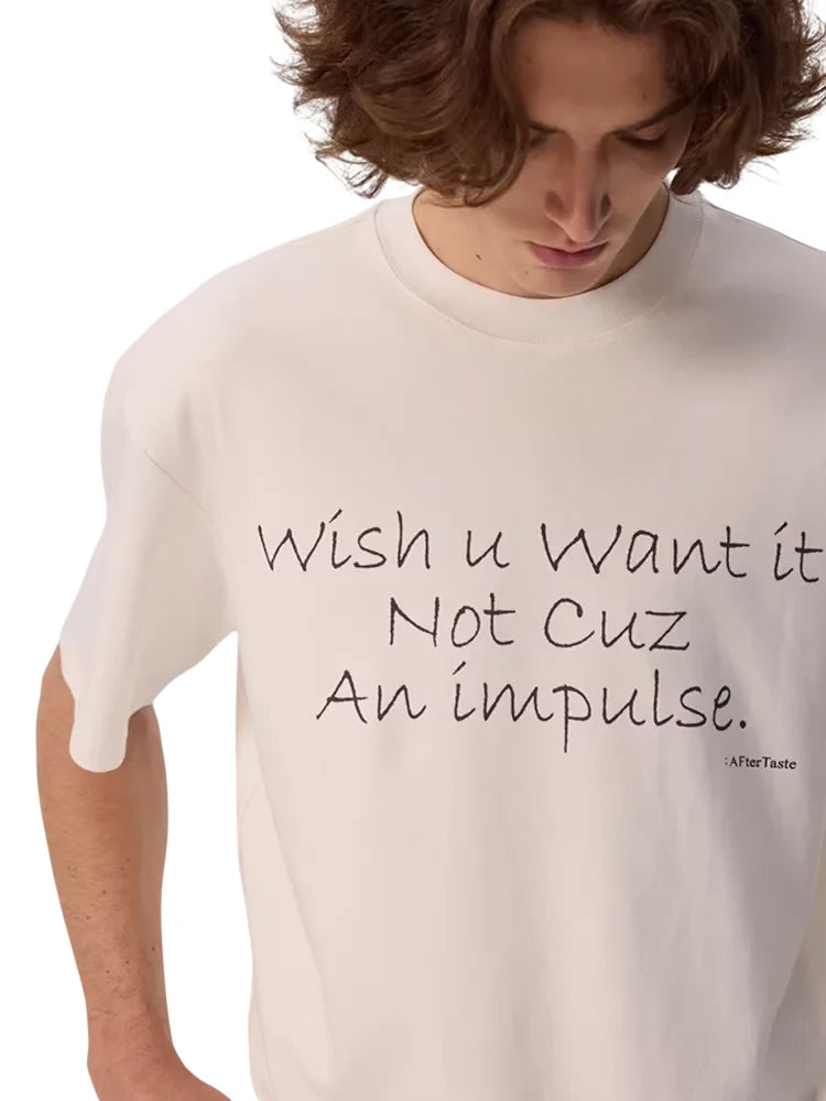 This men’s short sleeve tee features a relaxed, oversized fit with a drape round neckline and dropped shoulders, creating a casual, streetwear-inspired silhouette. The white fabric is complemented by a distinctive handwritten-style slogan print that reads, “Wish u want it not cuz of impulse…”. Paired best with wide-leg jeans or casual bottoms, this tee offers a laid-back yet stylish addition to any wardrobe.