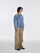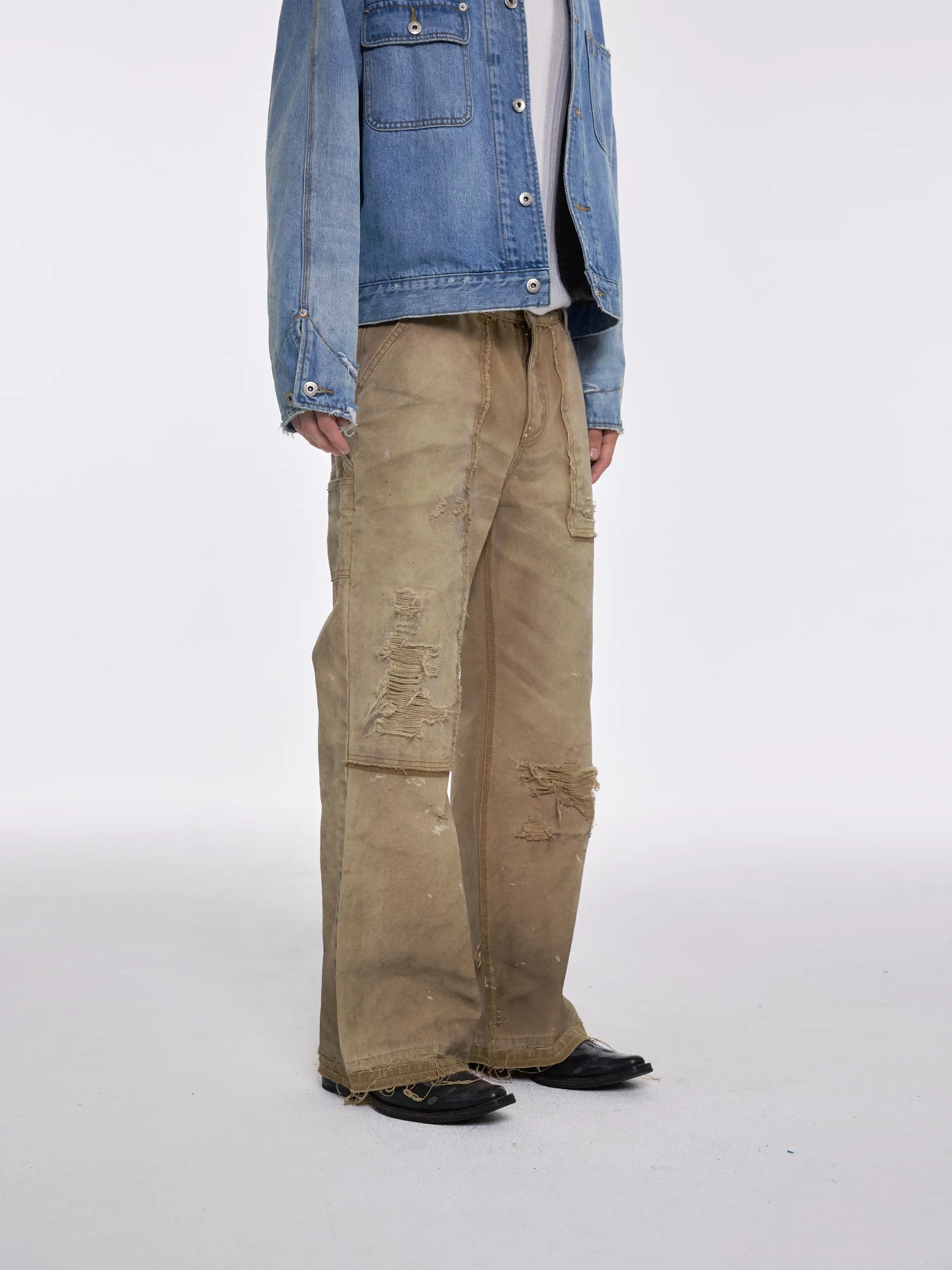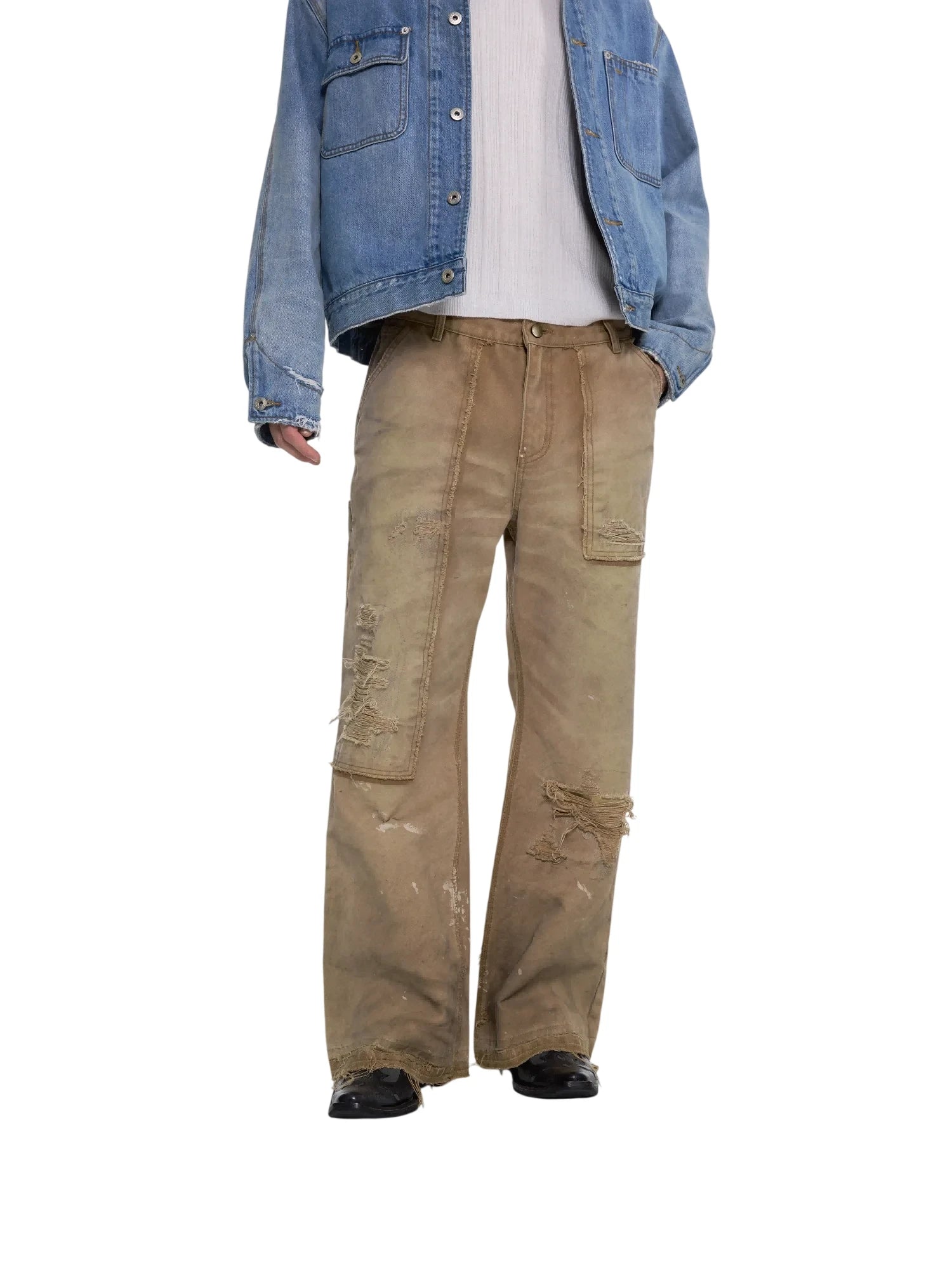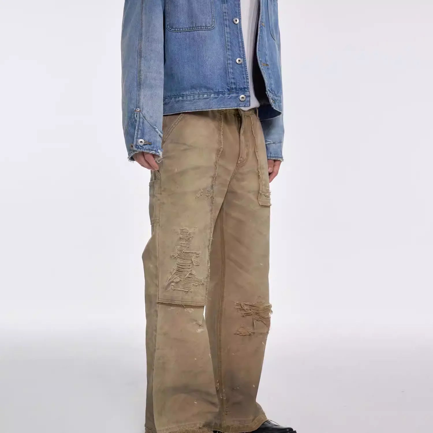 These men's cargo jeans feature a garment-dyed light khaki finish with a rugged, distressed look. Frayed and ripped detailing across the thighs and knees lends a vintage, worn-in aesthetic, while the durable canvas material ensures lasting wear. Designed with a loose, wide-leg fit, they offer comfort and mobility, making them ideal for workwear or casual styling. Large utility-style side pockets add practicality and reinforce the jeans' workwear appeal.