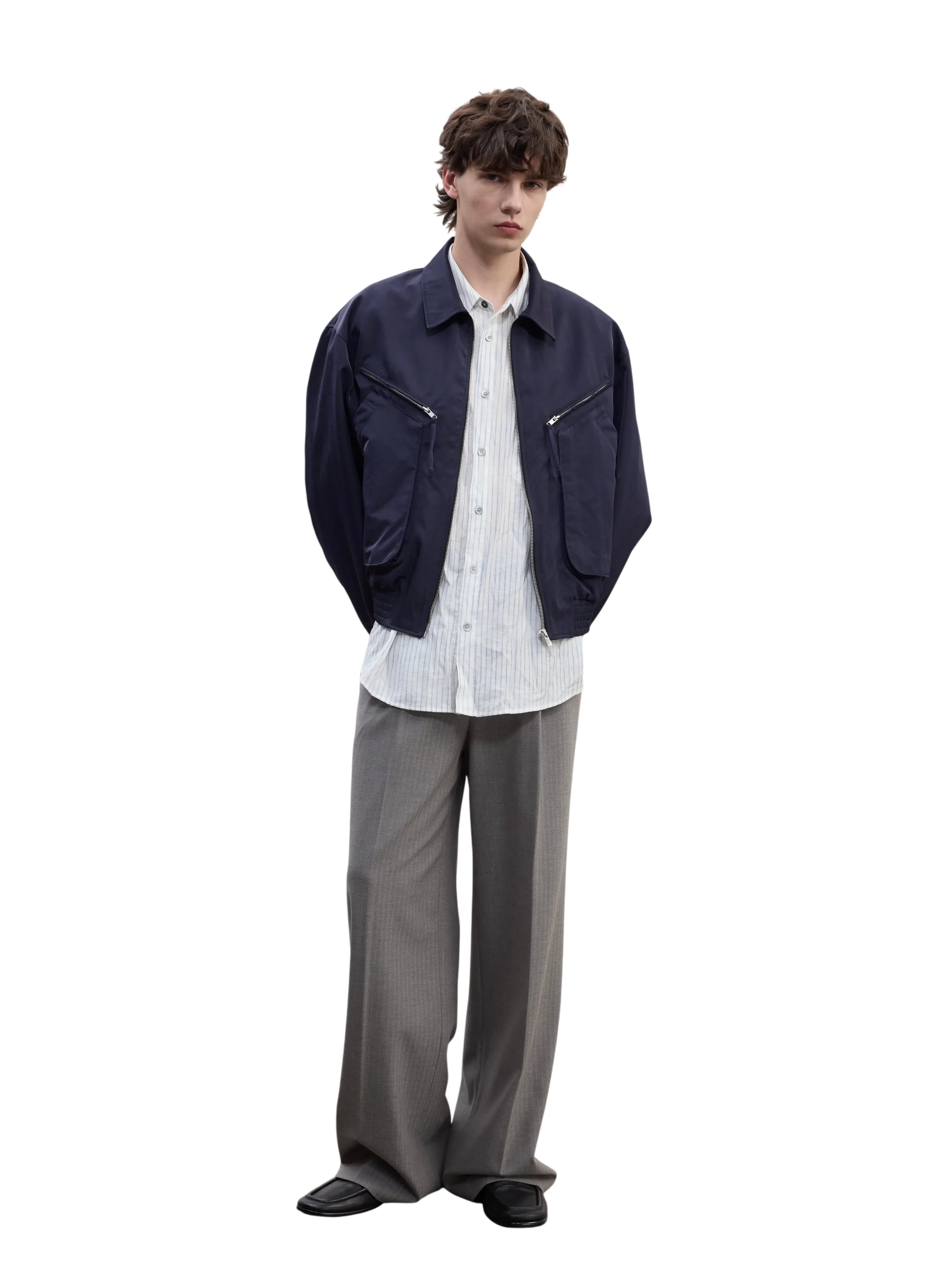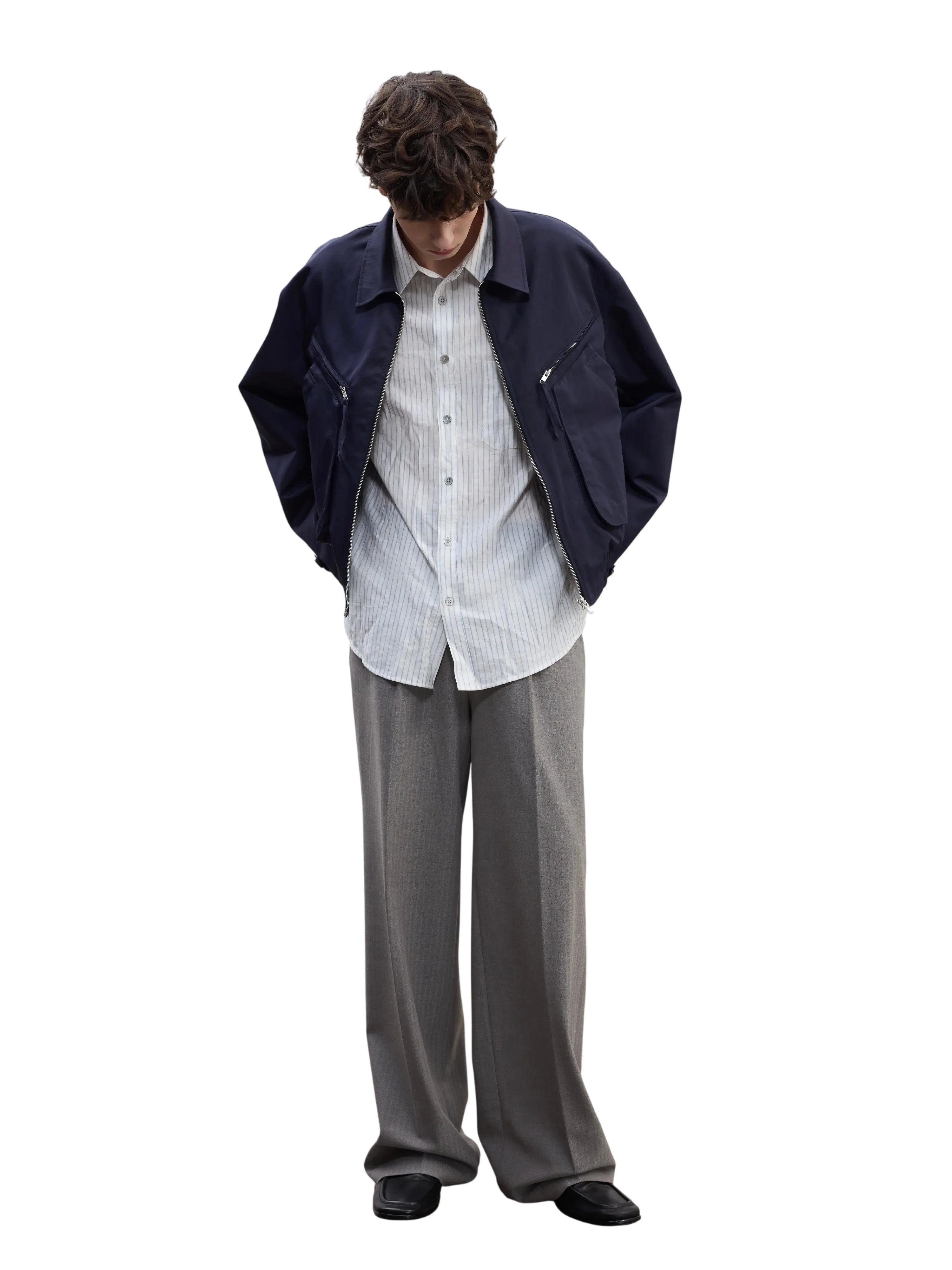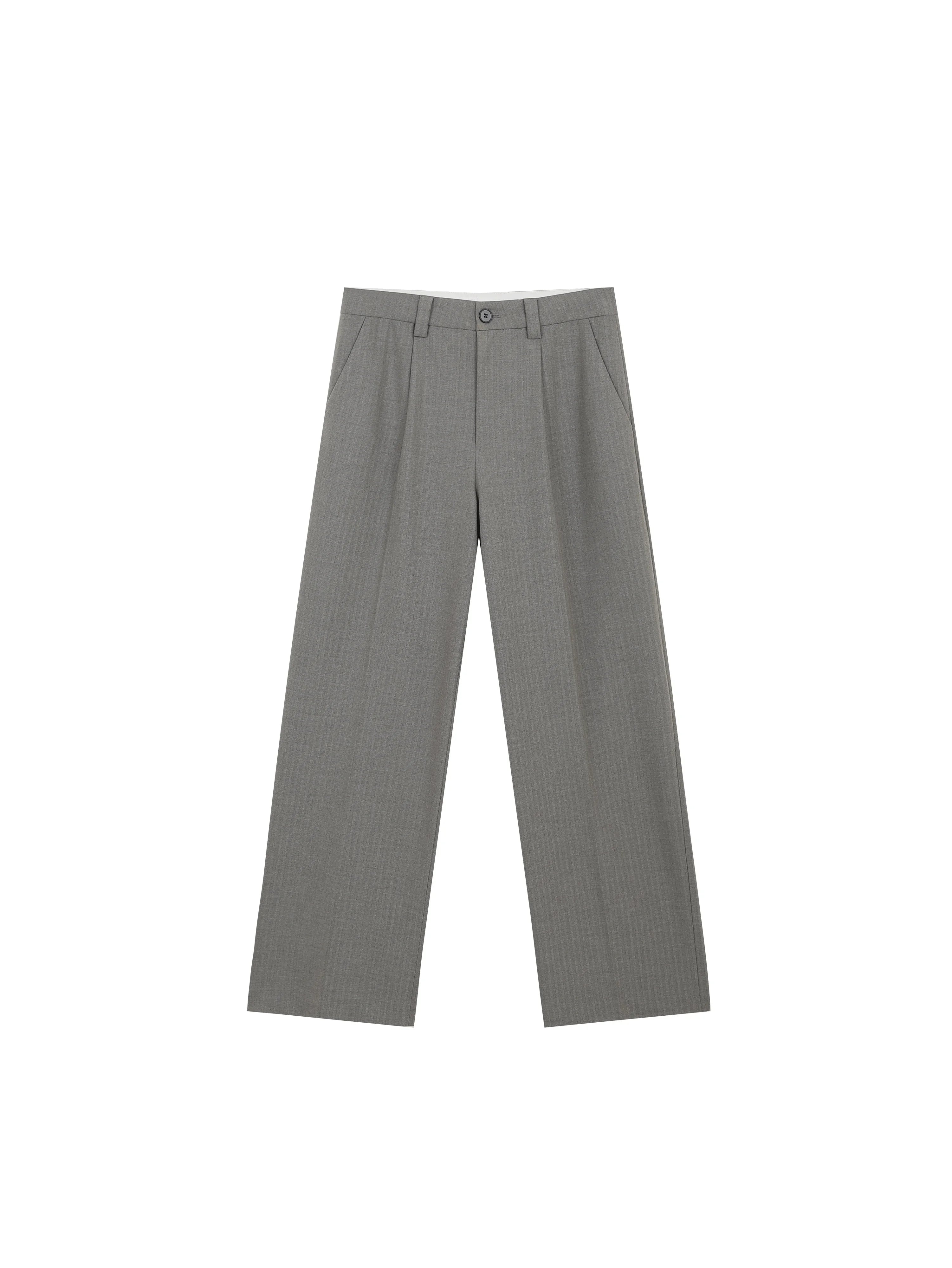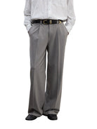 Elevate your formal wardrobe with these men's tailored gray pinstripe trousers. Designed with a high-rise waist, crisp pleats, and a relaxed straight-leg cut, they offer a perfect blend of classic suiting style and modern comfort. Featuring side pockets, belt loops, and a secure button-and-zip closure, these trousers are crafted for both professional and refined casual settings.