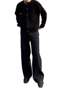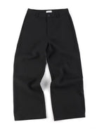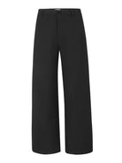 Designed for the modern woman, these black wide-leg trousers feature a sculpted A-line silhouette with a high-waisted fit. Crafted from a structured fabric, they offer a polished drape that flares from the hip for ease and elegance. Complete with belt loops, a front button closure, and zipper fly, these trousers transition effortlessly from casual to semi-formal settings.