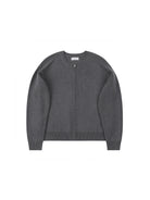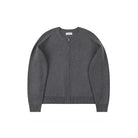 This men's cardigan features a sophisticated charcoal gray hue and is crafted from a soft wool or cotton blend for comfort and warmth. The minimalist design is highlighted by a full-length front zipper and a rounded neckline, creating a sleek, modern silhouette.