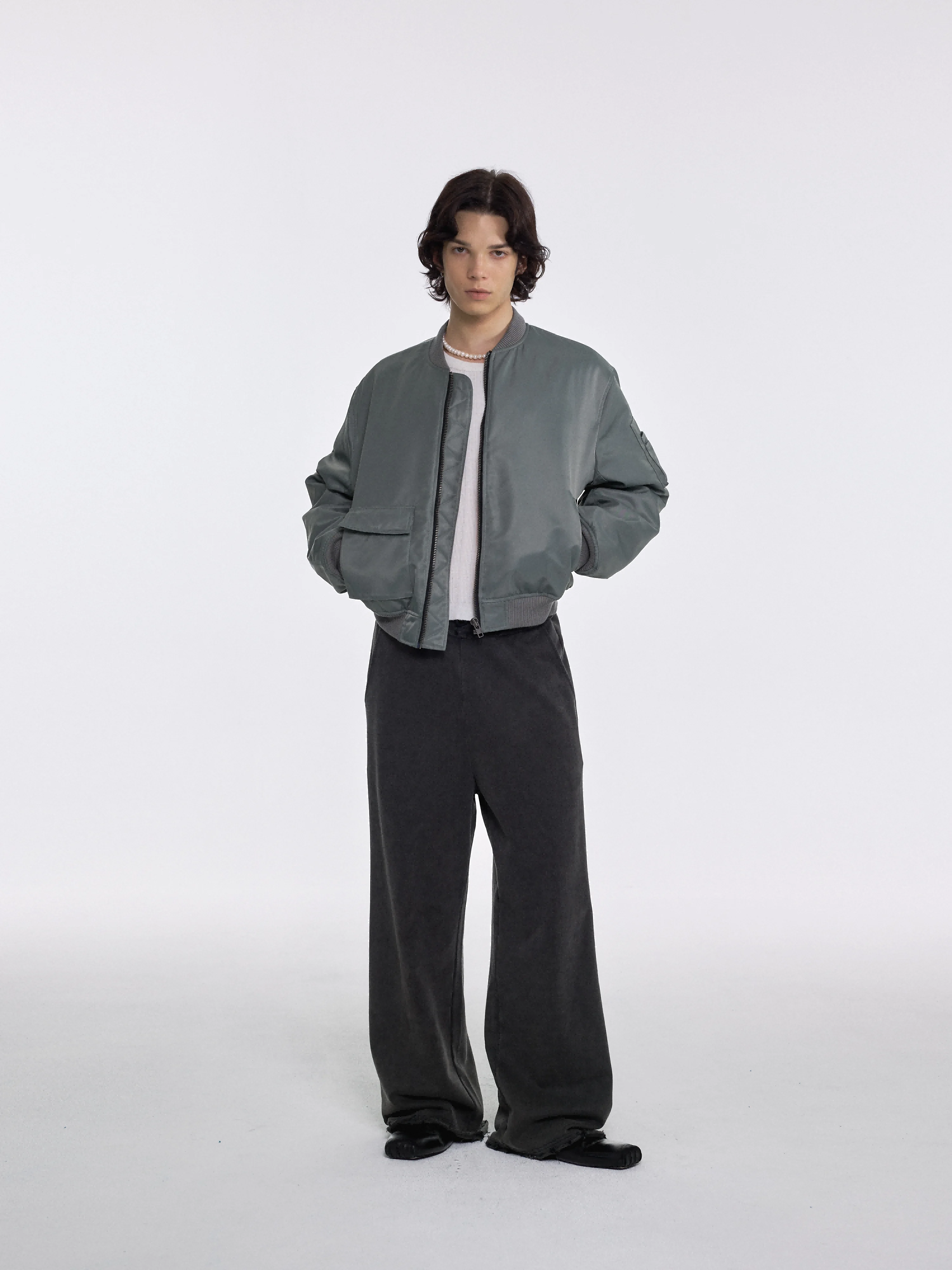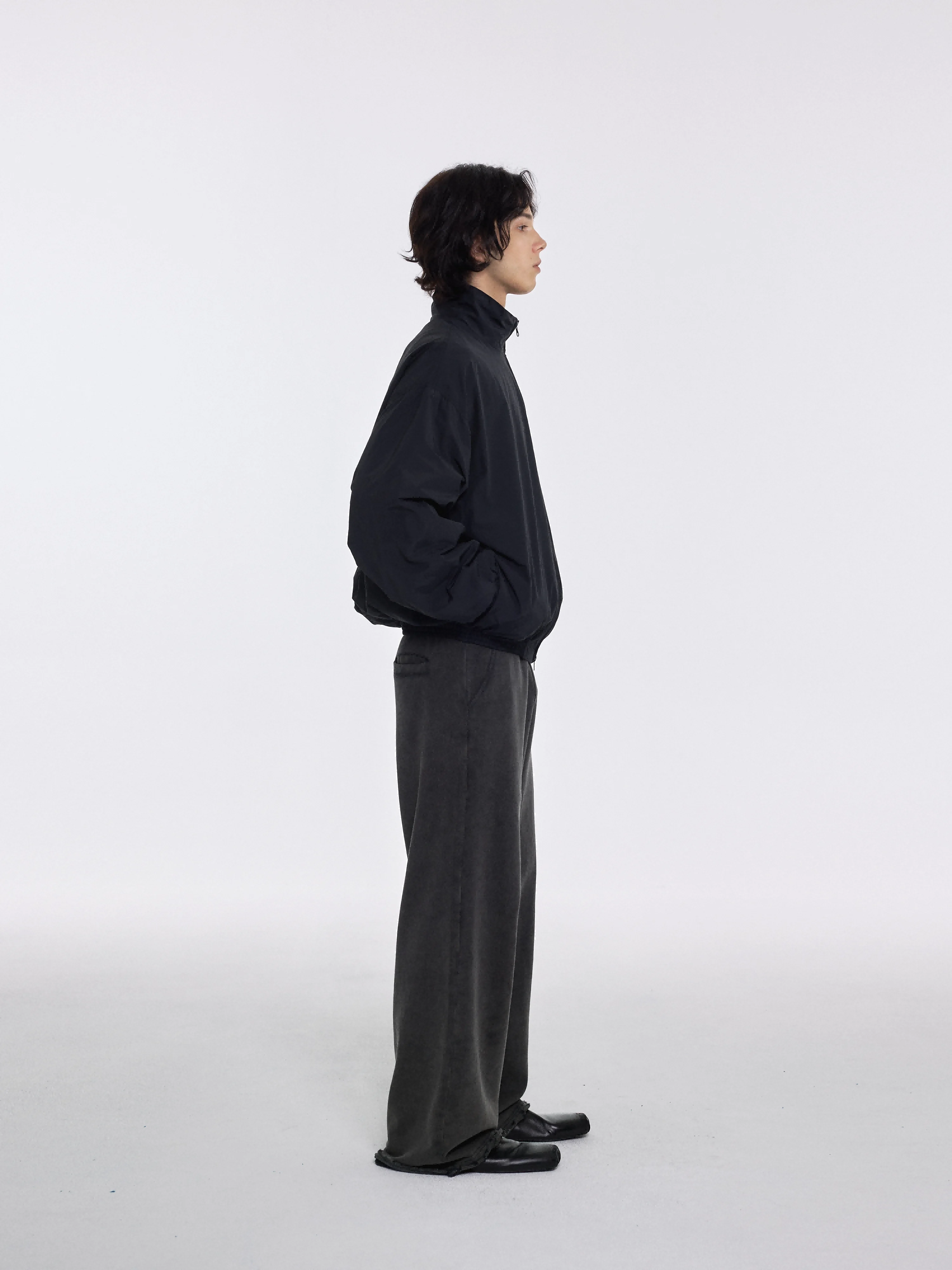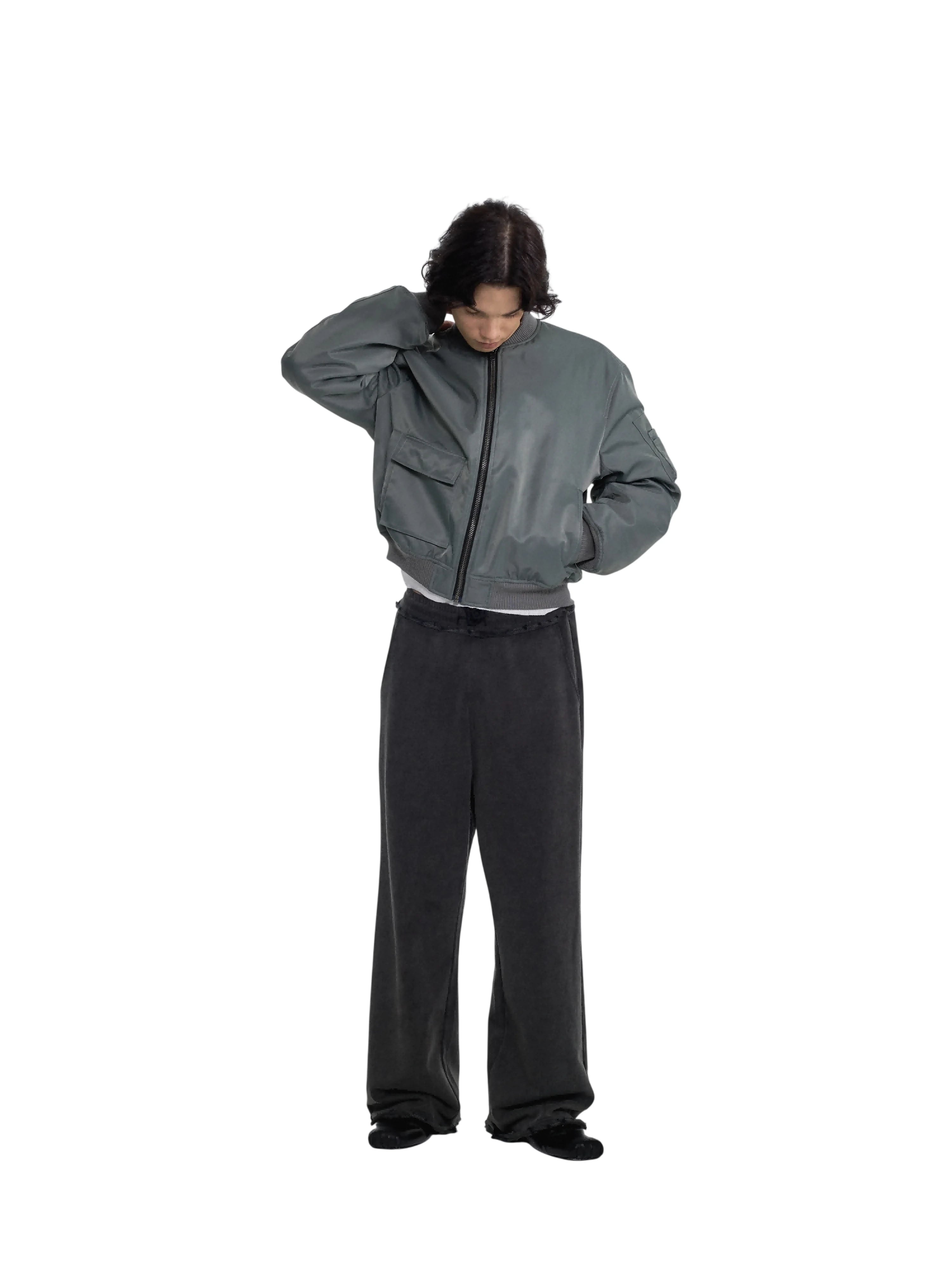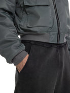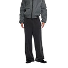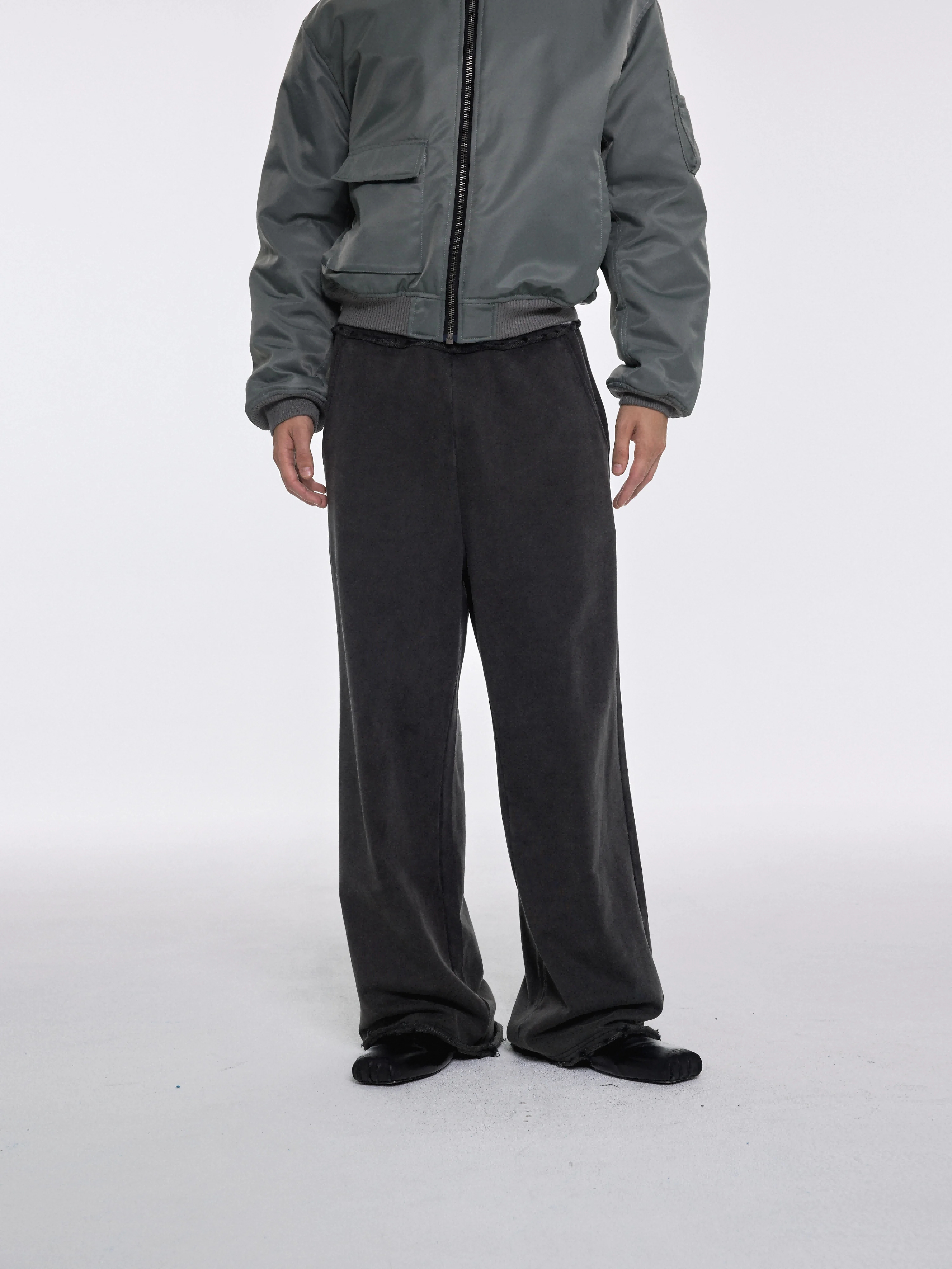 Designed for a relaxed and contemporary fit, these men's sweatpants feature a vintage washed finish and wide-leg silhouette. The dark gray velour fabric offers a soft, tactile feel, while the gathered waistband includes a drawstring for adjustable comfort. Ideal for casual wear, they drape effortlessly and provide a stylish yet laid-back look.