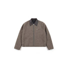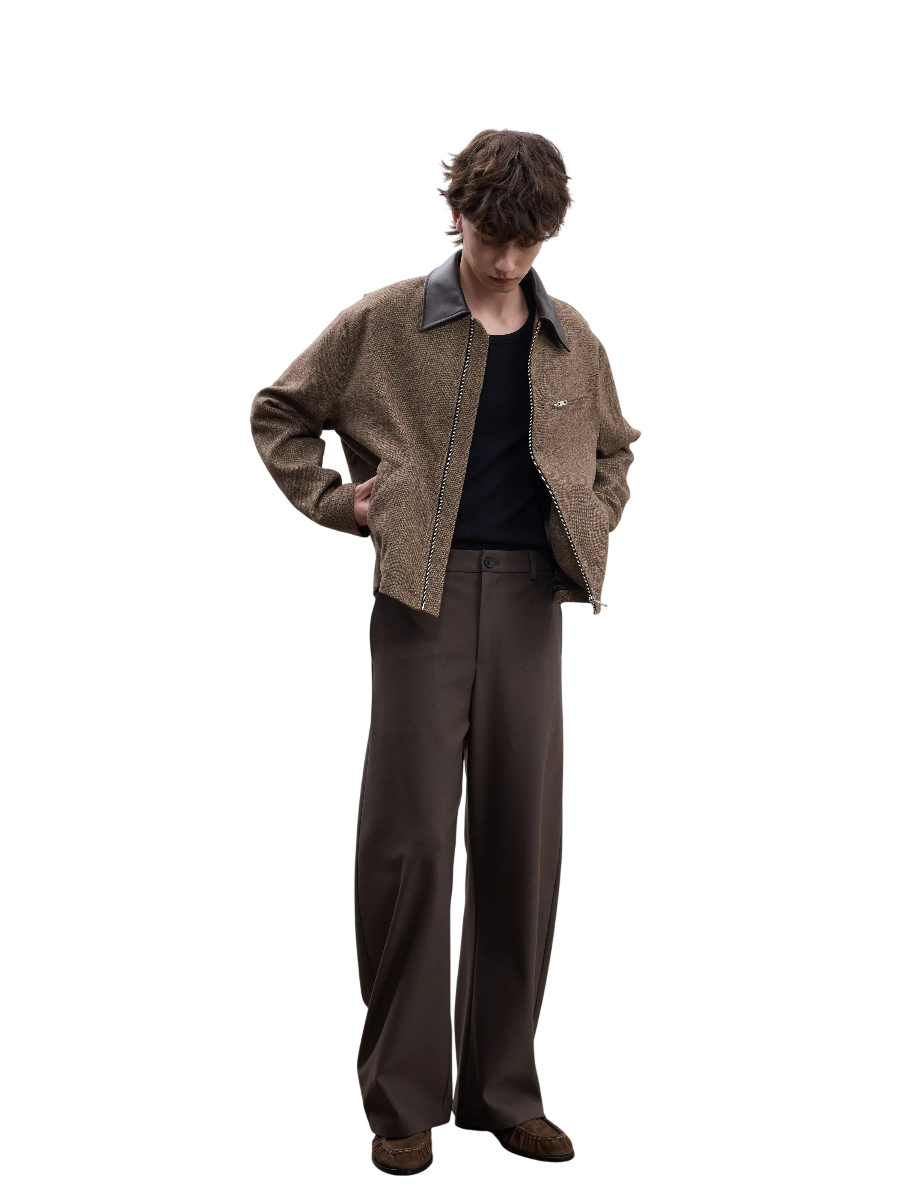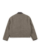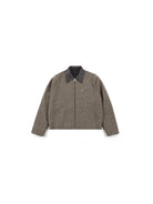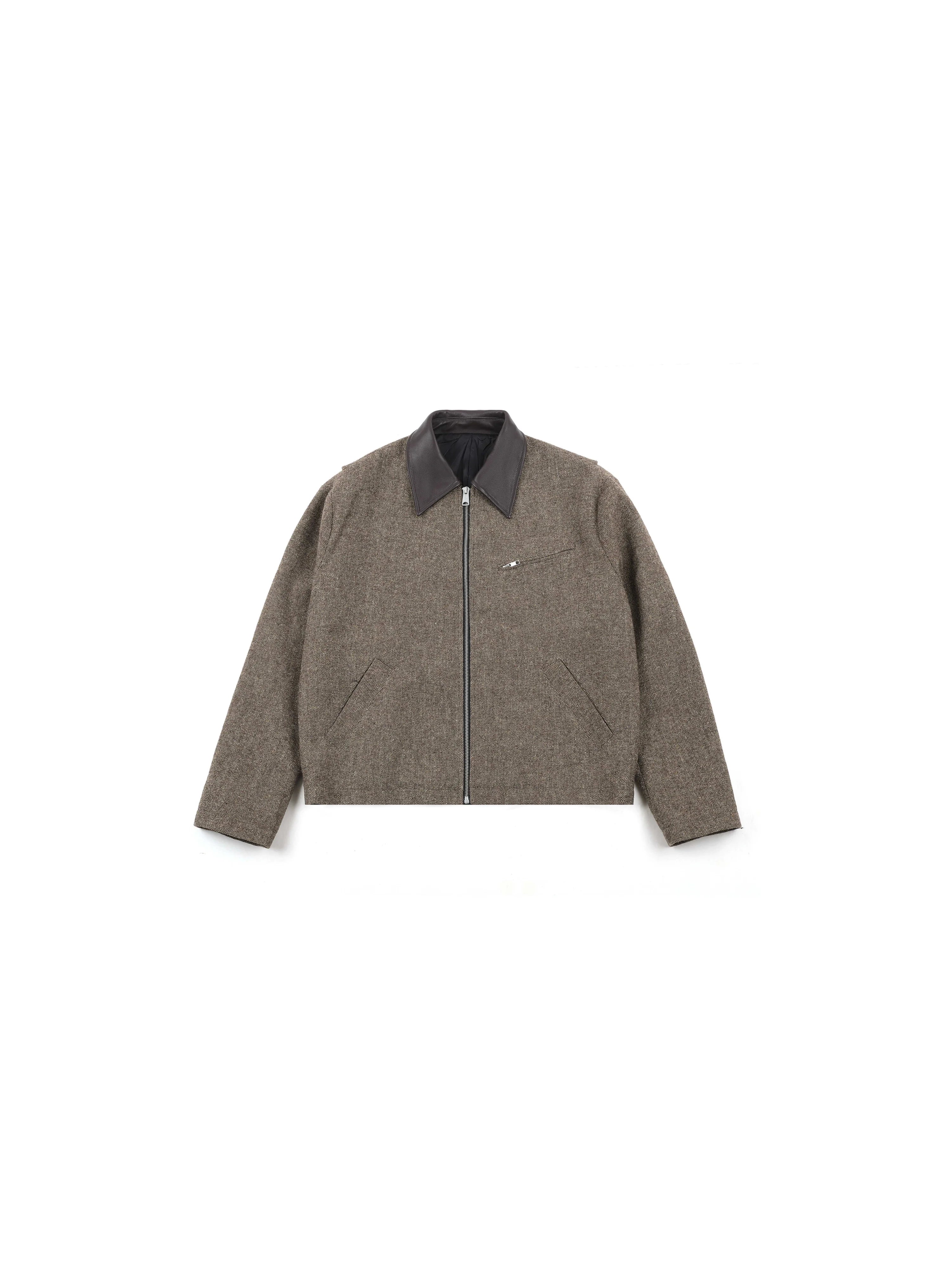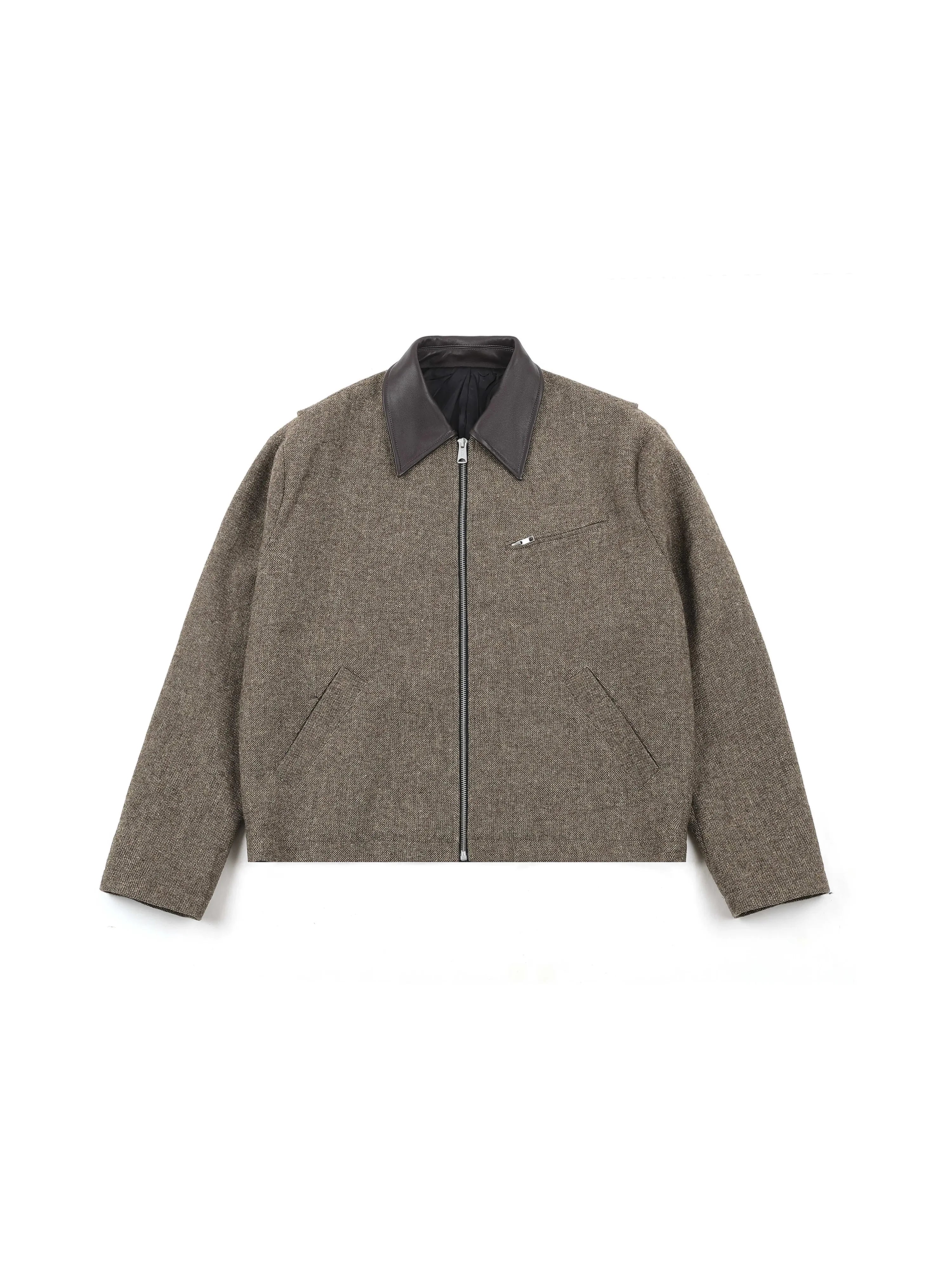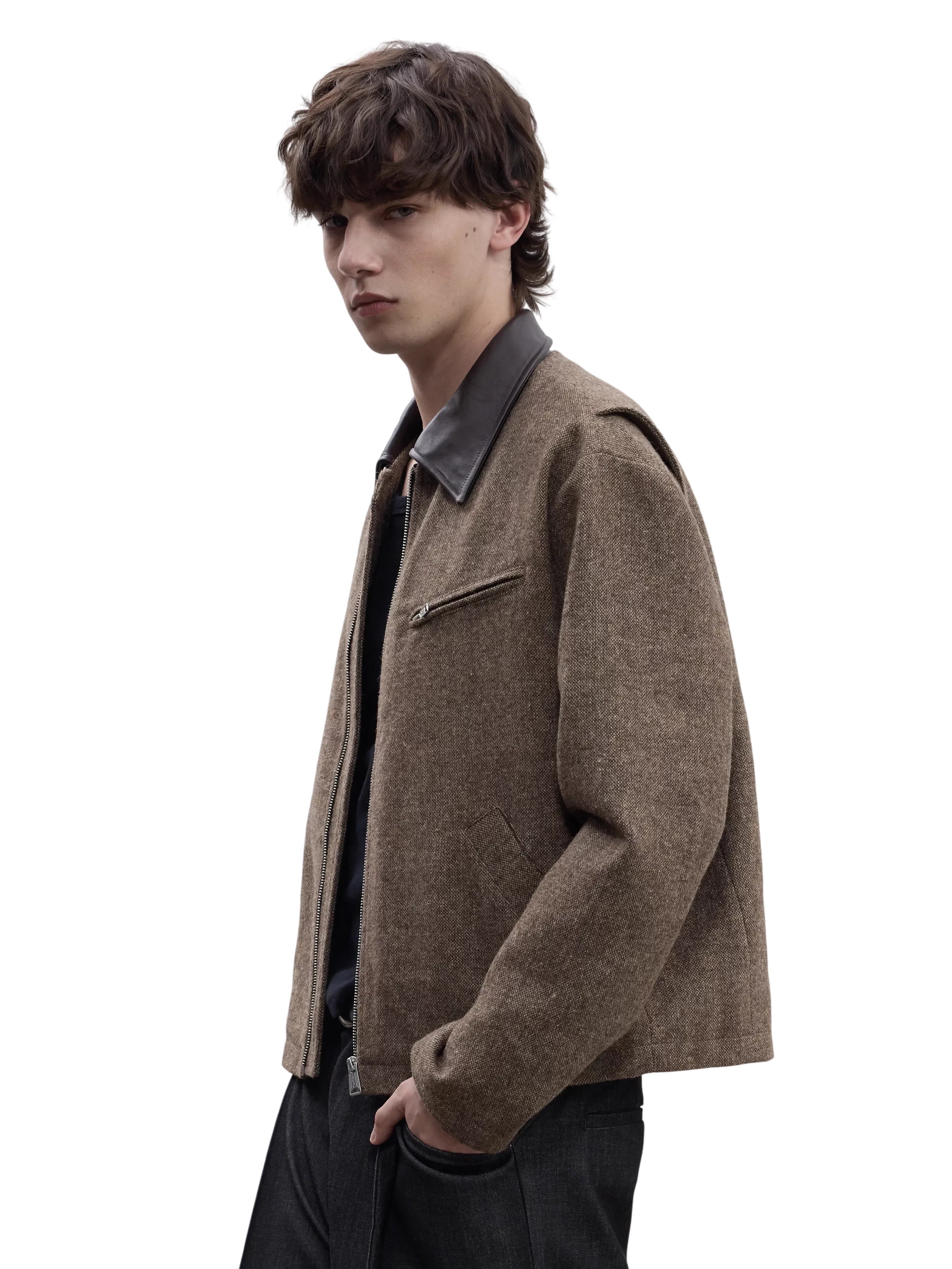 This men's short jacket features a structured silhouette crafted from textured wool tweed, offering a refined and modern appearance. Designed for cooler weather, it includes a statement leather-look collar that adds a vintage-inspired contrast. Functional details include a full zip-up front, slanted side pockets, and a discreet zippered chest pocket on the left. The boxy fit enhances its casual yet elevated appeal, making it a versatile outerwear choice.
