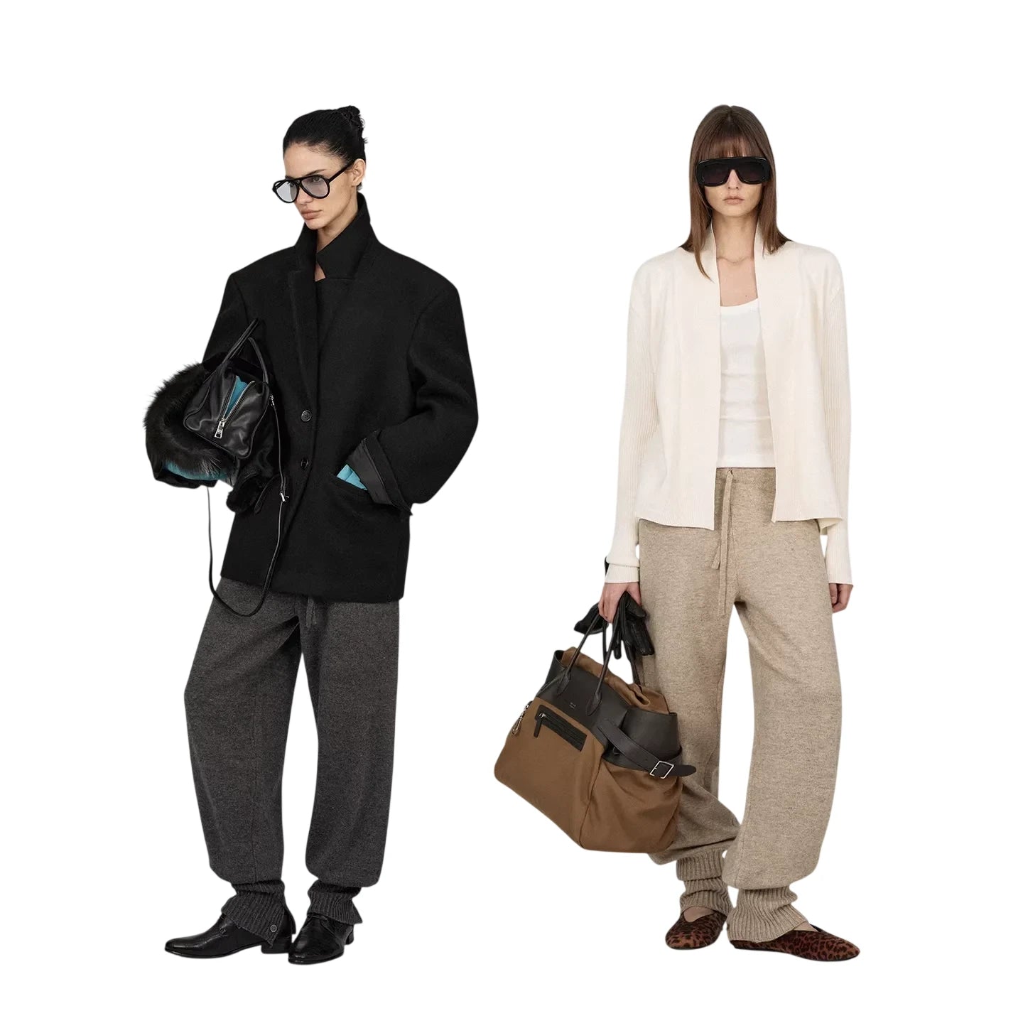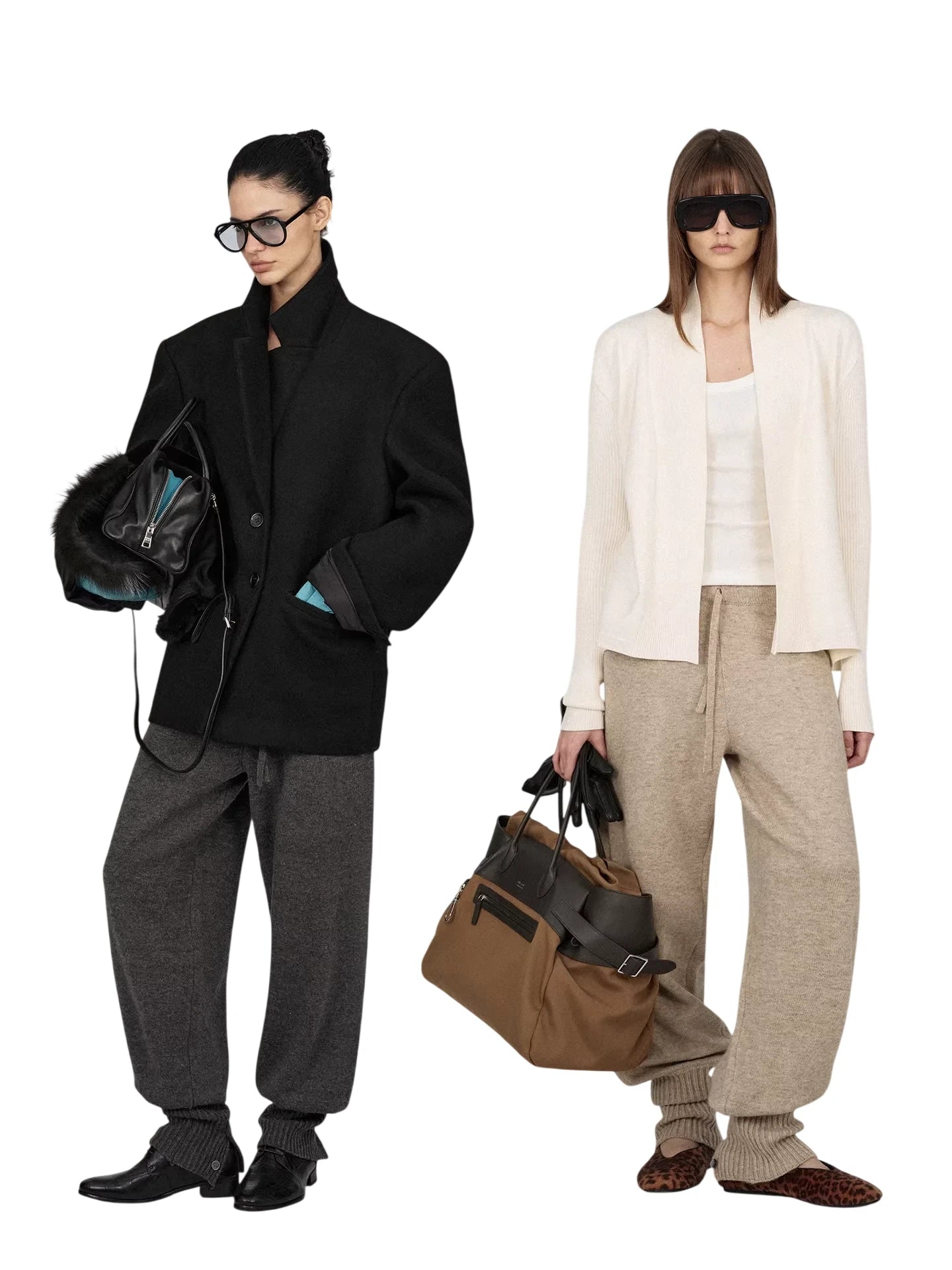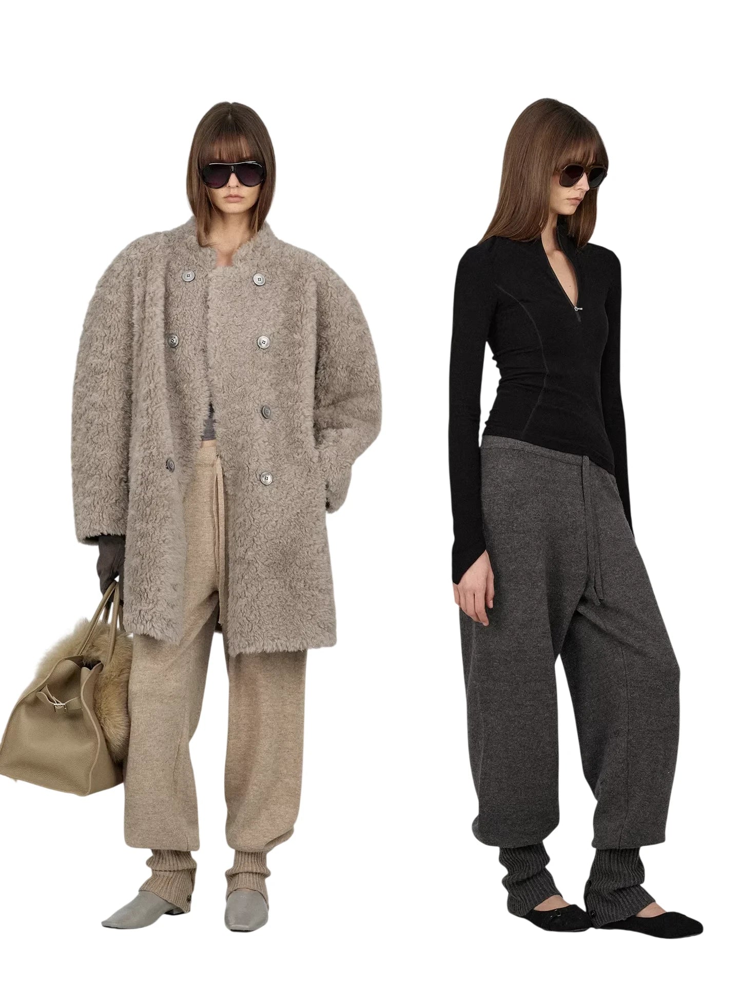 Elevate your casual wardrobe with these adjustable cuff wool knit lounge pants, designed for supreme comfort and modern versatility. Made from premium Australian wool, these relaxed-fit pants feature a drawstring waist and a soft, knitted texture perfect for everyday wear. The adjustable petal-style cuffs add a touch of unique style, offering a customizable fit. Ideal for layering or enjoying cozy days at home. Styled here on female models in both classic gray and neutral beige hues.