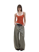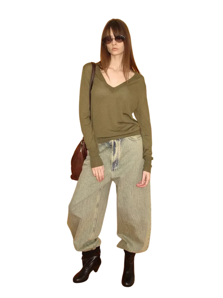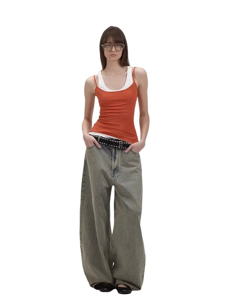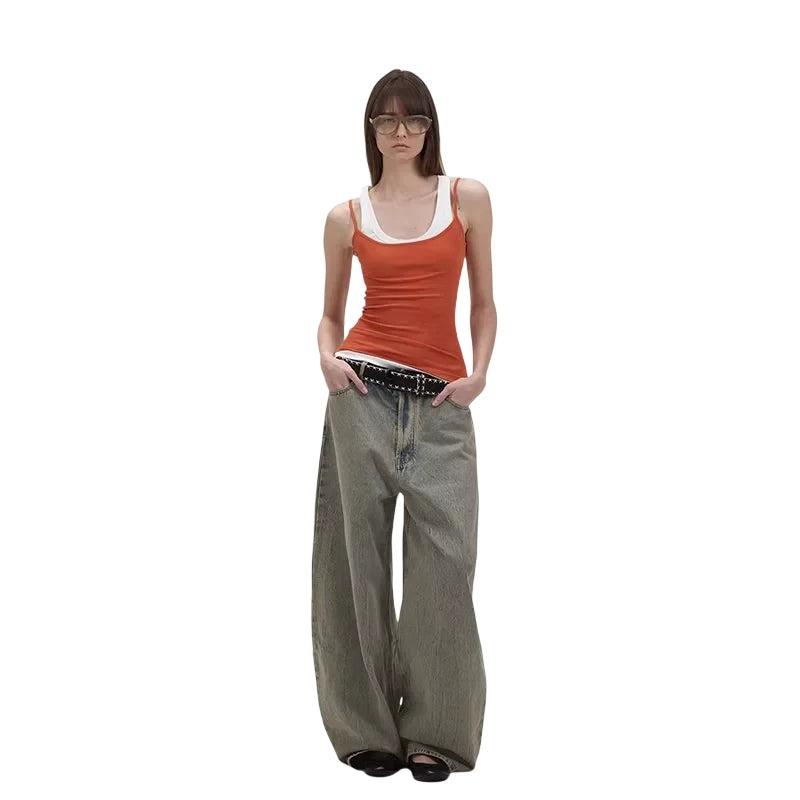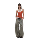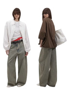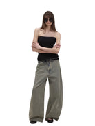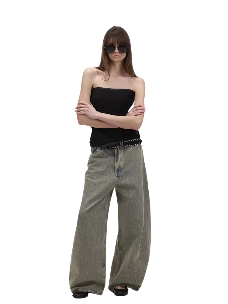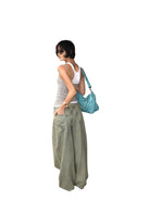 Elevate your streetwear look with these brushed wide-leg jeans featuring a low-rise fit and a faded green wash. Designed for a bold and modern aesthetic, these oversized jeans are perfect for effortless layering. Styled here on a female model with a black studded belt and open-toe footwear, they bring together comfort and edge in a statement silhouette.