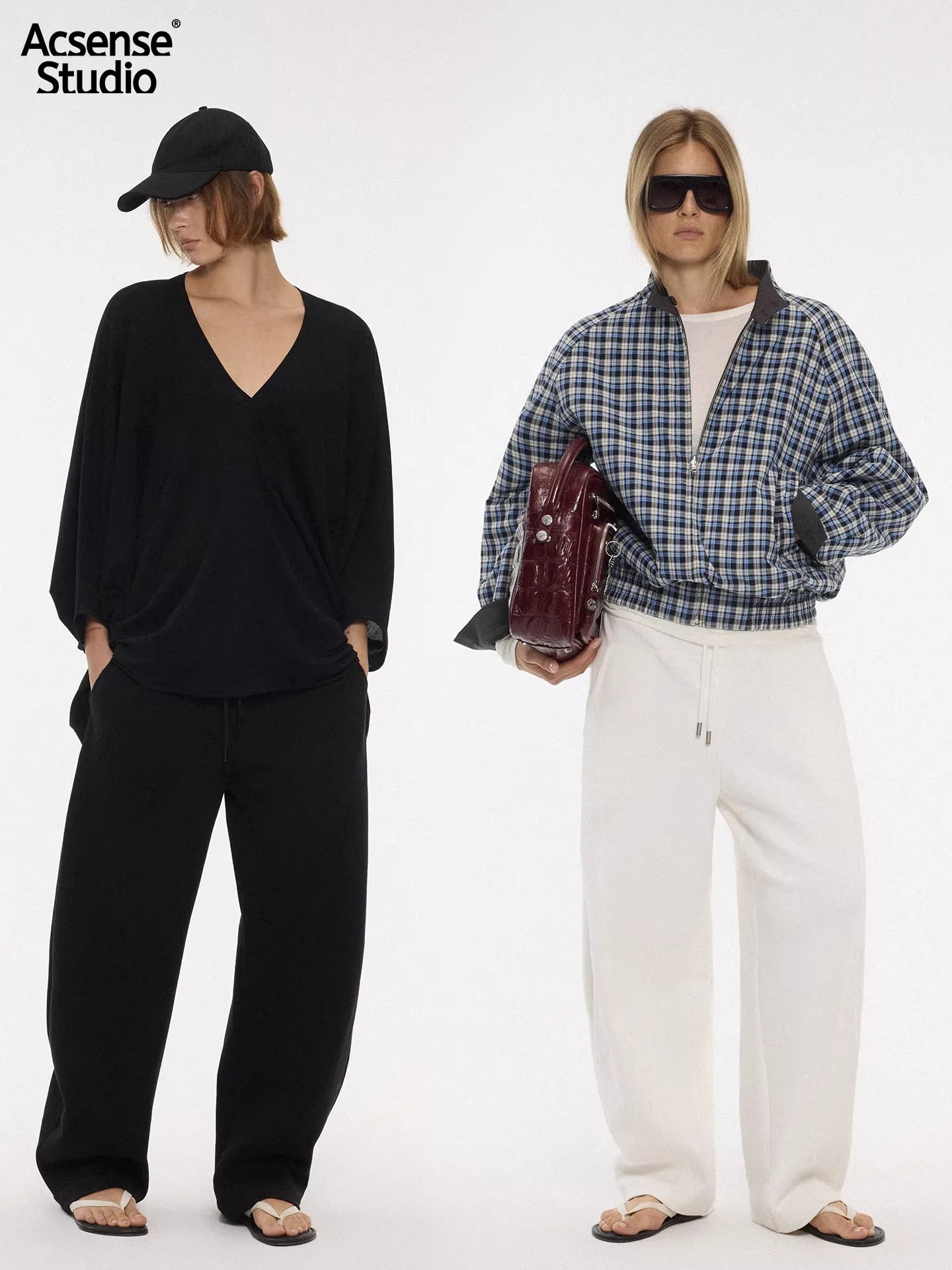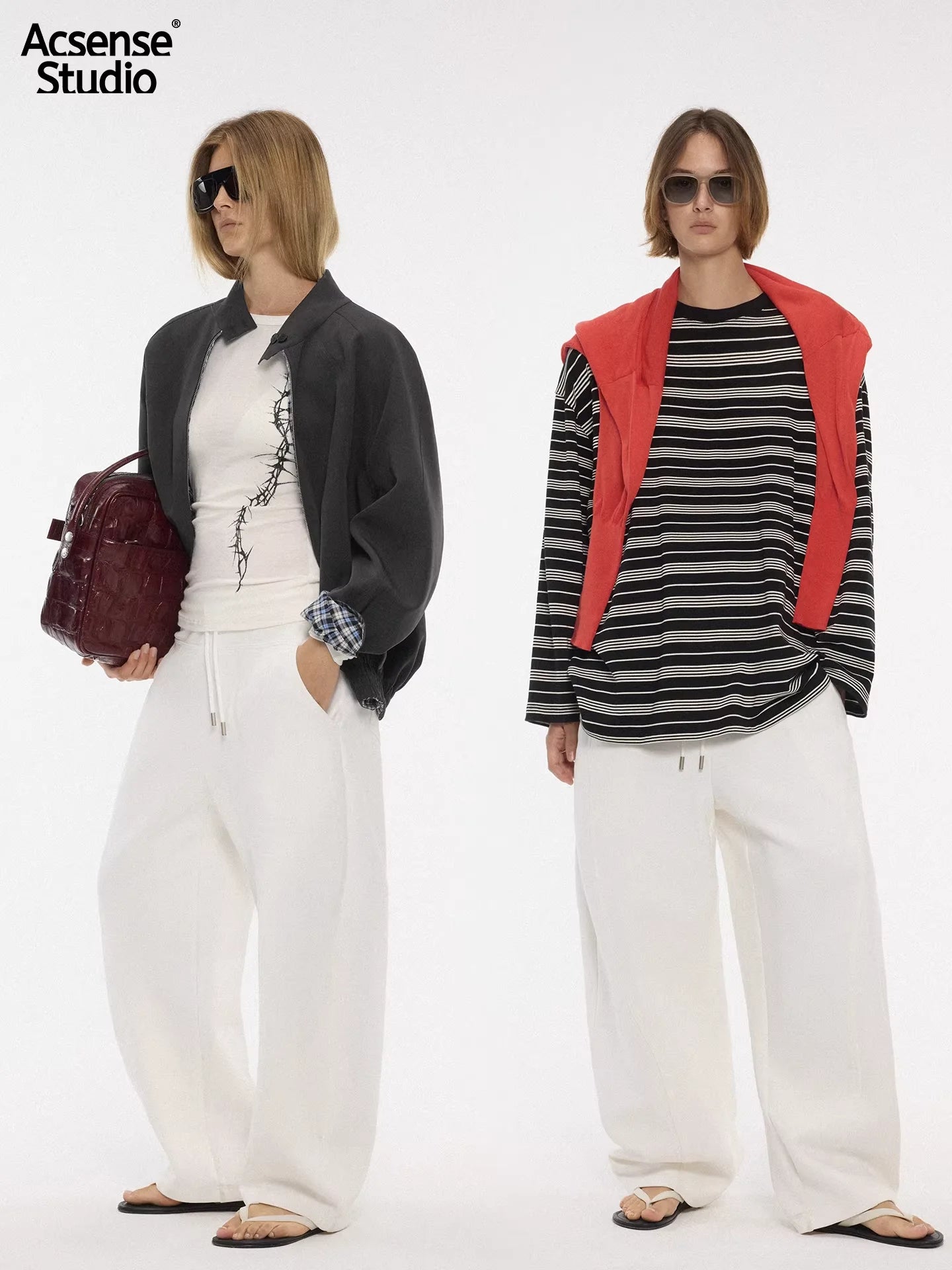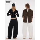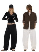 The female model on the left pairs the loose black drawstring pants with a cropped zip-up hoodie, creating a bold and casual look. On the right, a gender-neutral ensemble showcases the white jogger pants styled with a brown utility jacket and white top, perfect for a laid-back yet polished outfit.