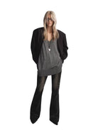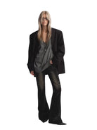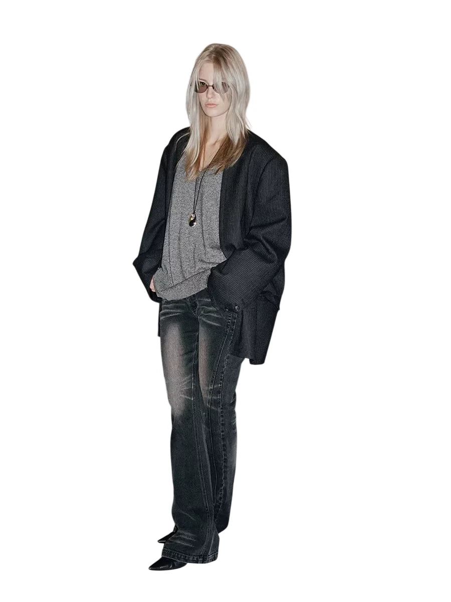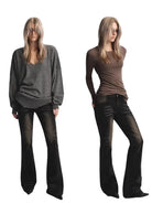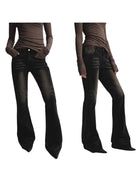Elevate your casual wardrobe with these high-rise flared jeans designed for a flattering, slimming fit. Featuring a whiskered and metallic washed finish with subtle distressed details, these jeans deliver a vintage-inspired, urban edge. The stretch fabric ensures comfort and mobility, while the flared silhouette adds a stylish flair. Perfect for streetwear looks, they pair effortlessly with both relaxed and fitted tops for versatile styling options.
