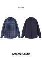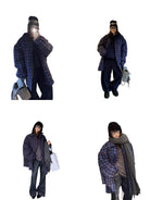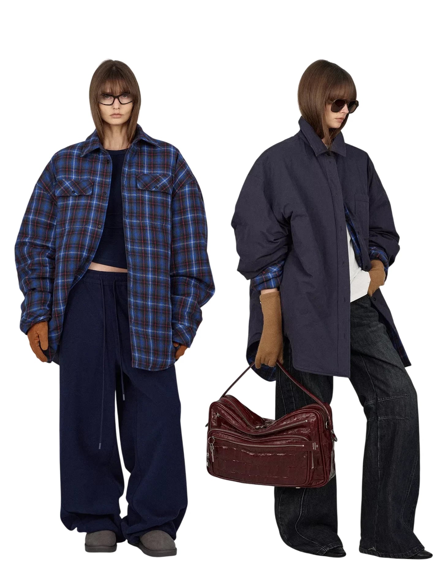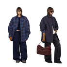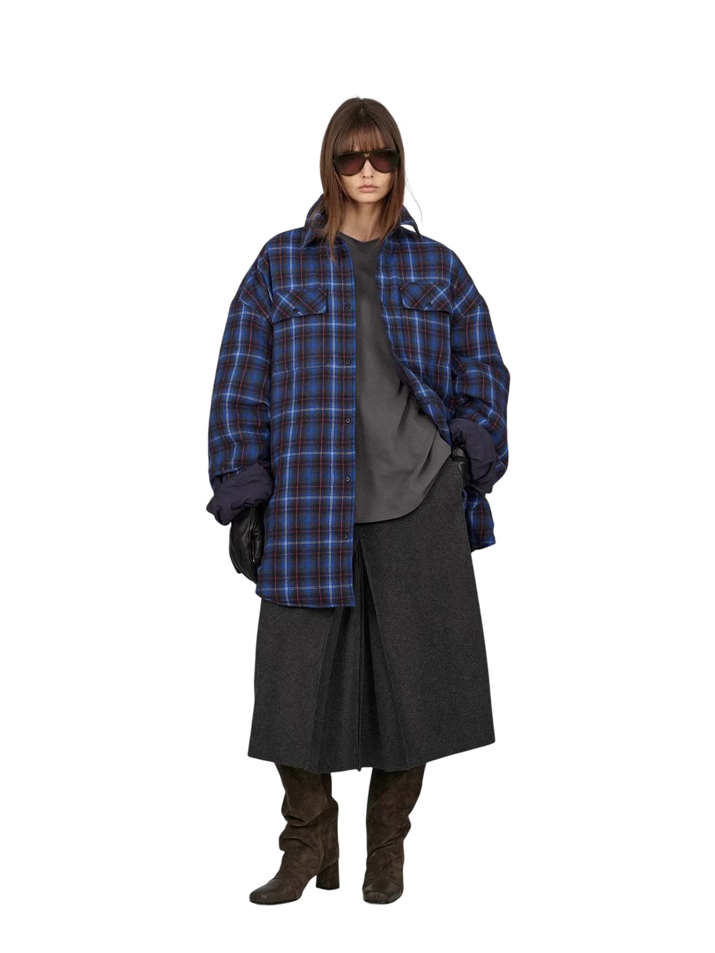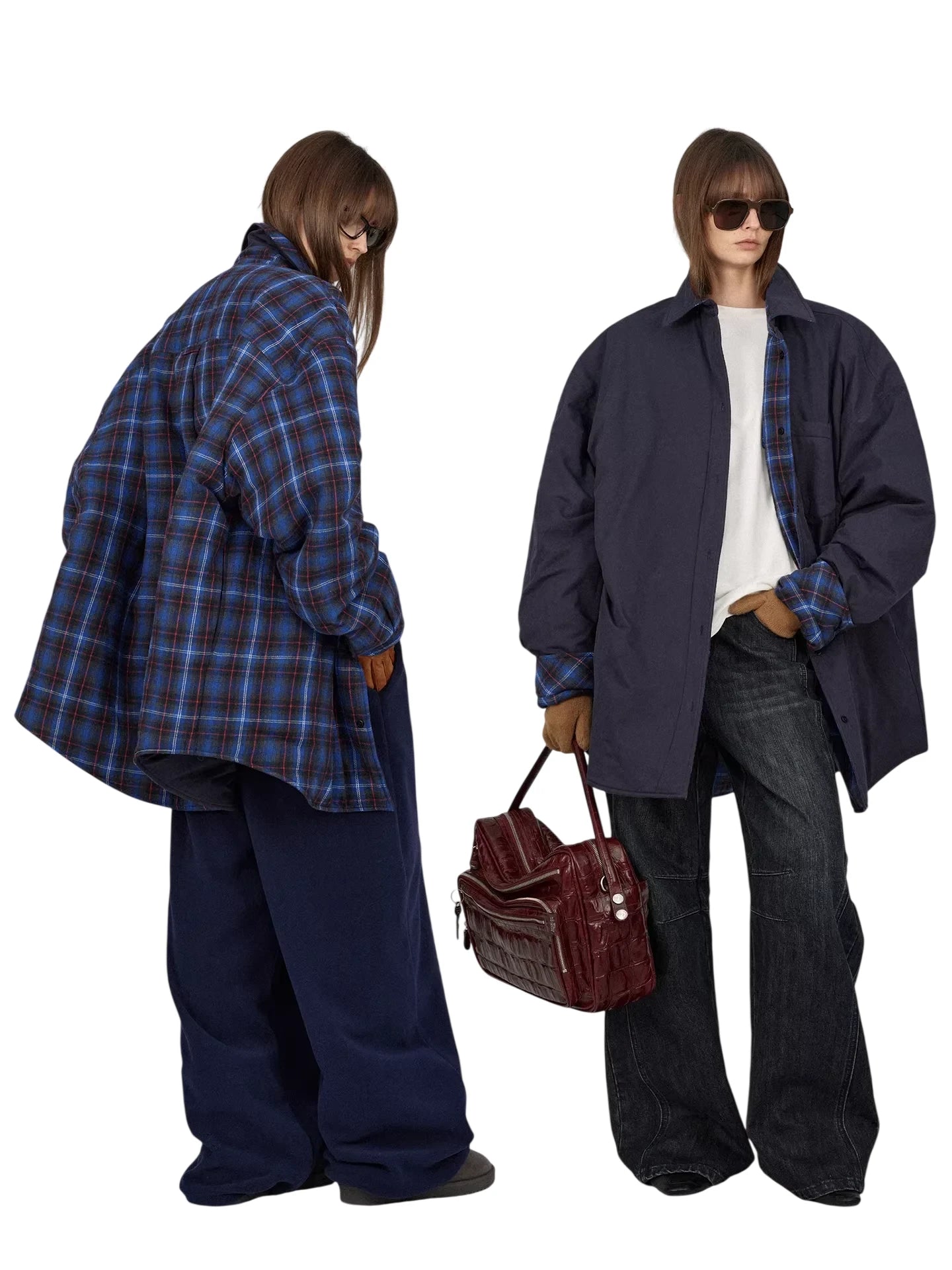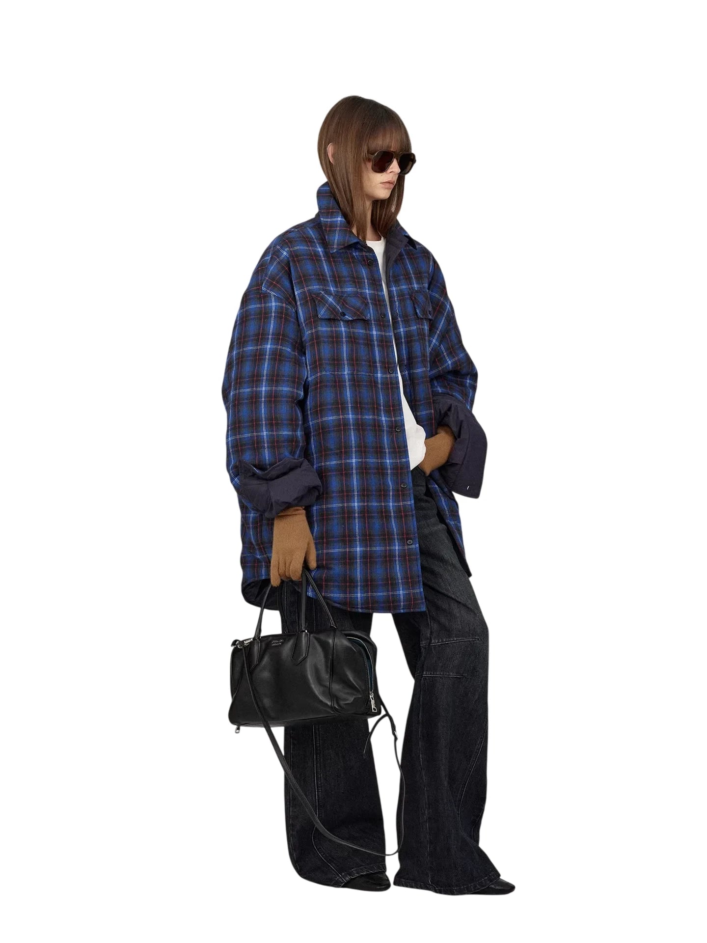 This women's relaxed fit shirt jacket features a convertible lapel design and an oversized silhouette for a modern, street-ready look. Crafted in a blue and black plaid pattern, it can be styled as a top layer or worn beneath outerwear for versatile layering. With wide-leg pants and minimalistic accessories, it complements an androgynous, urban aesthetic ideal for contemporary wardrobes.