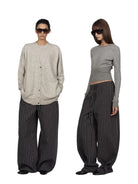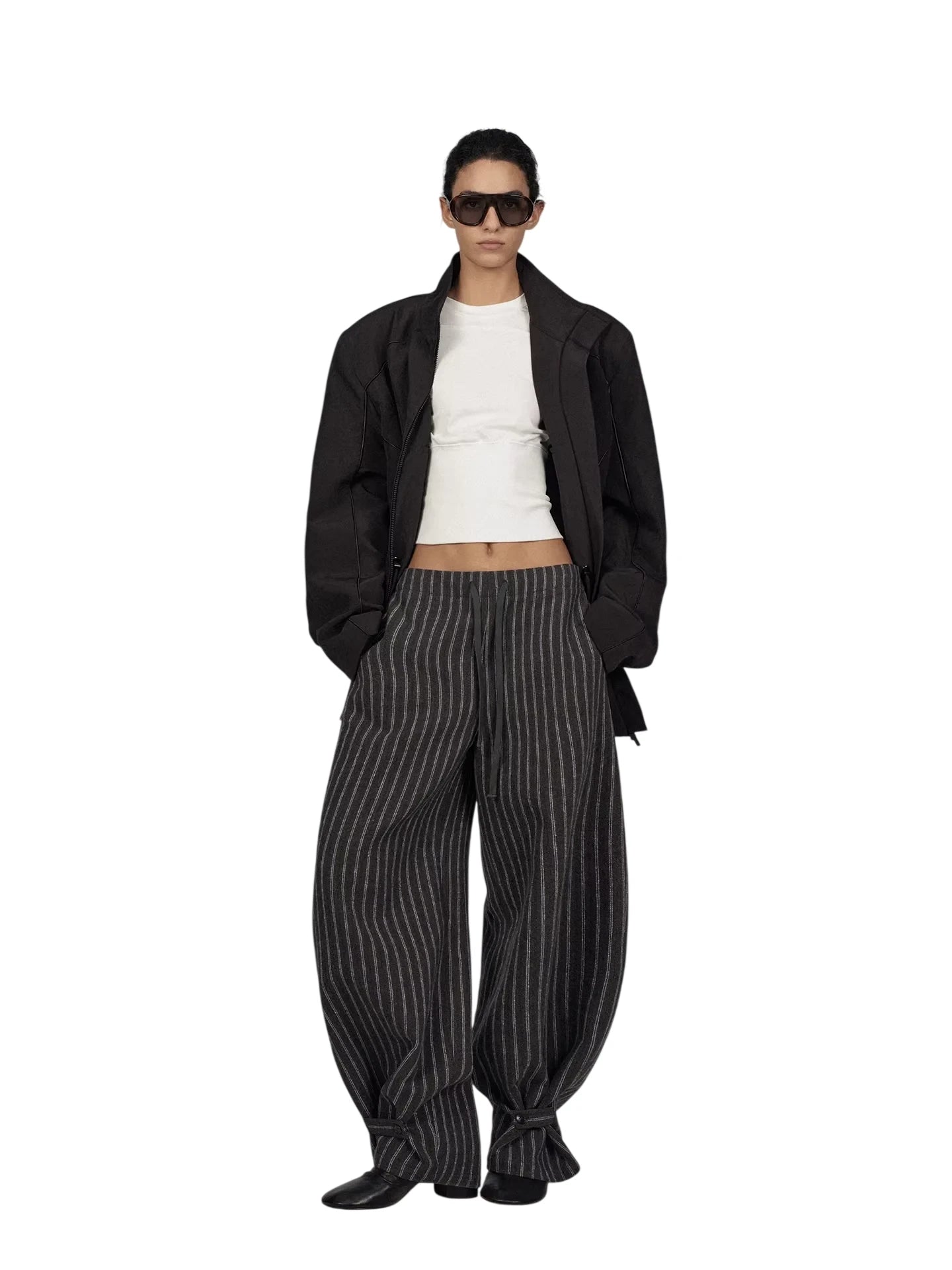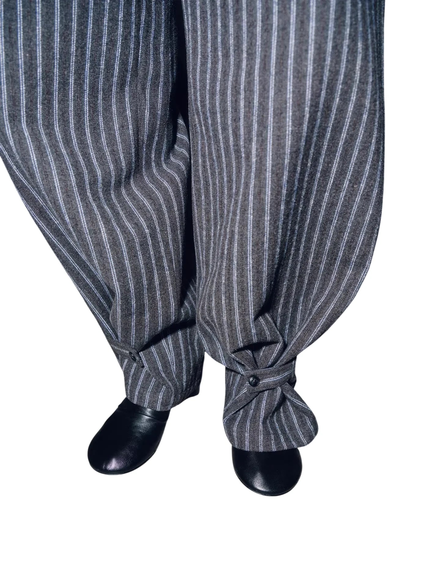 Elevate your casual wardrobe with these relaxed pinstripe wide-leg pants, designed for effortless style and comfort. Featuring an elastic drawstring waist and cuffed hems, these trousers offer a flattering high-rise fit and a dramatic drape that flows over your favorite shoes. The subtle stripe pattern and versatile dark gray tone add a touch of classic sophistication, perfect for modern, minimalist outfits.