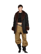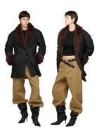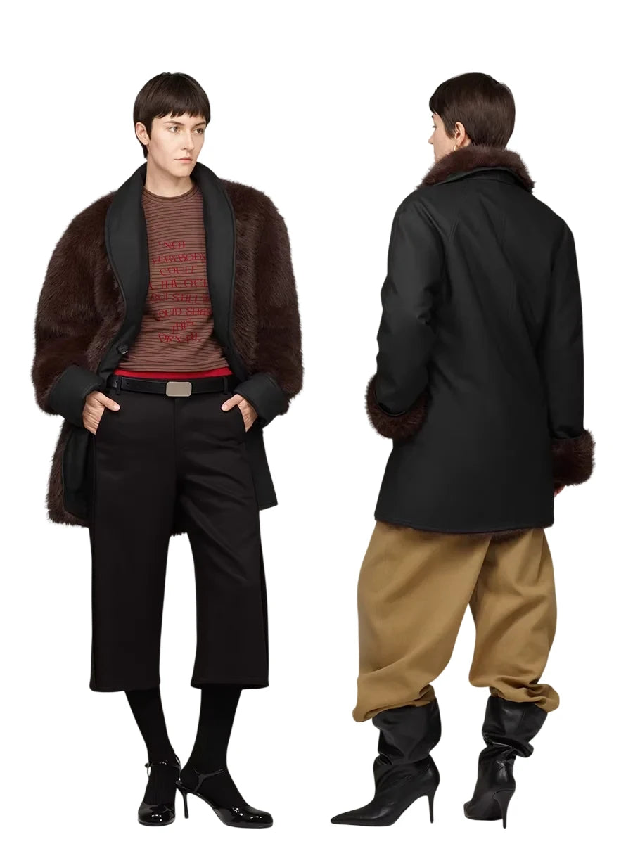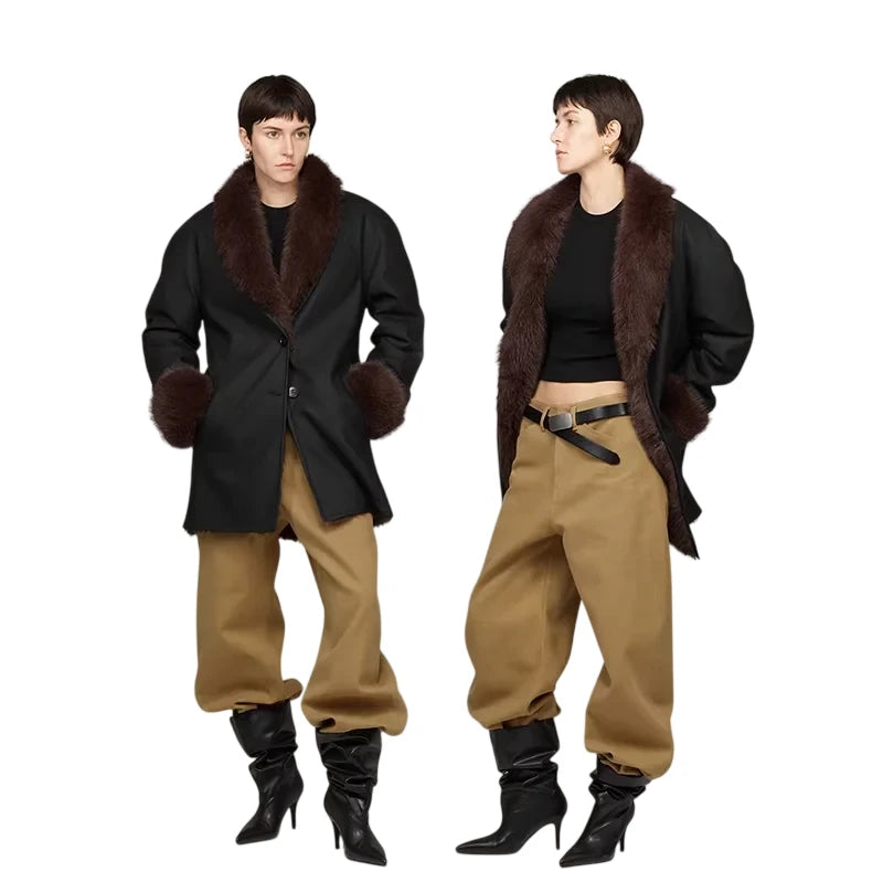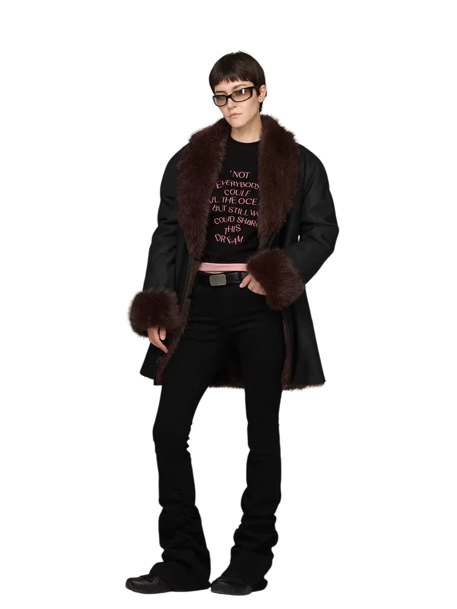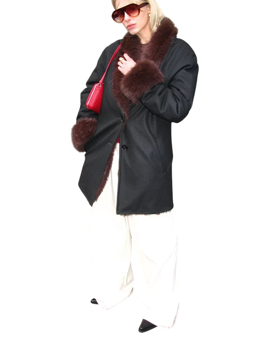This gender-neutral winter coat showcases a sophisticated blend of style and function. Crafted from eco-friendly, mousse-feel PU leather, it features a reversible design with plush dark brown faux fur accents on the collar and cuffs. The oversized silhouette offers a bold, editorial look while maintaining comfort and warmth. Perfect for high-fashion styling, it can be worn buttoned for a polished finish or open to reveal layered outfits underneath.