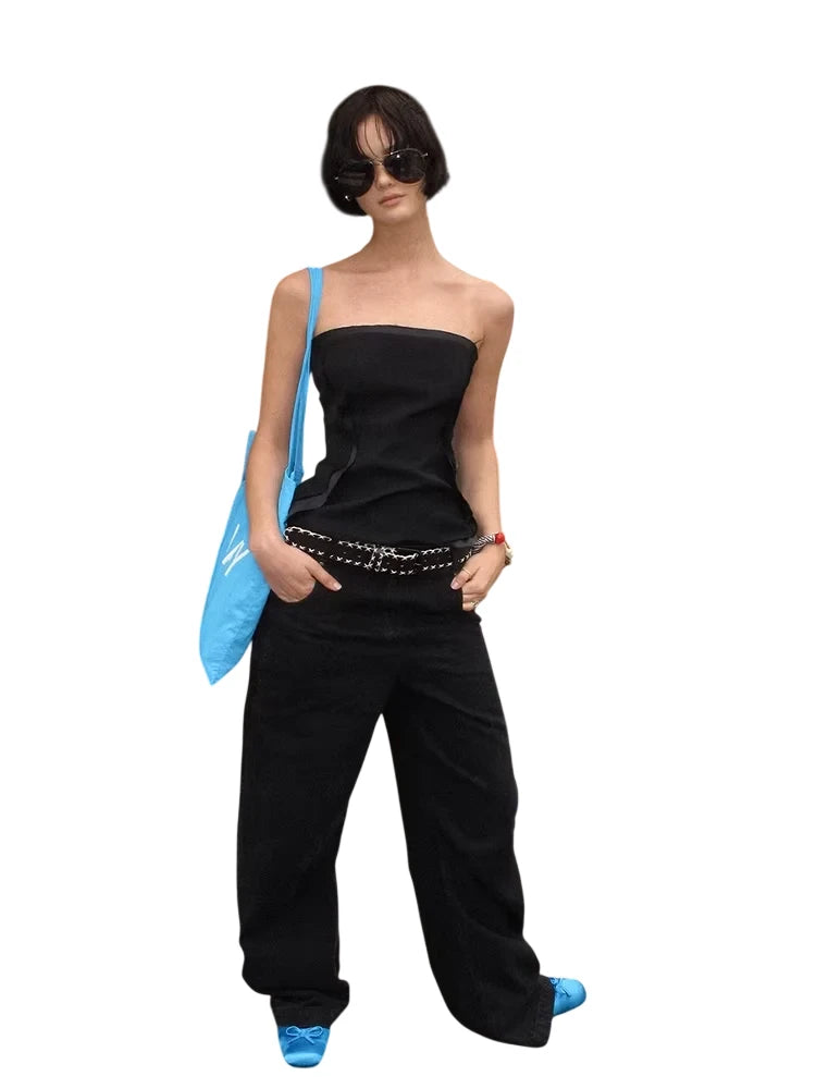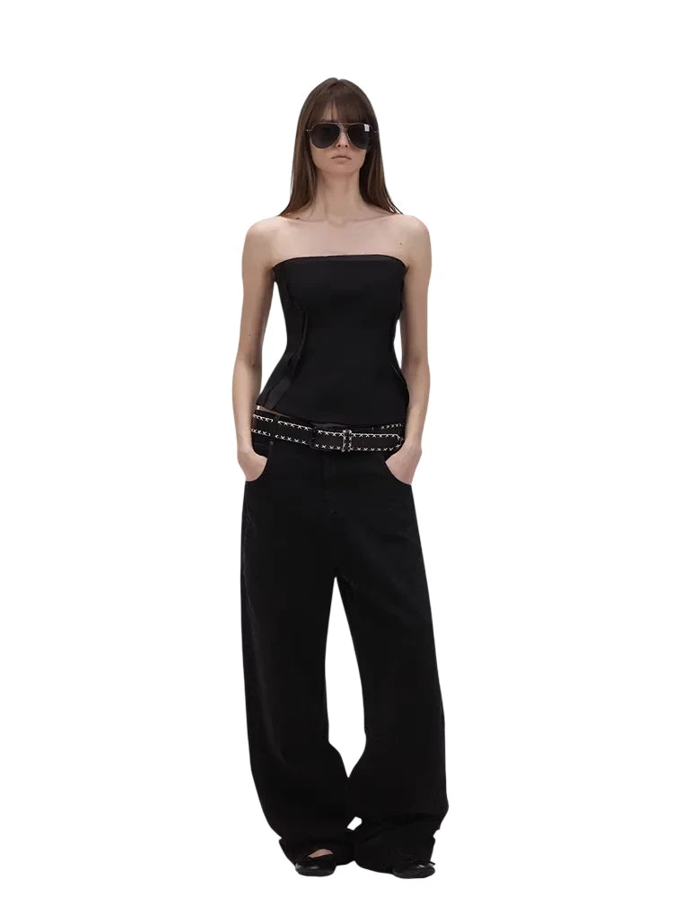 Elevate your wardrobe with this striking satin patchwork corset tube top. Designed for a bold, fashion-forward look, this strapless top features structured paneling for a sculpted silhouette and a modern ant waist detail. Ideal for creating a sleek ensemble, it pairs effortlessly with high-waisted trousers or skirts. Styled here on a female model, this piece exudes contemporary edge and sophistication.