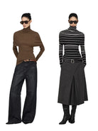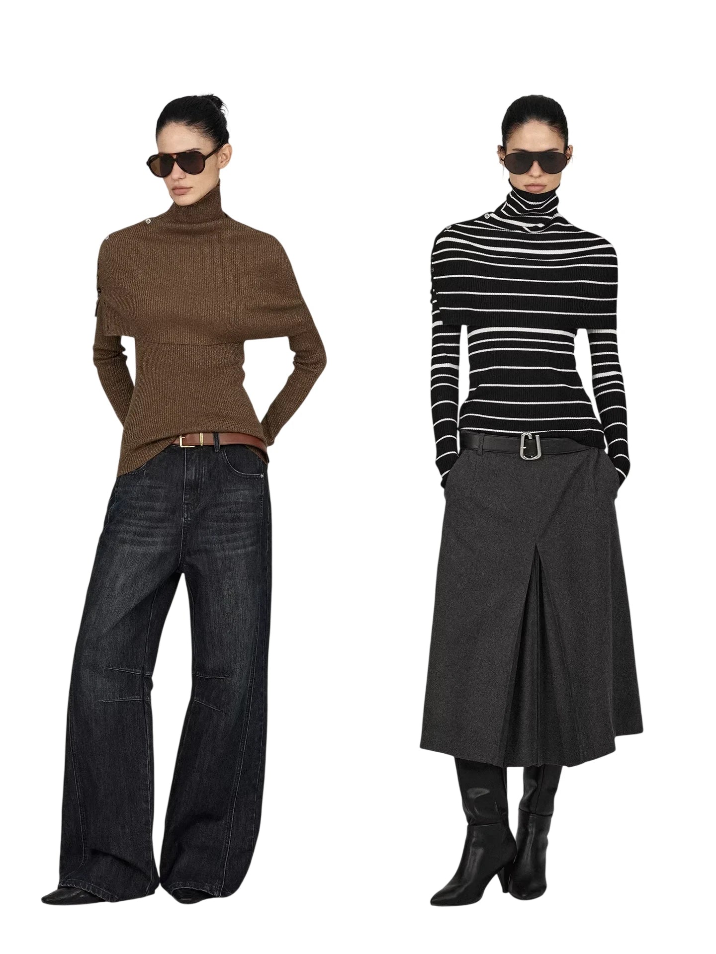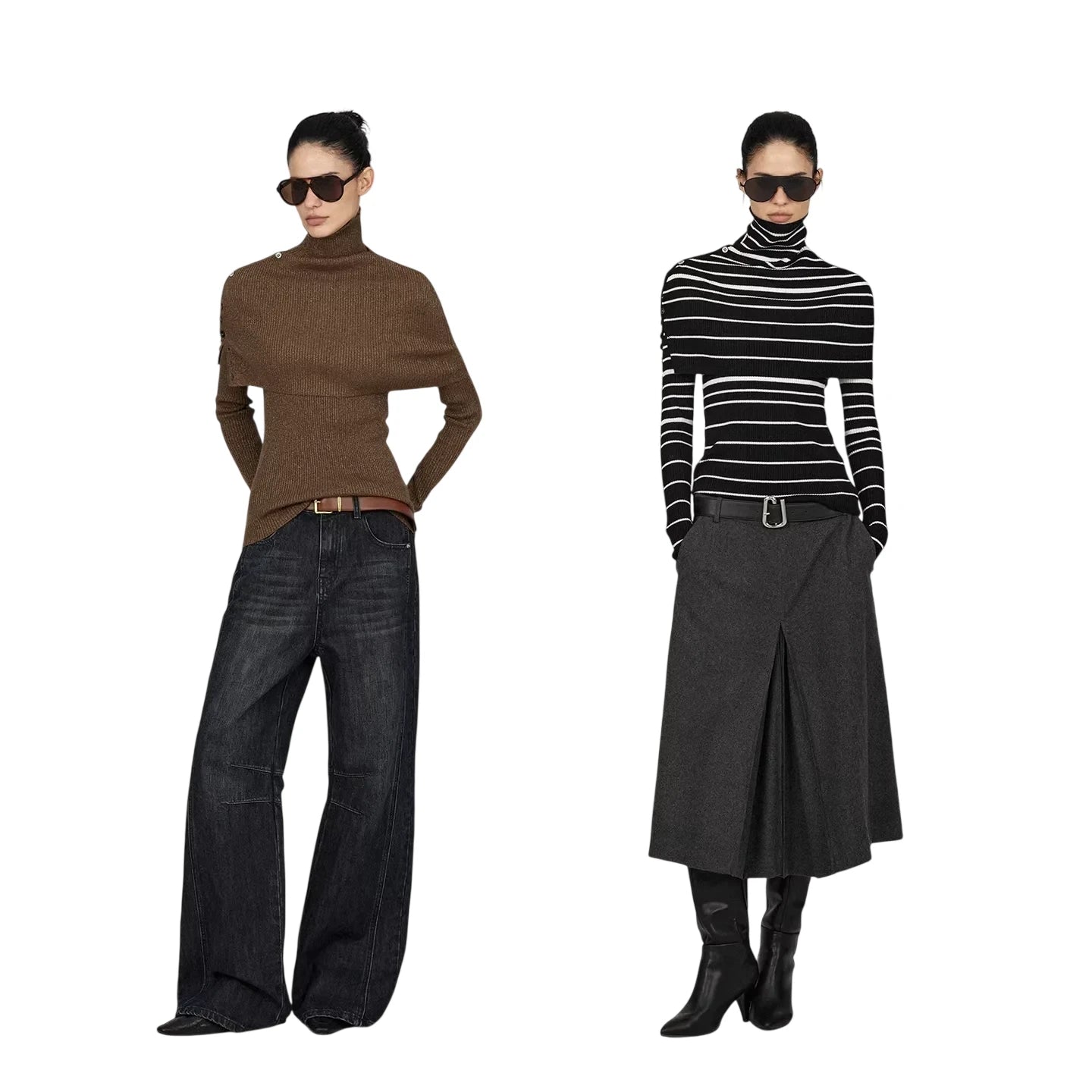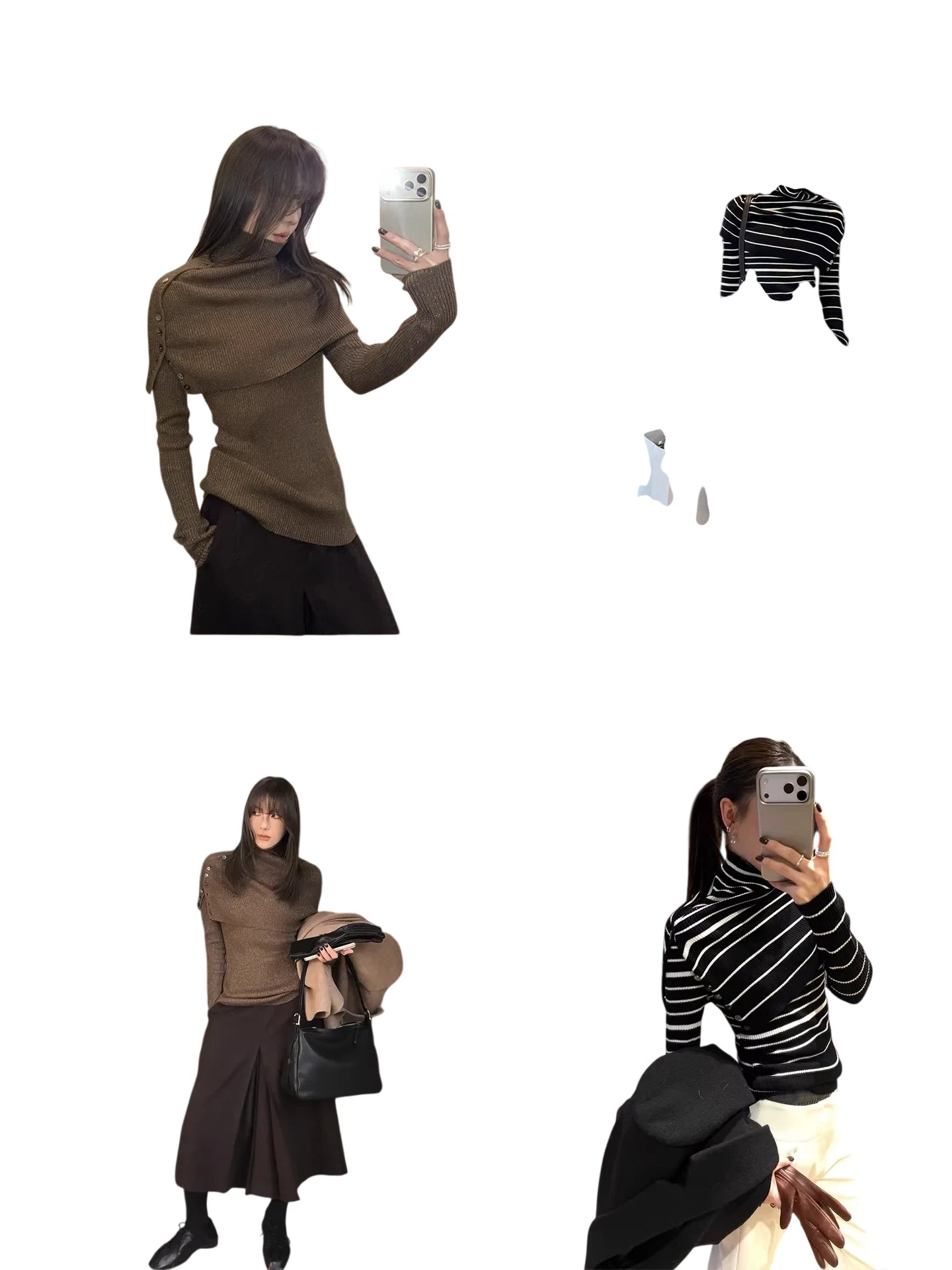 Elevate your fall and winter wardrobe with this sophisticated women's two-piece knit set. Designed for a streamlined silhouette, the set features a slim fit and is crafted from stretch wool for comfort and warmth. A distinctive half turtleneck cape adds a touch of modern elegance, making this ensemble ideal for both casual and refined occasions. Perfect for layering and versatile styling, this set brings effortless chic to cool-weather dressing.