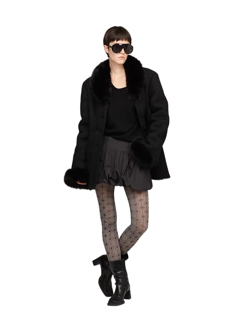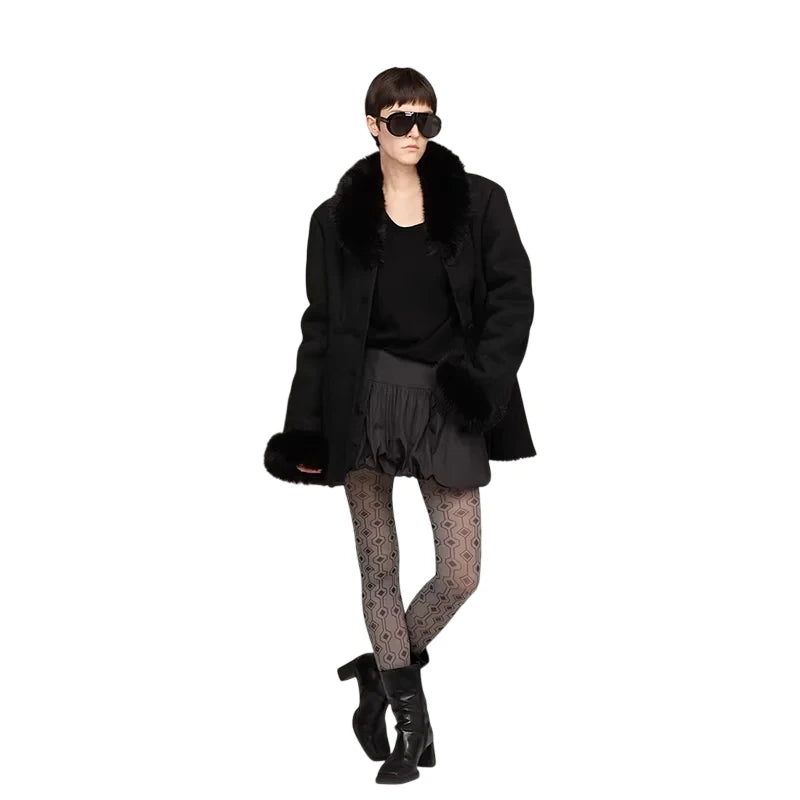 Worn by a female model, the look is styled with a black inner top, a short ruffled skirt, patterned gray sheer tights, and leather ankle boots for a chic and cozy outfit perfect for the colder months.