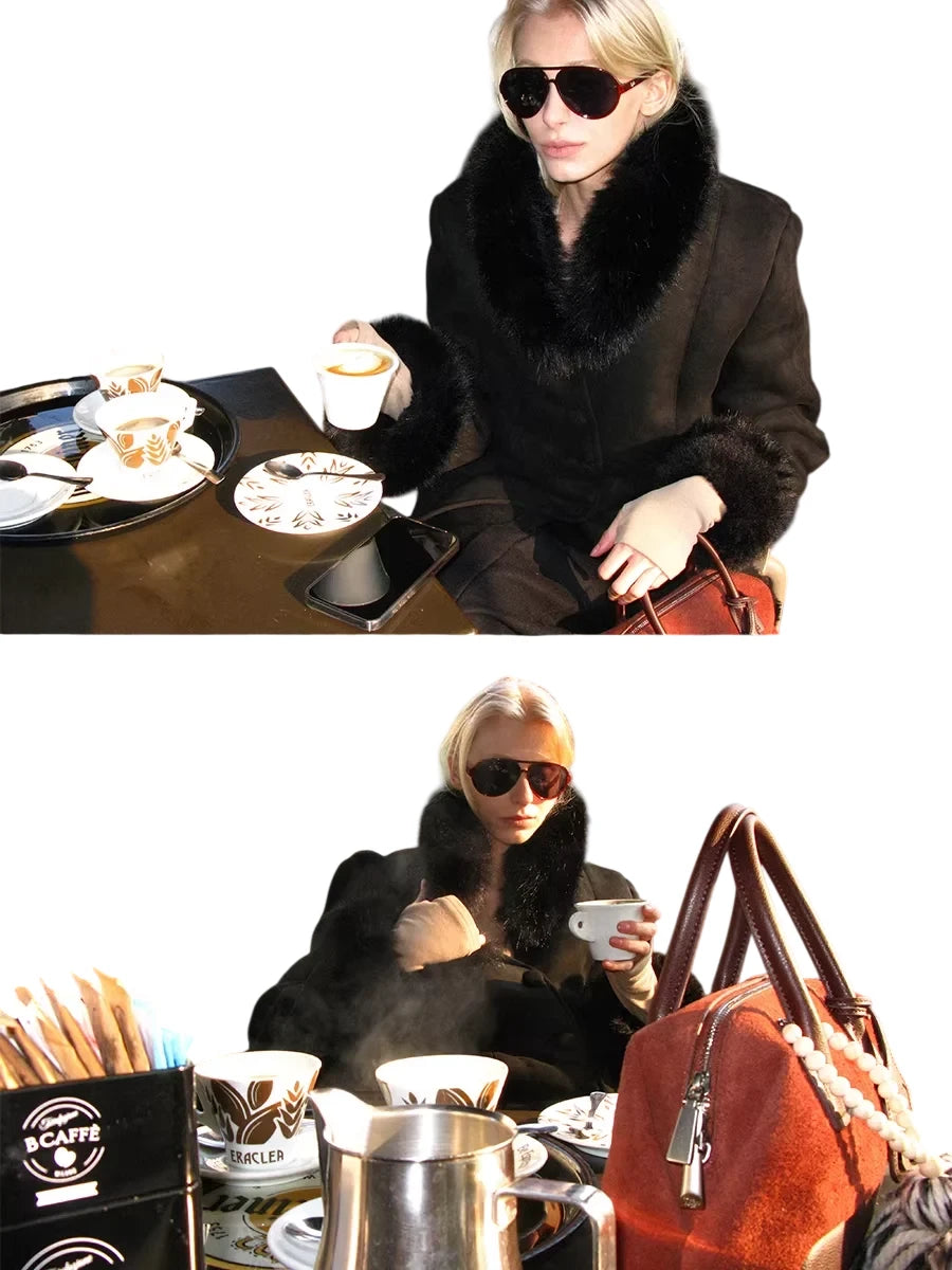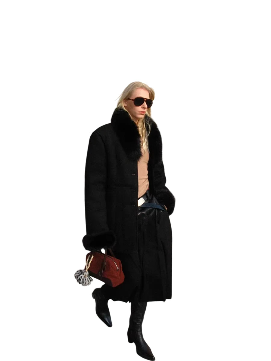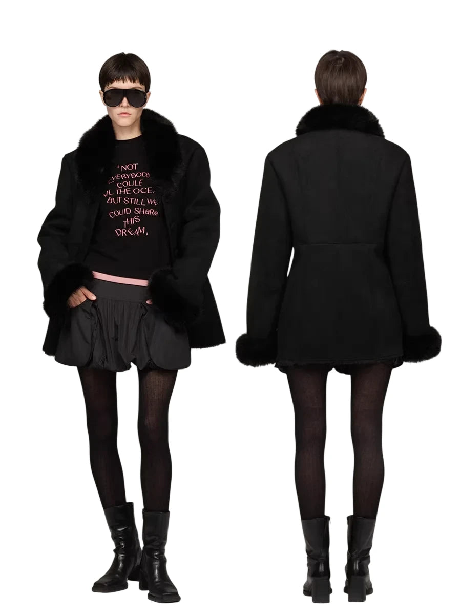 This vintage-inspired black suede jacket is designed for the winter season, featuring a flattering waist-tightening fit. The jacket is lined with soft faux fur for warmth and enhanced with a detachable fur collar, offering versatile styling options. Matching fur-trimmed cuffs add a touch of elegance.