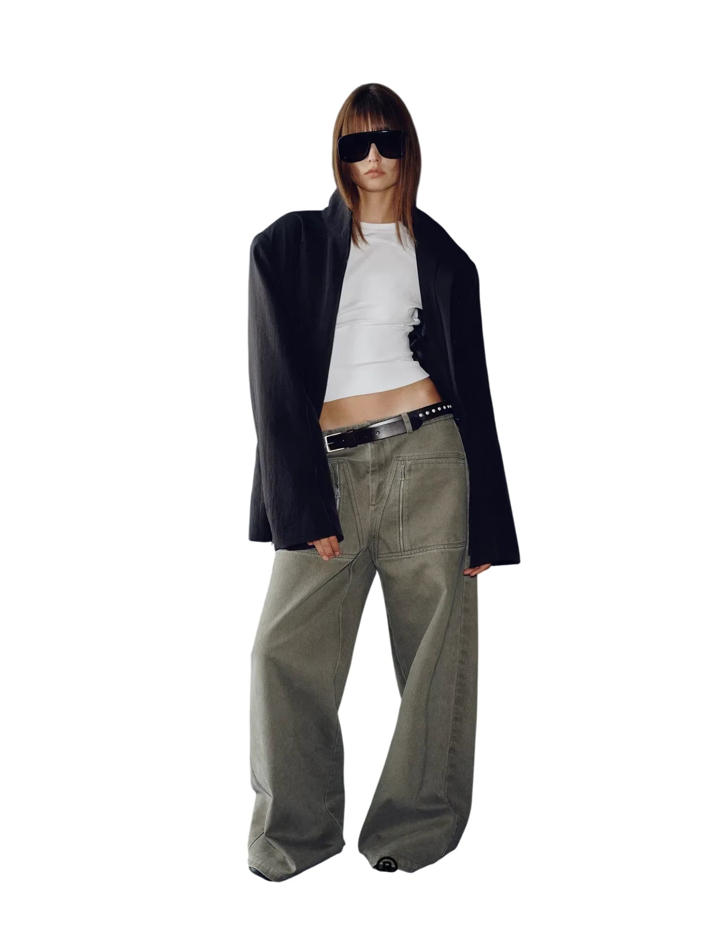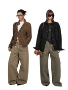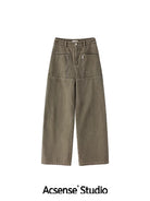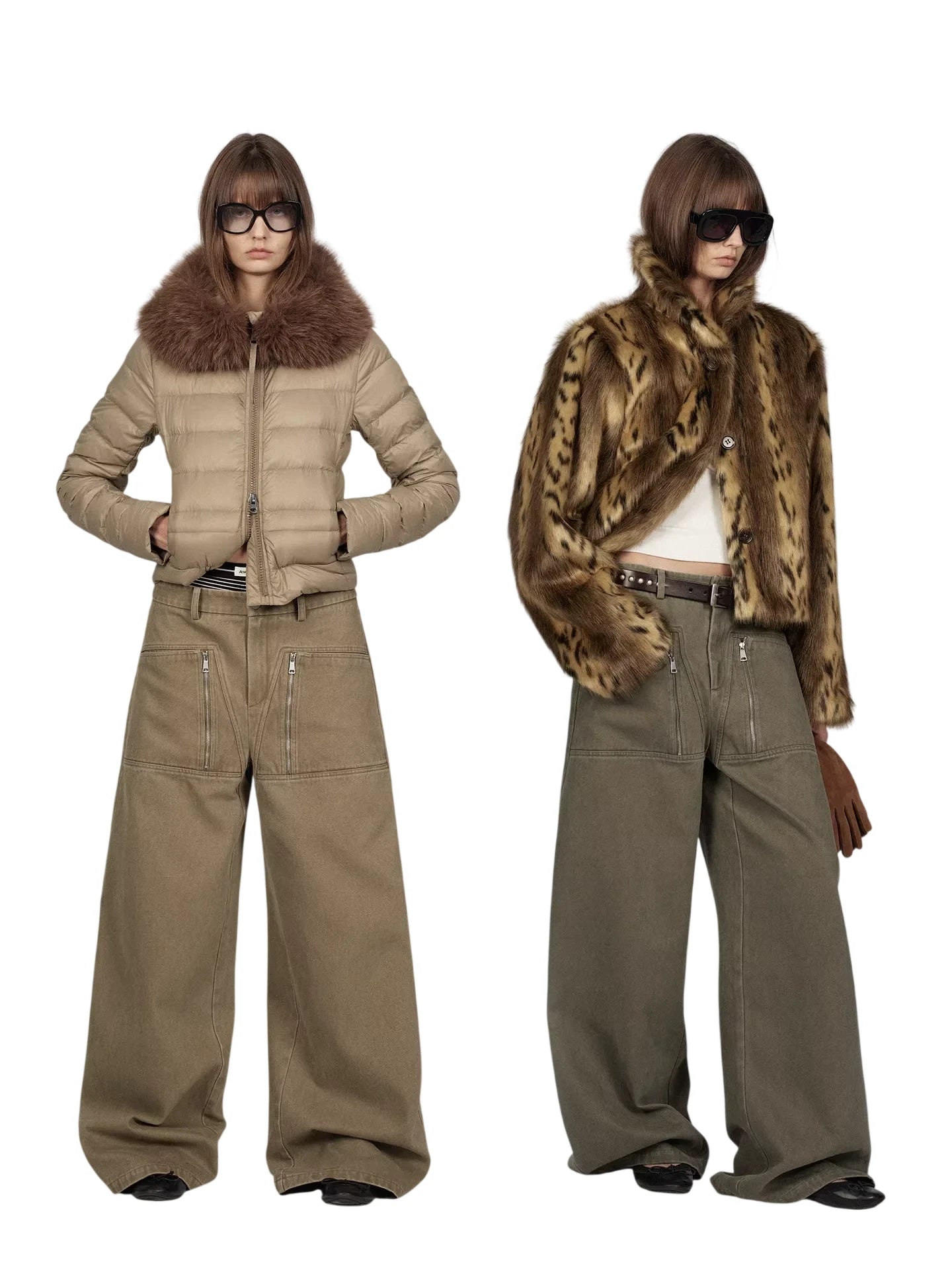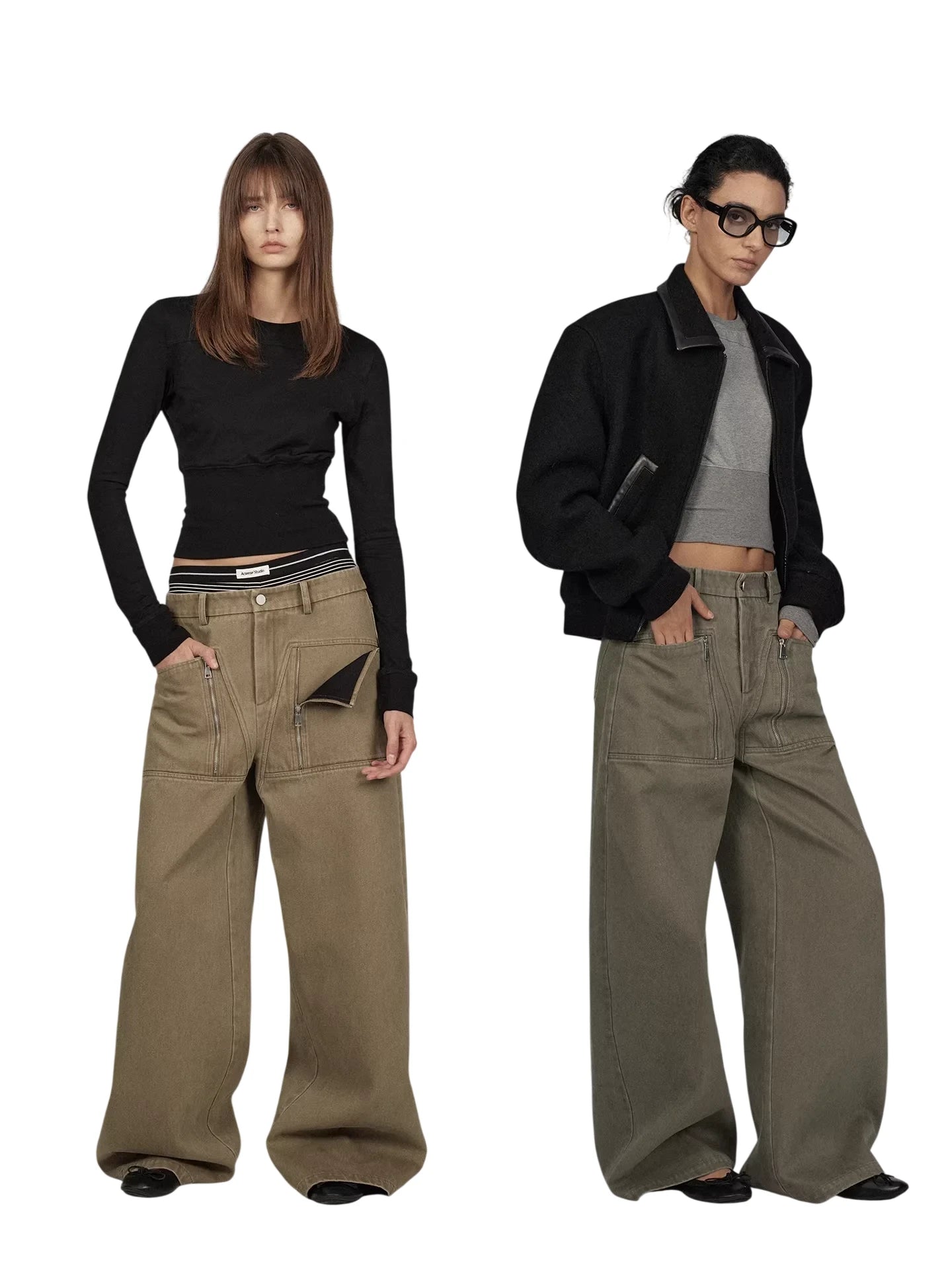 Elevate your casual wardrobe with these washed denim wide-leg pants designed for a modern, relaxed fit. Featuring intricate stitch detailing and a bold front zipper flap, these straight-cut pants offer both comfort and edge. Ideal for layered winter looks, they complement cropped jackets and standout accessories. Designed for women seeking effortless style with a touch of utilitarian flair.