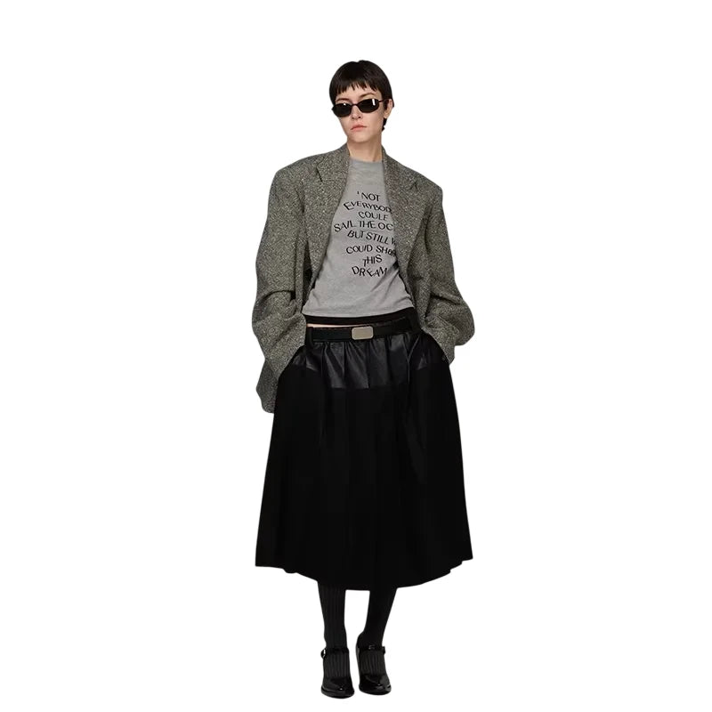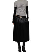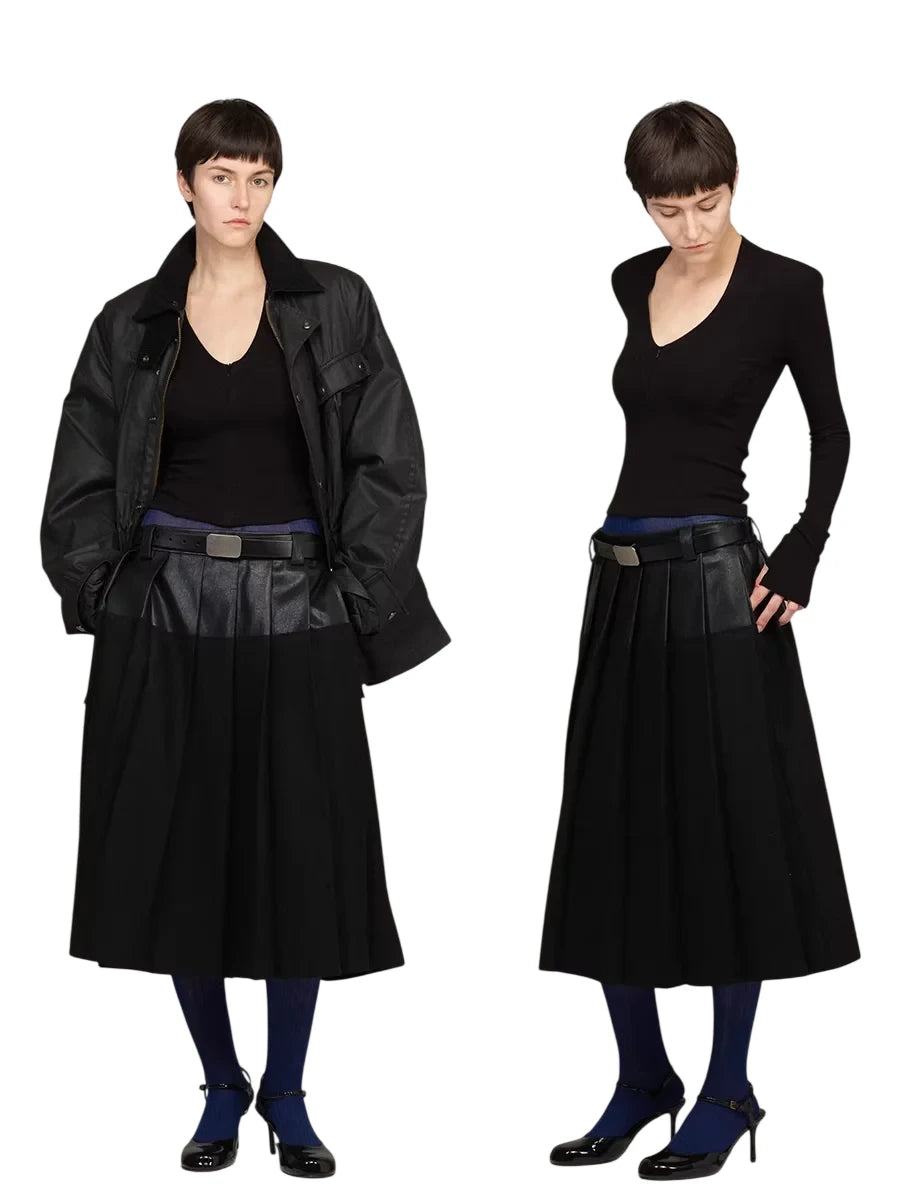 This women's high-waisted midi skirt features a striking patchwork design combining wool and leather-like materials. The piece includes pleated detailing and is secured with a belt featuring a rectangular buckle at the waist, adding structure and modern flair. Perfect for layering with statement outerwear or styled solo for a bold silhouette.