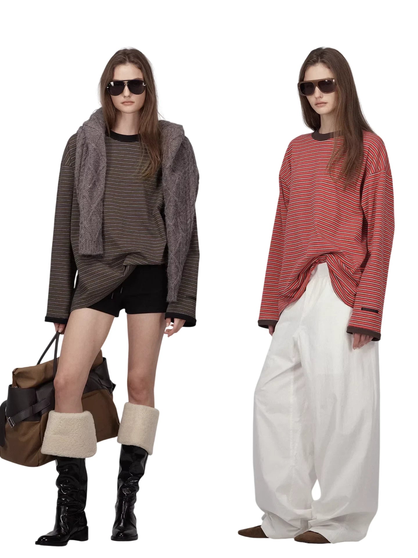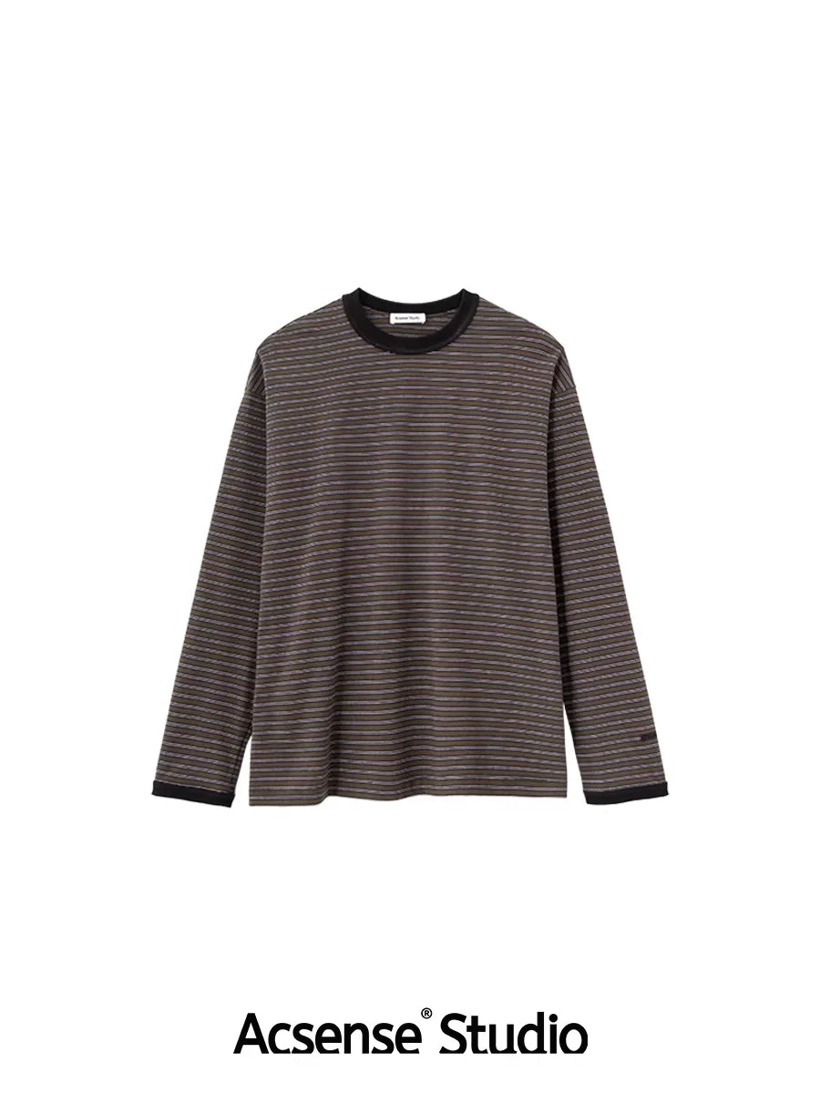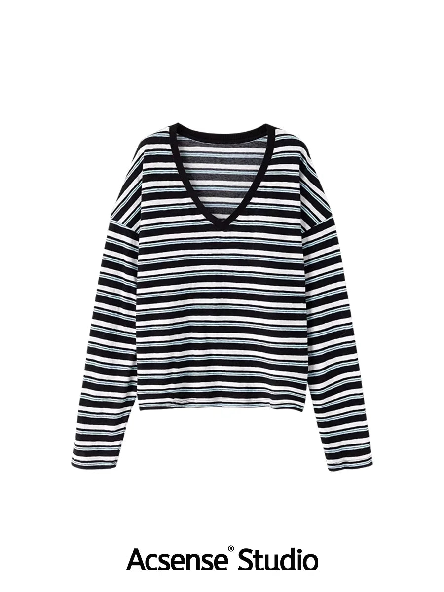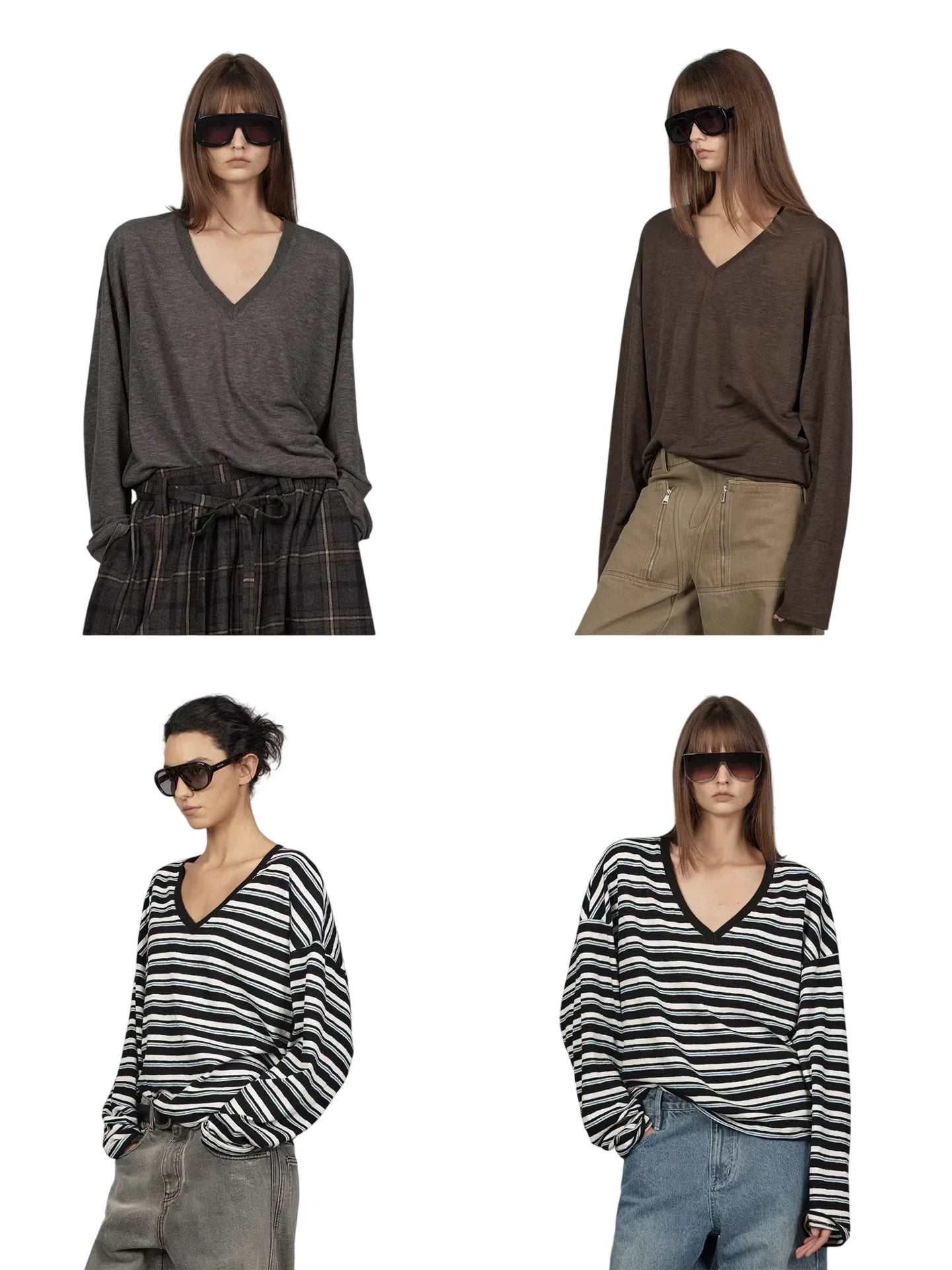 ACSENSE STUDIO Relaxed V-Neck Long Sleeve Striped and Solid Top