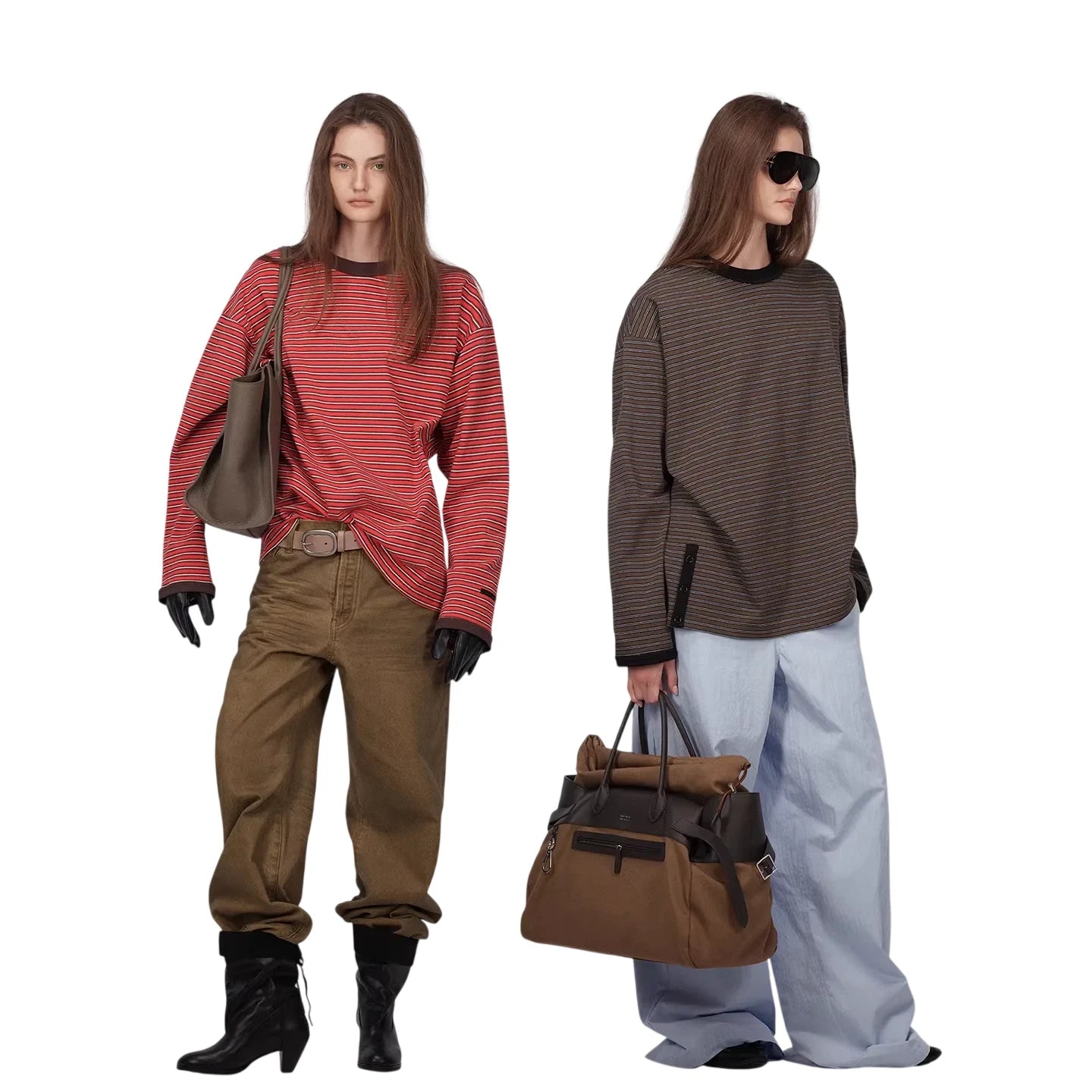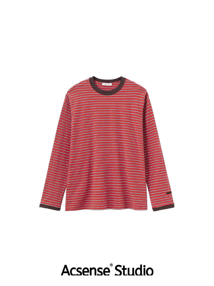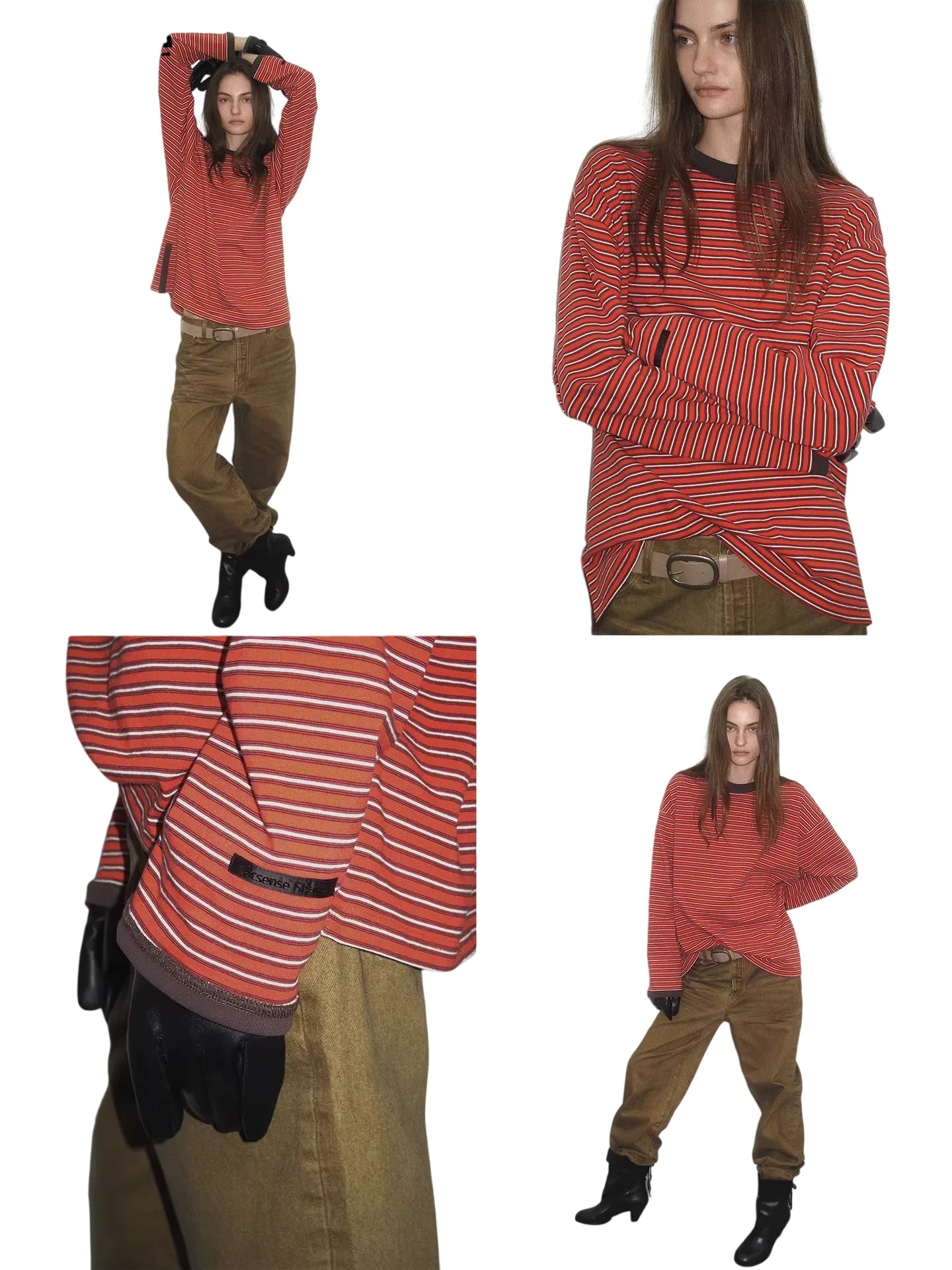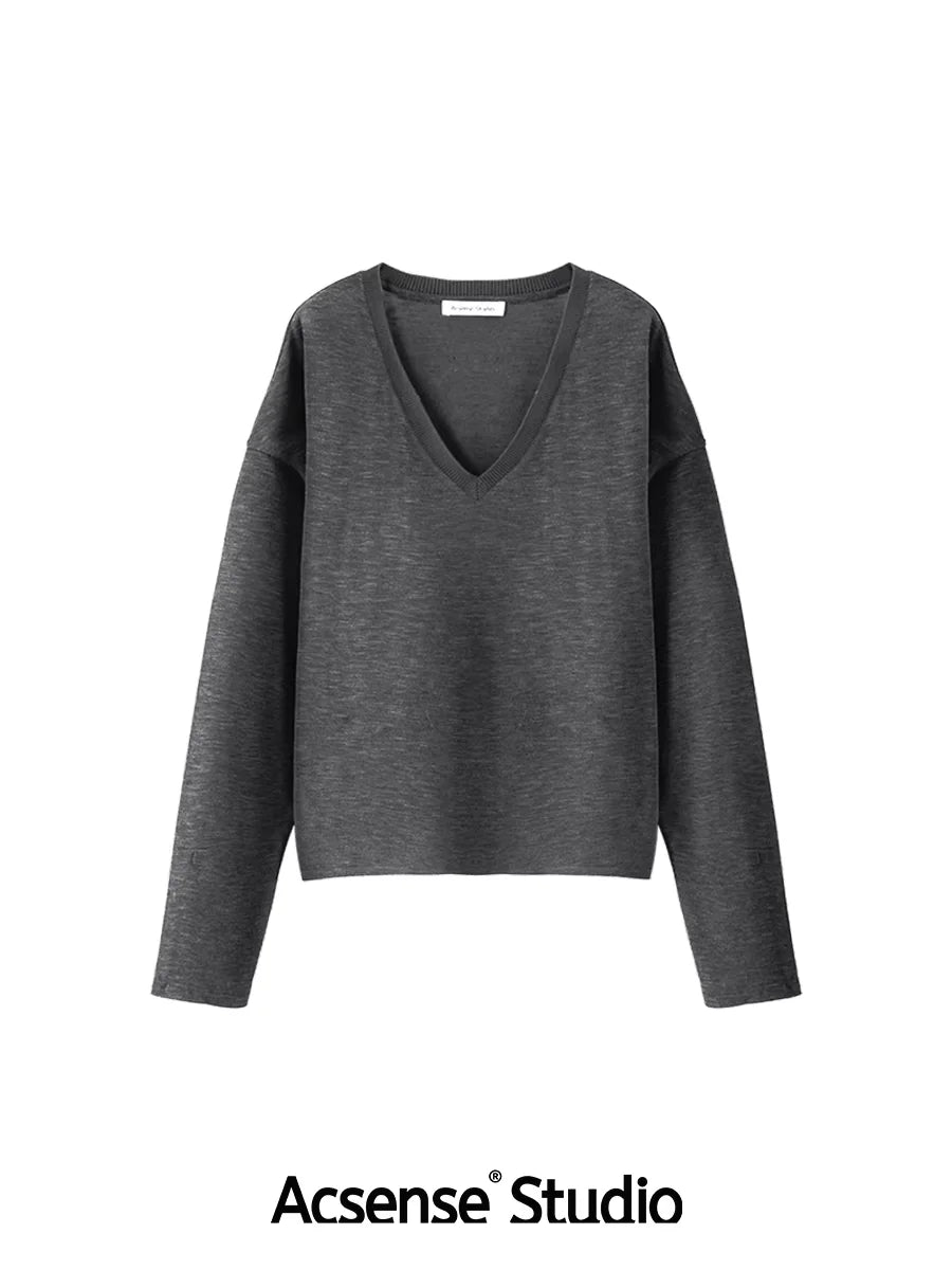 ACSENSE STUDIO Relaxed V-Neck Long Sleeve Striped and Solid Top