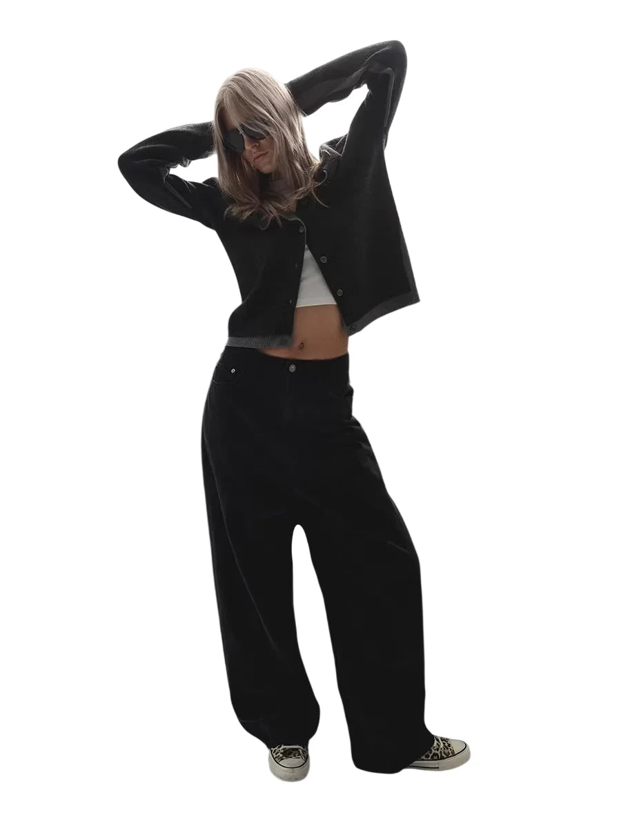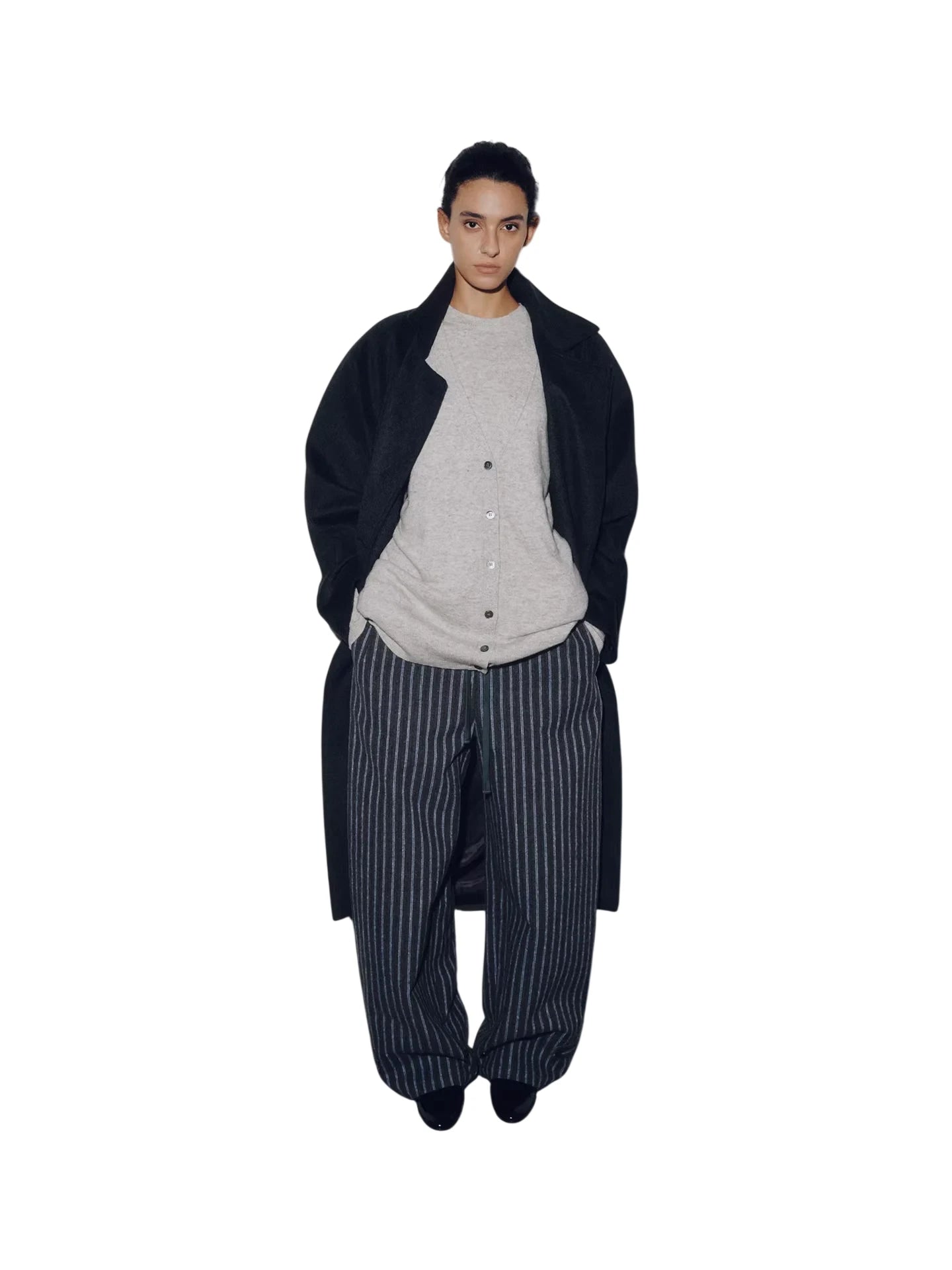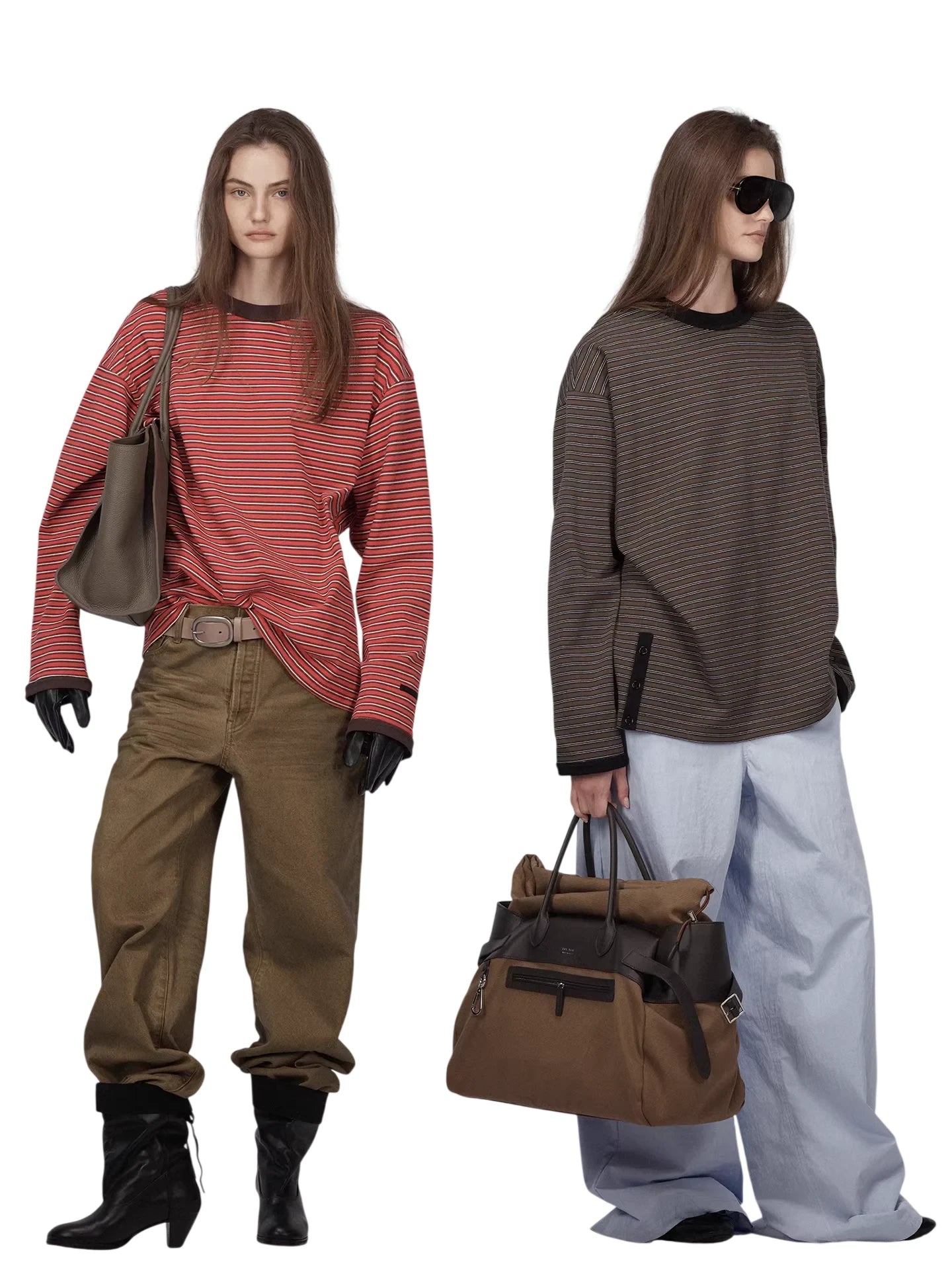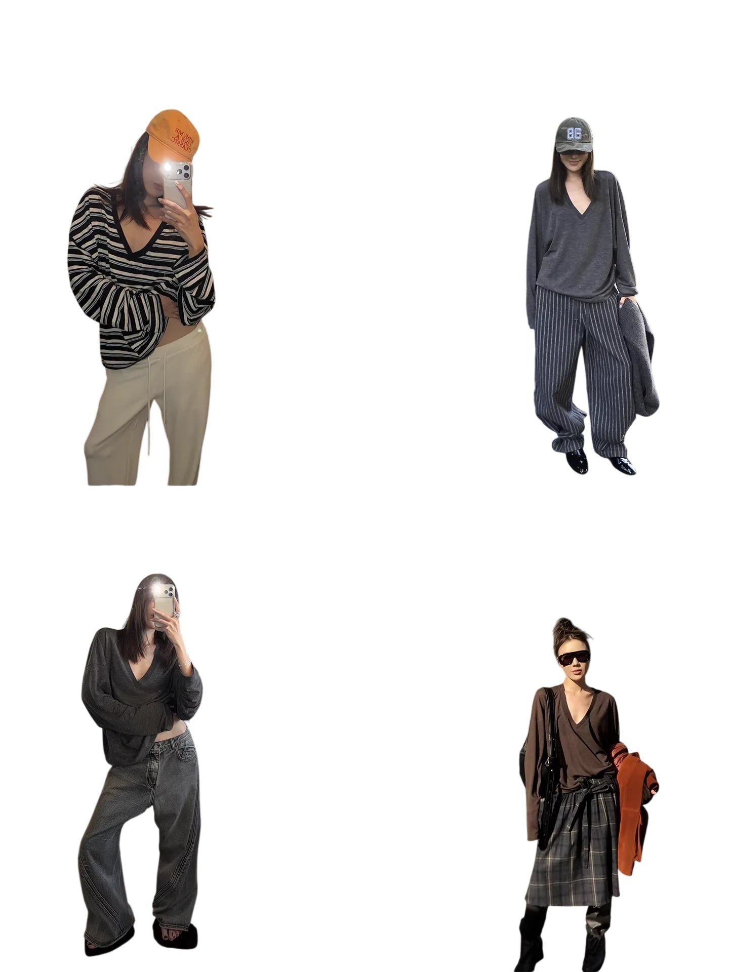 ACSENSE STUDIO Relaxed V-Neck Long Sleeve Striped and Solid Top