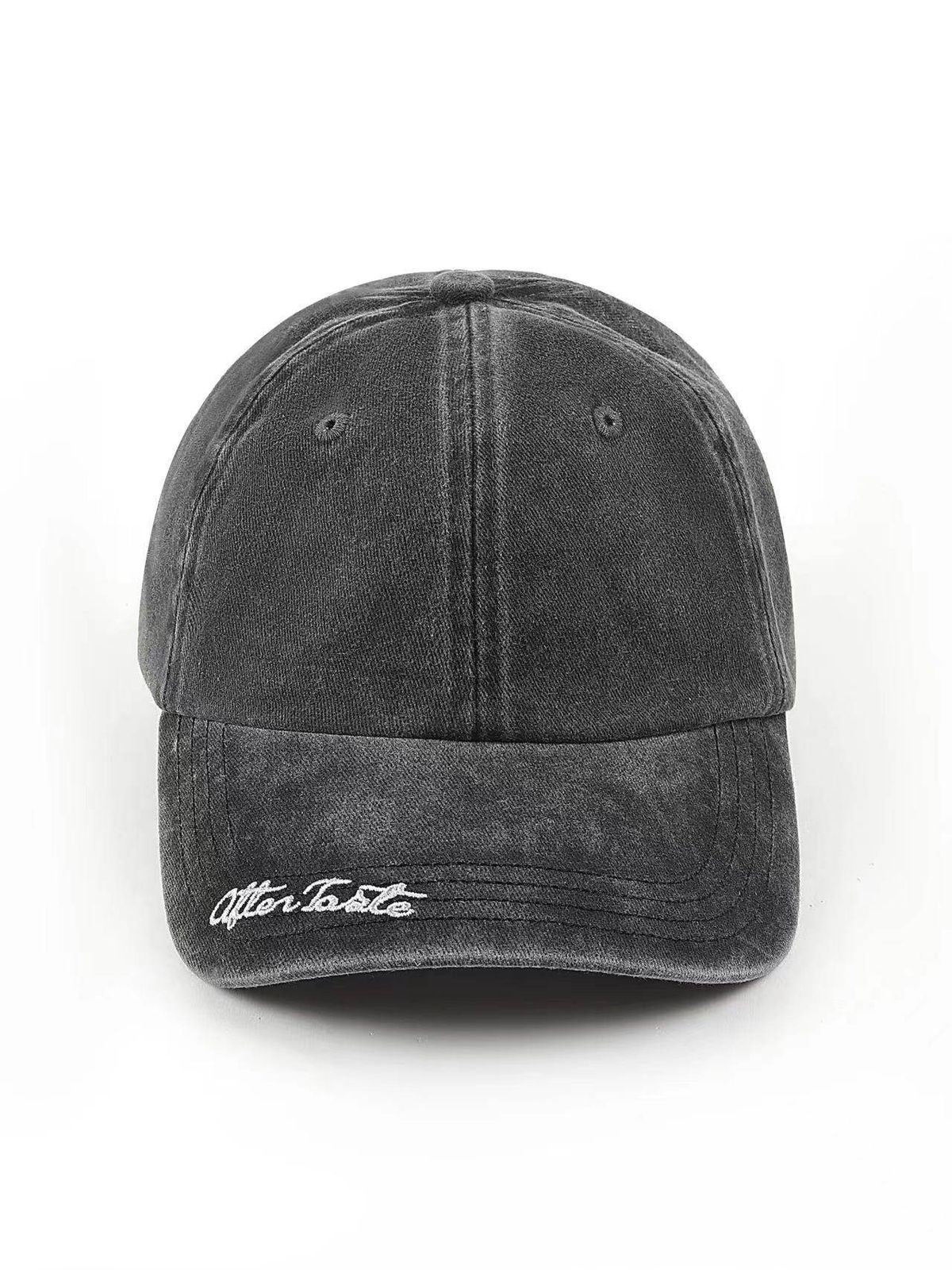 AFterTaste's baseball cap in a washed black finish. Six-panel construction, curved brim, script logo embroidery on the visor.
