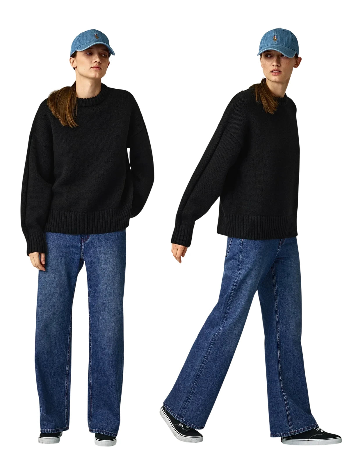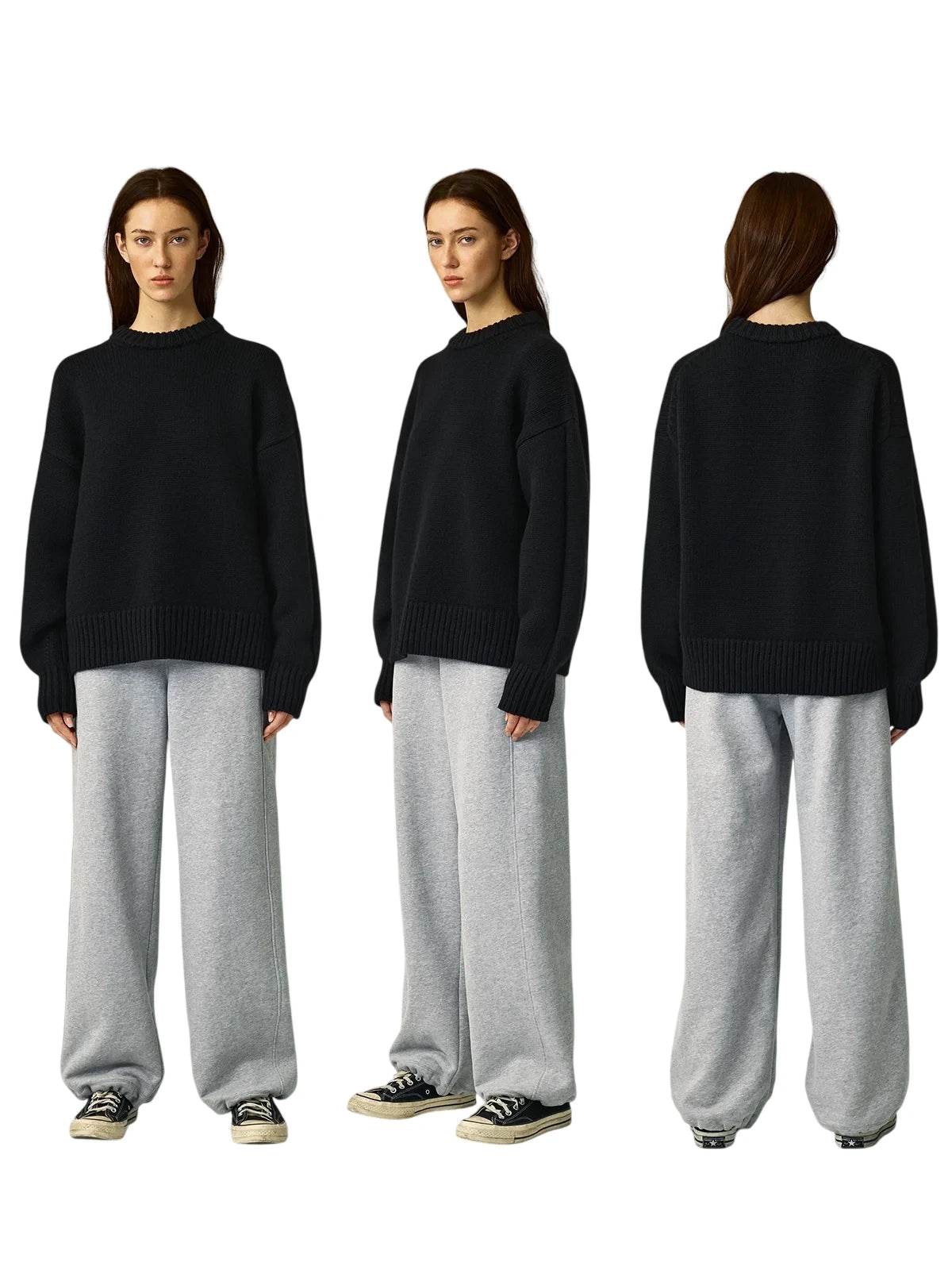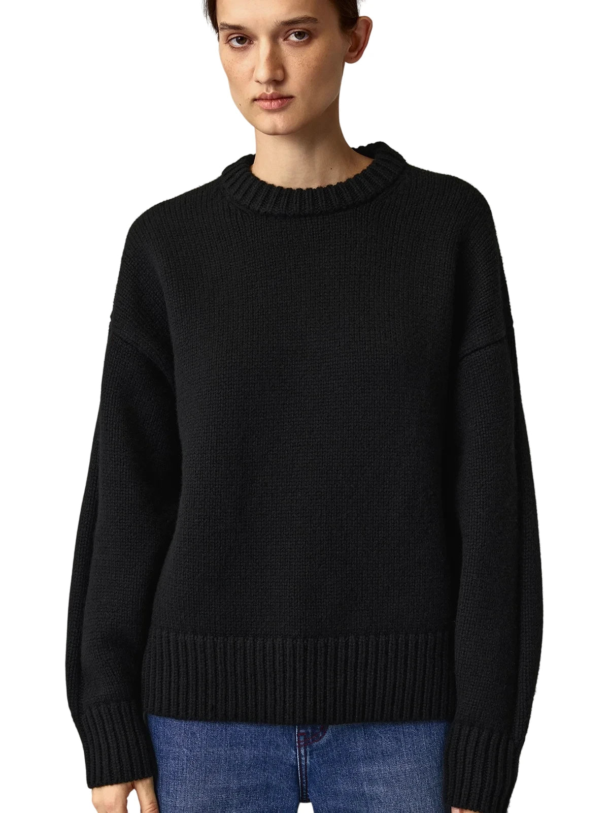 This women's oversized pullover sweater is crafted from 100% wool for a soft and cozy feel. Featuring a chunky double ribbed crew neckline, dropped shoulders, and long sleeves with ribbed cuffs, it delivers both warmth and relaxed style. The ribbed hem adds to its laid-back silhouette, making it a perfect choice for comfortable everyday wear.