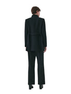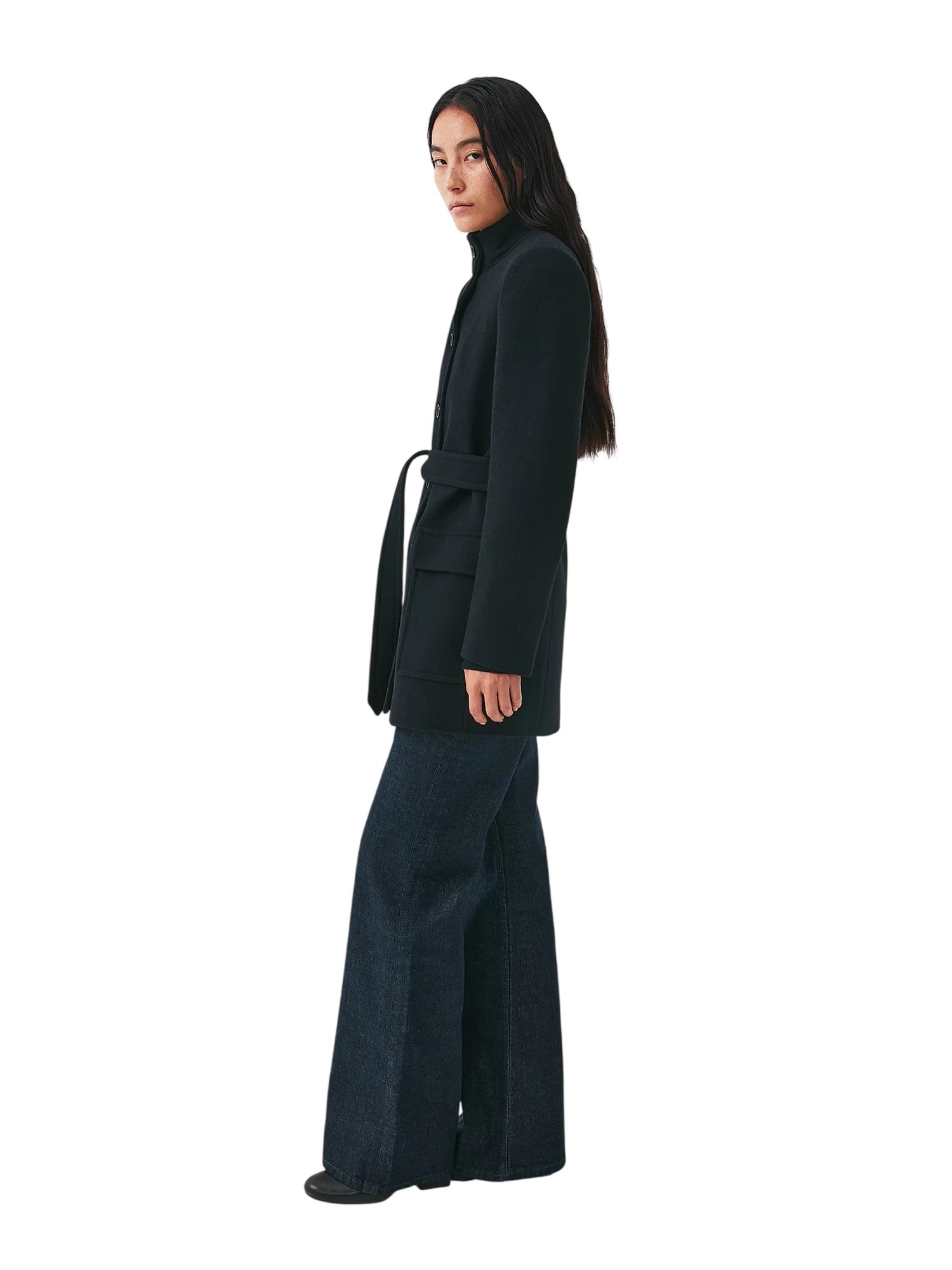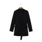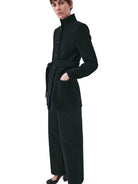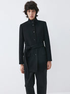 Elevate your outerwear collection with this sleek black woolen coat designed for women. Featuring a refined stand collar and a slim fit silhouette, this mid-length coat blends modern minimalism with classic tailoring. The design is enhanced by a matching tie belt that cinches the waist for a flattering shape, along with long sleeves and two front pockets, including one flap-style pocket for visual interest. Perfect for sophisticated, cold-weather styling.