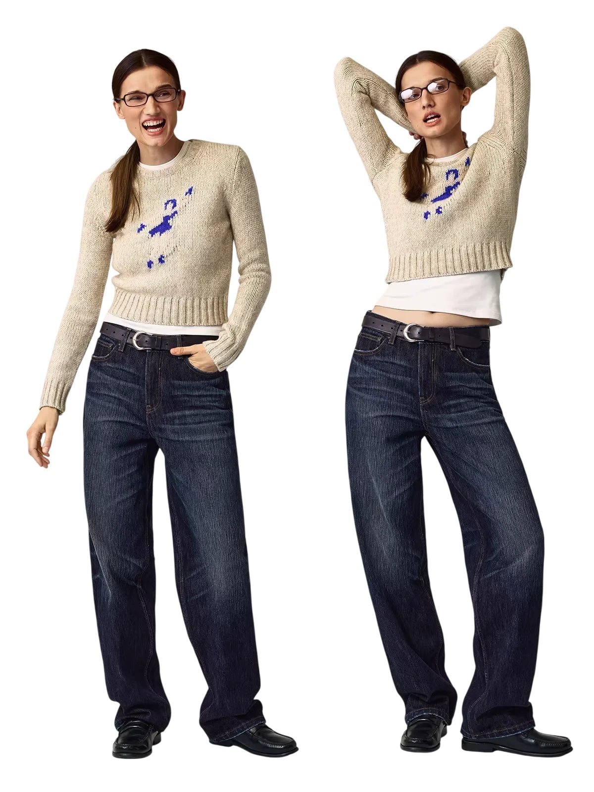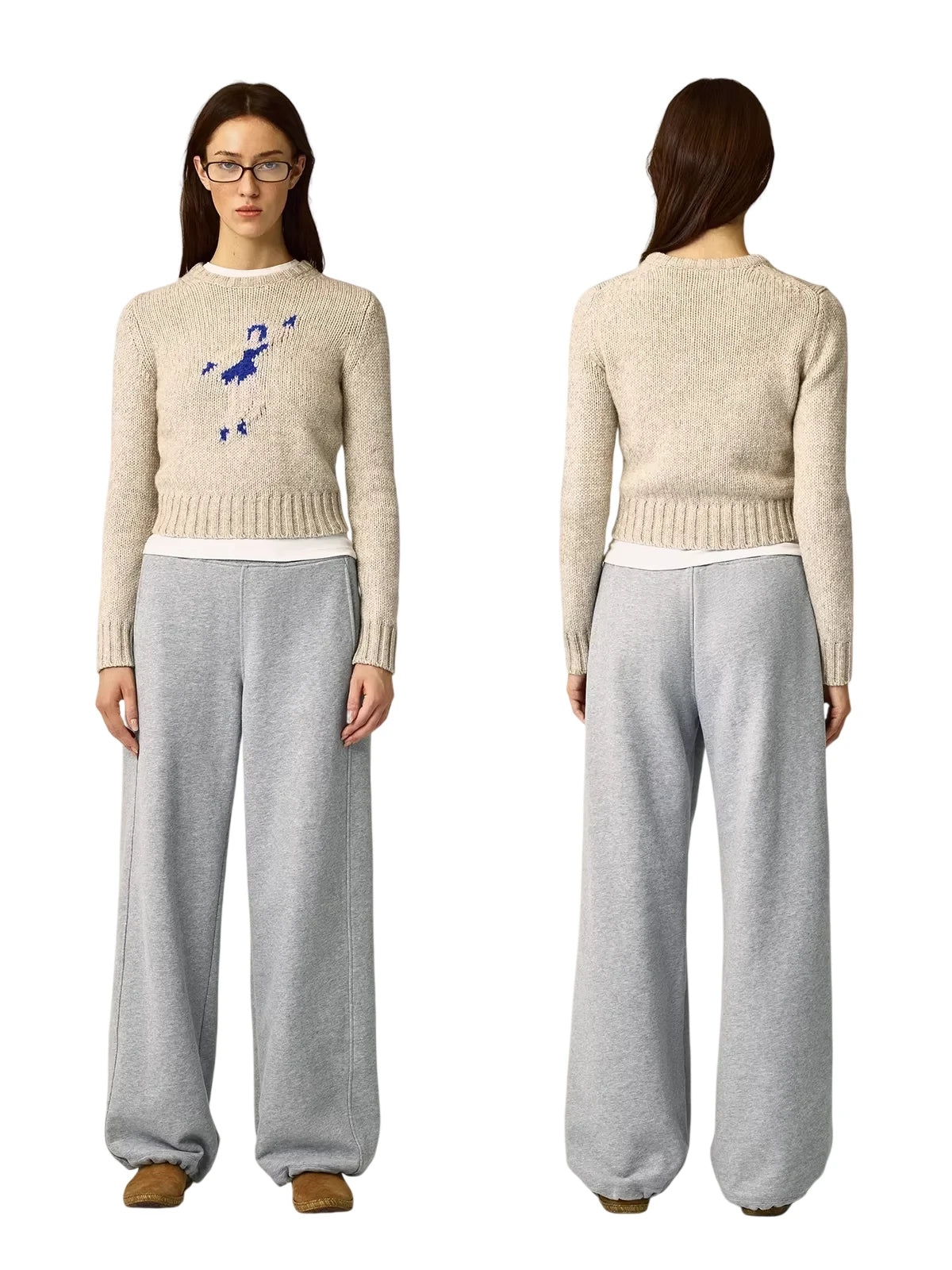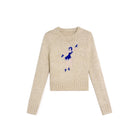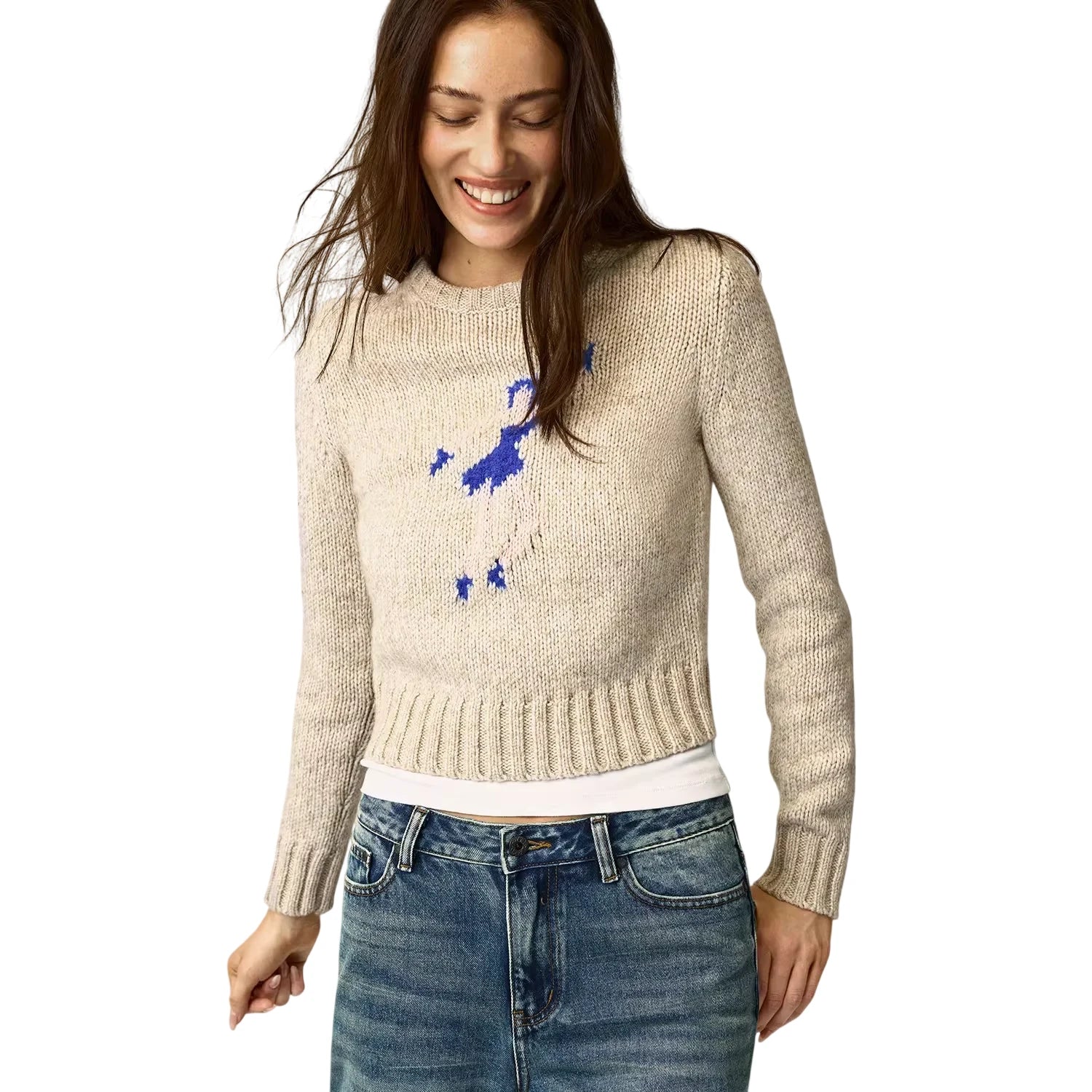 This women's chunky knit pullover sweater features a straight-cut, fitted silhouette with broad shoulders. Designed in a soft beige tone, it includes a striking blue abstract jacquard graphic at the chest. The cropped length adds a modern touch, styled with ribbed hems and cuffs for added texture. Perfect for casual wear, it layers effortlessly over a tank top or t-shirt.