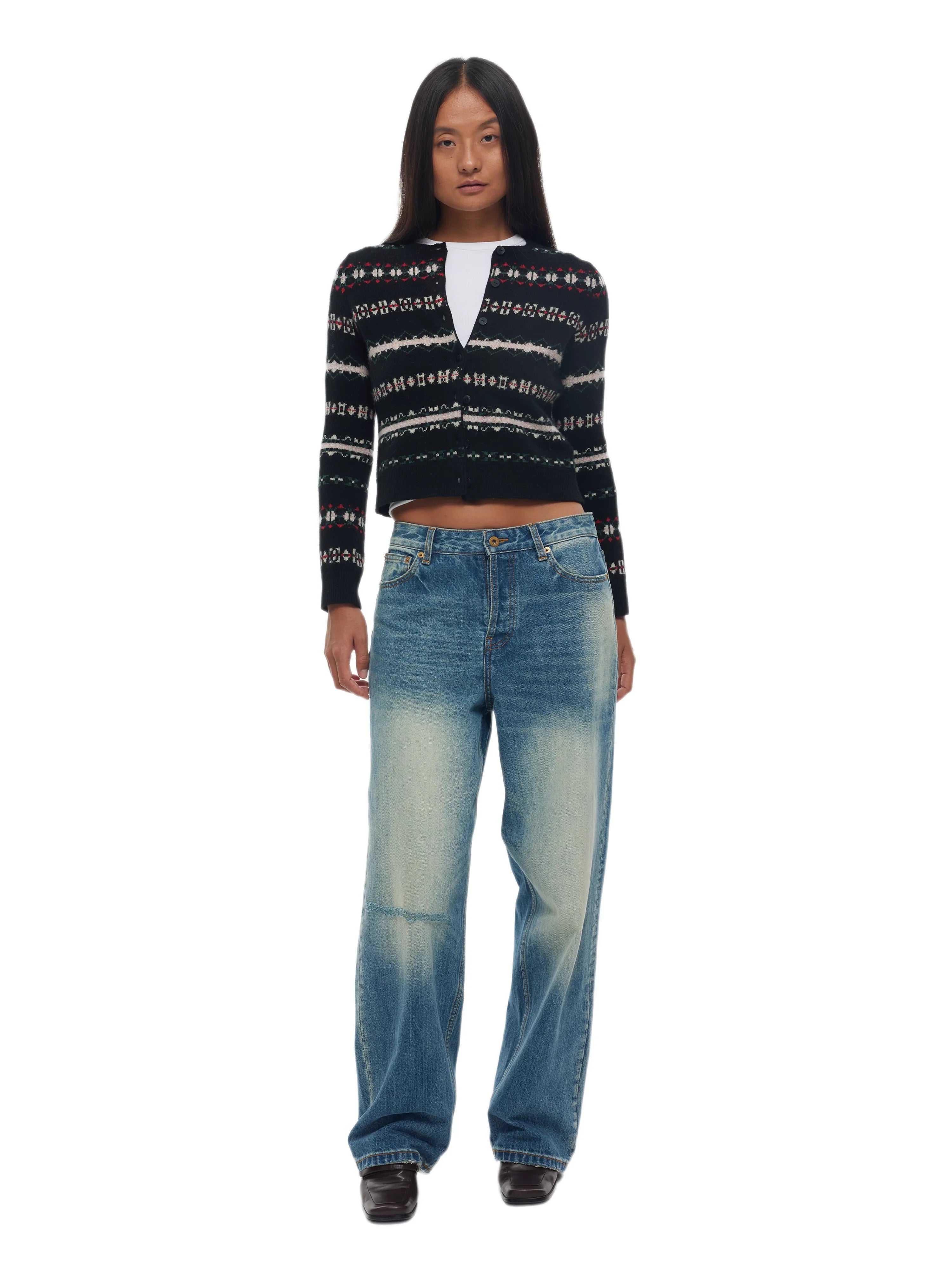 This women's knit cardigan features a cozy Icelandic-inspired design, perfect for colder seasons. Crafted in a dark base color, it showcases festive fair isle motifs in red, white, green, and gray across the entire garment. The cardigan includes a round neckline, long sleeves, and a button-up front, with a ribbed hem that sits comfortably at the waist. Ideal for casual wear, it pairs effortlessly with jeans for a relaxed winter look.