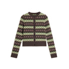 This women's long-sleeve cardigan is crafted from 100% wool and features a charming jacquard knit design. Decorated with whimsical sheep and heart motifs in contrasting horizontal stripes, the cardigan is offered in two eye-catching two-tone variations — one with a cream base and the other in a rich brown. Designed with a fitted, straight-shoulder silhouette, it is finished with a ribbed hem and gold-tone button closure. This versatile piece pairs effortlessly with wide-legged or light-washed denim for a cozy, casual look.